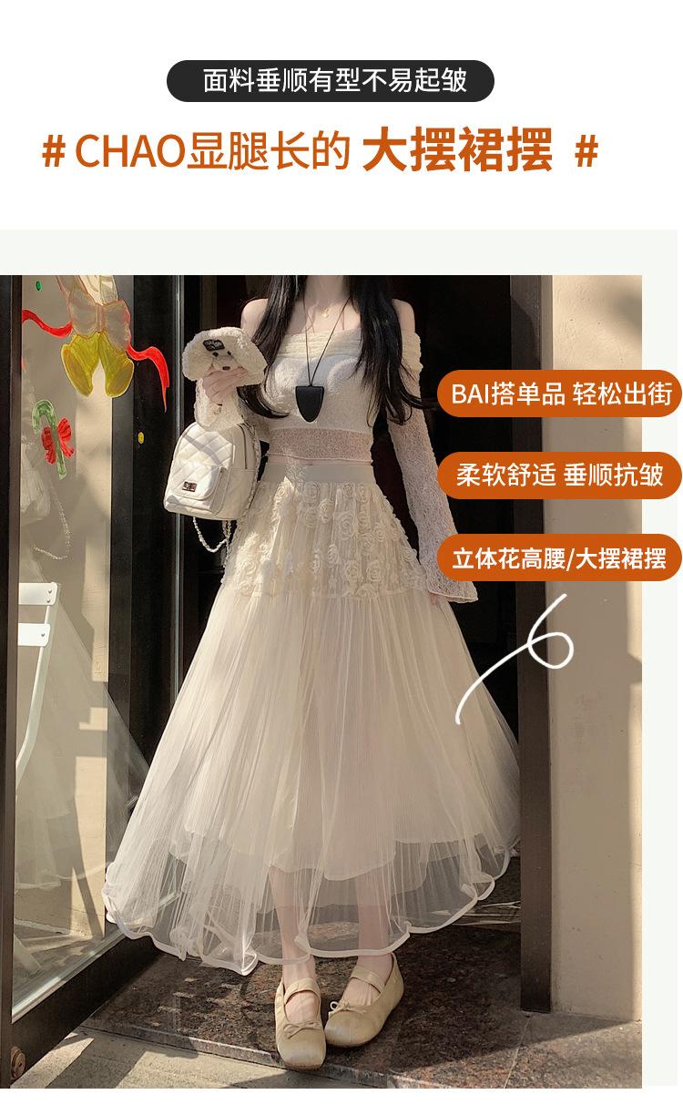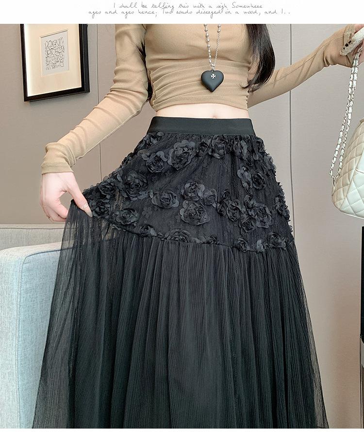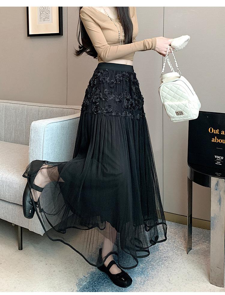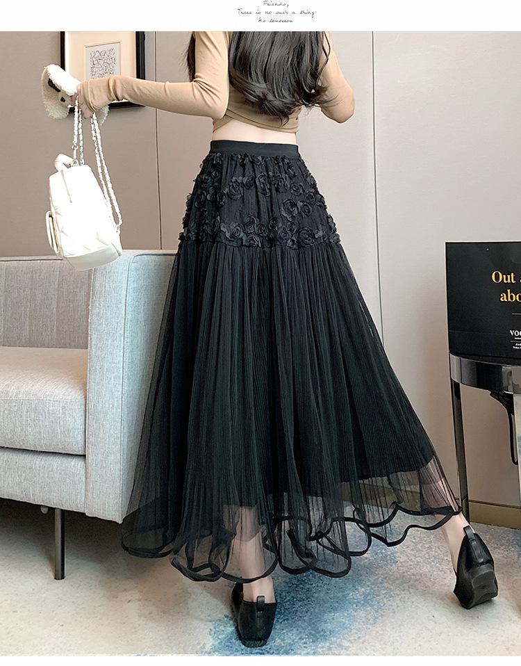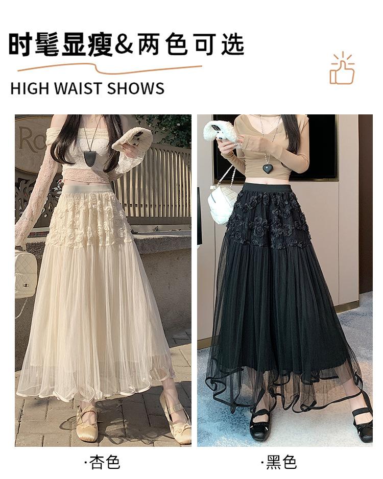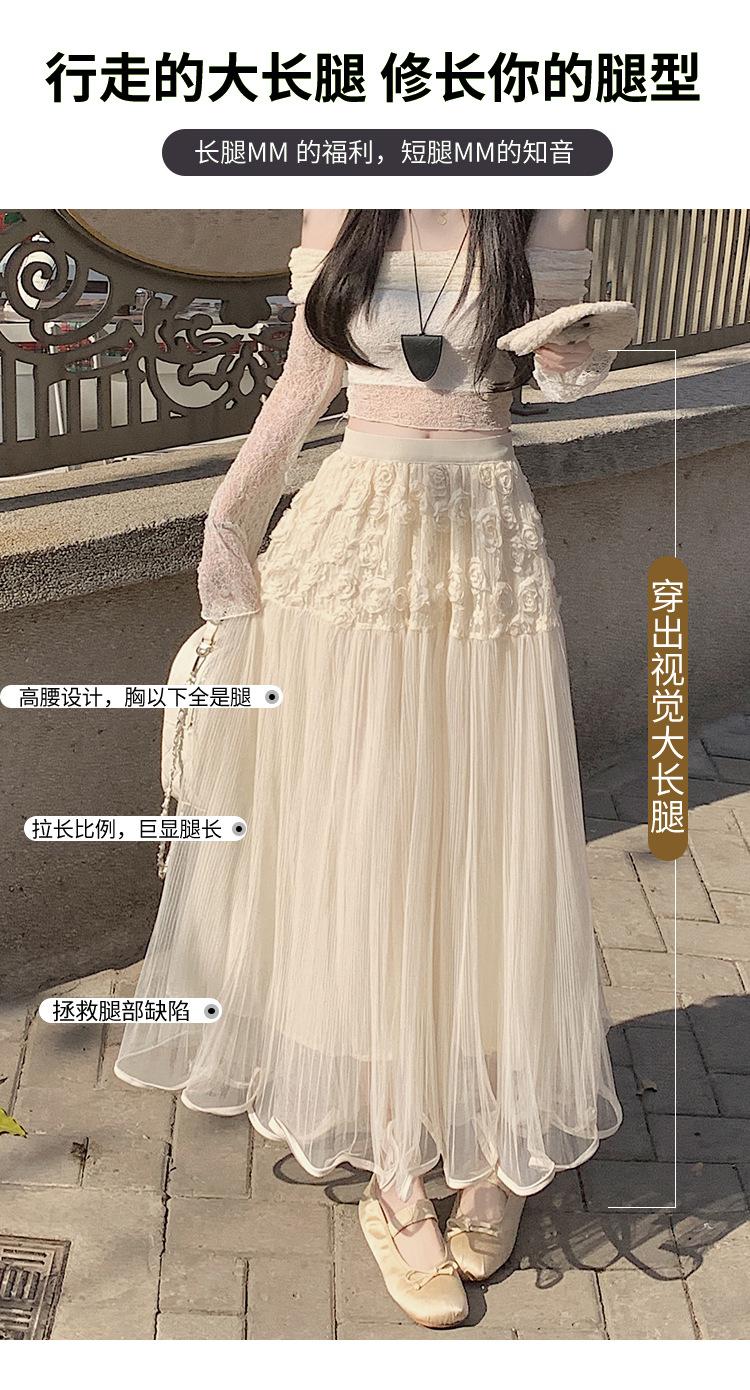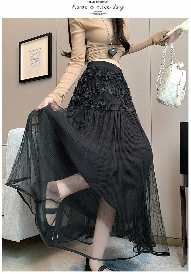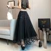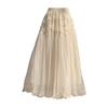 Falda de Malla con Flores Diseño Estilo Francés para Mujer Primavera y Verano 2025 Cintura Alta Adelgazante Línea A Falda Paraguas Falda Plisada Larga