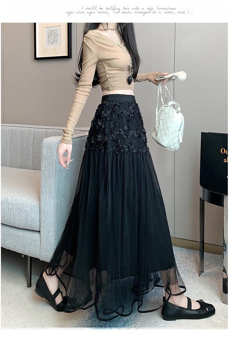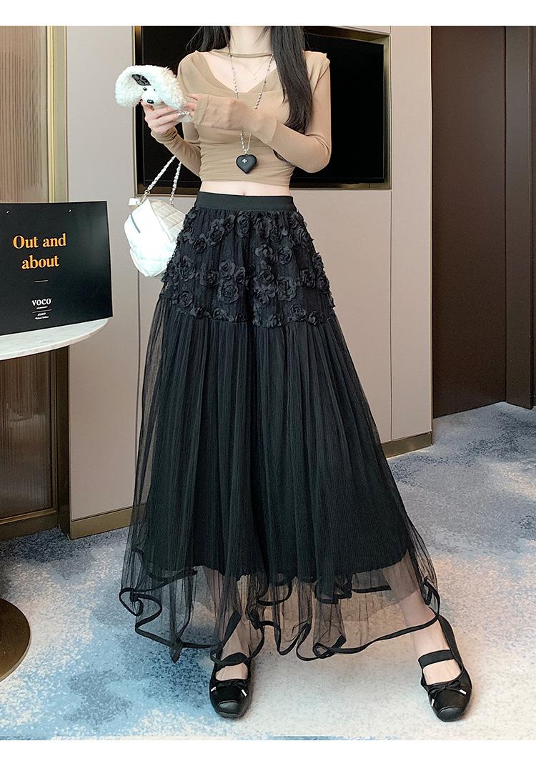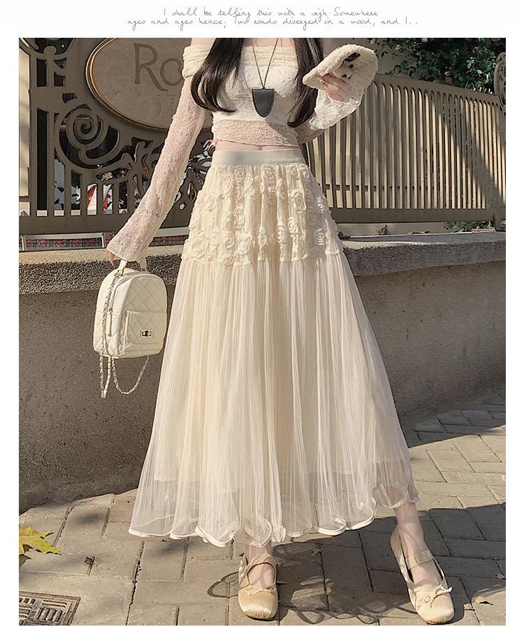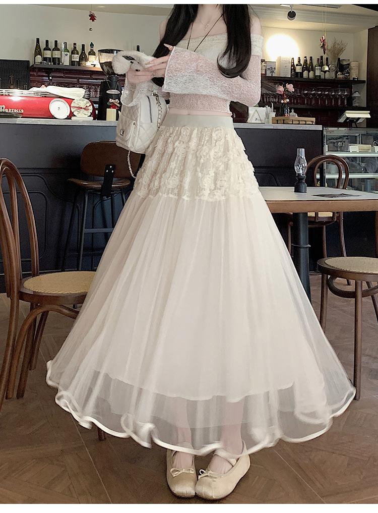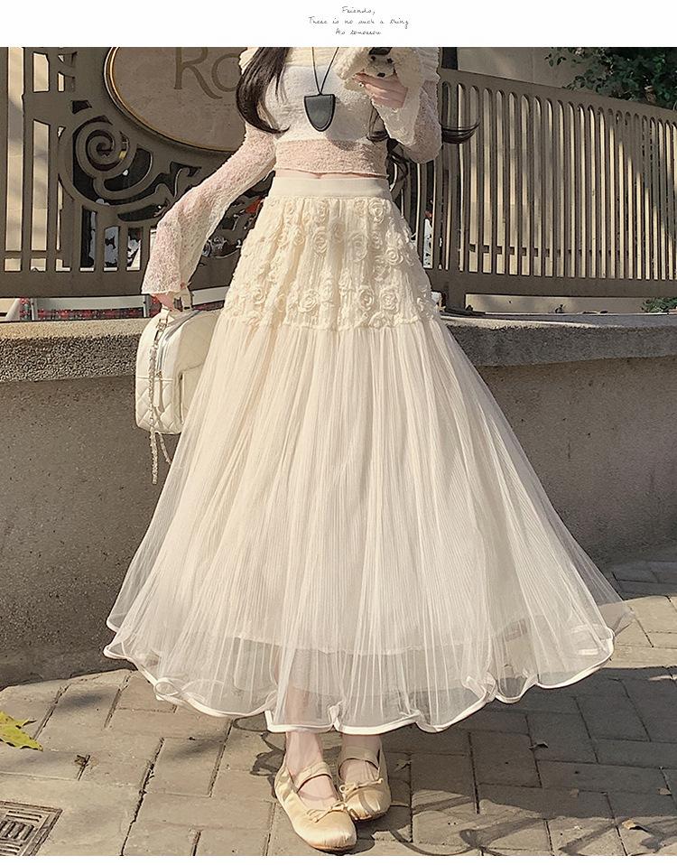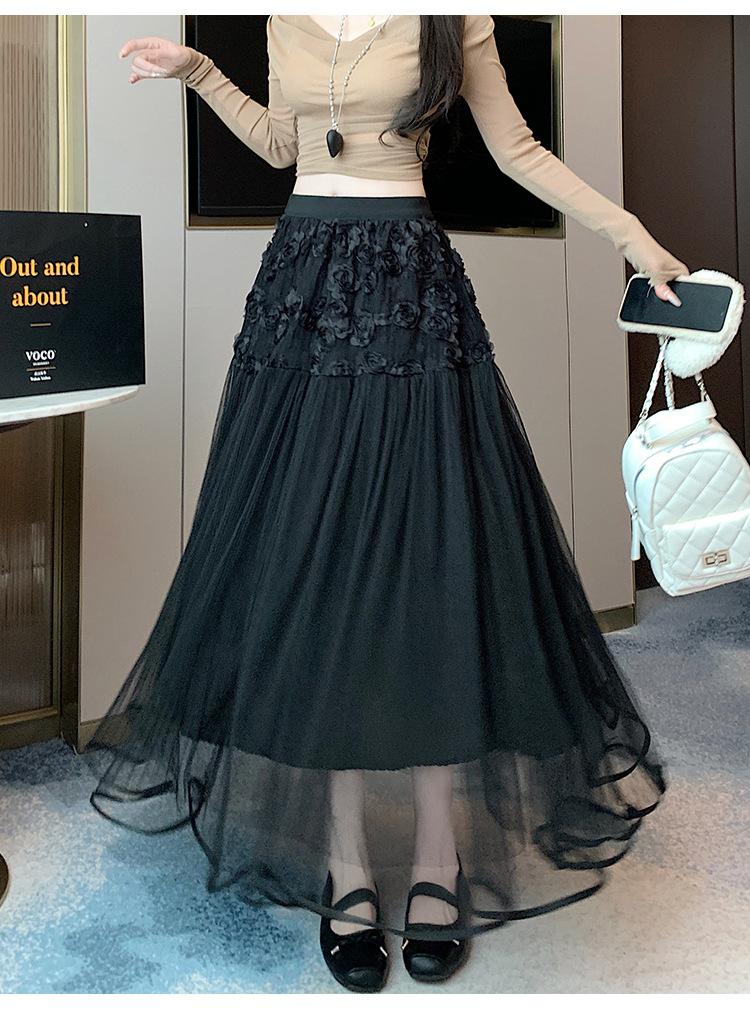 Falda de Malla con Flores Diseño Estilo Francés para Mujer Primavera y Verano 2025 Cintura Alta Adelgazante Línea A Falda Paraguas Falda Plisada Larga