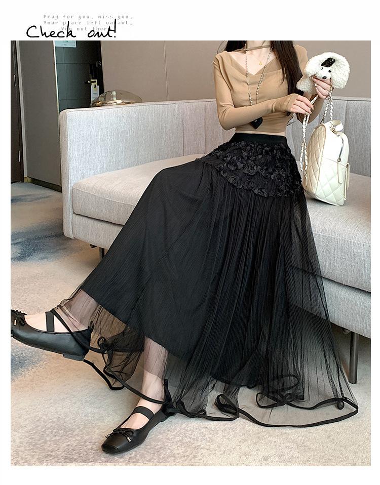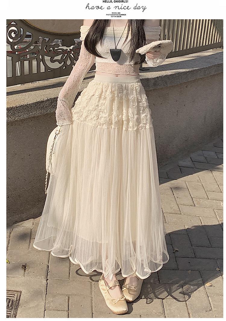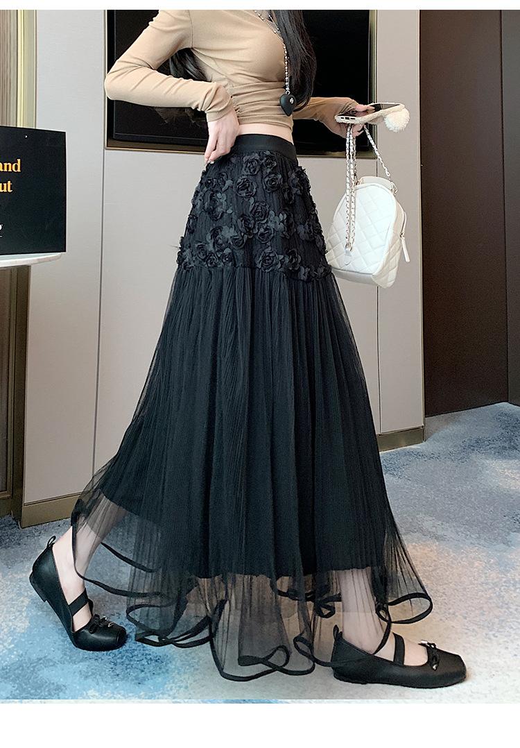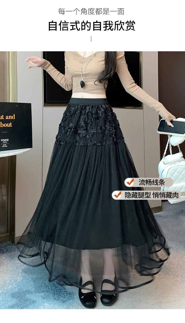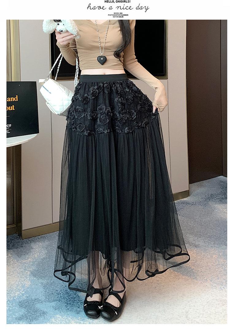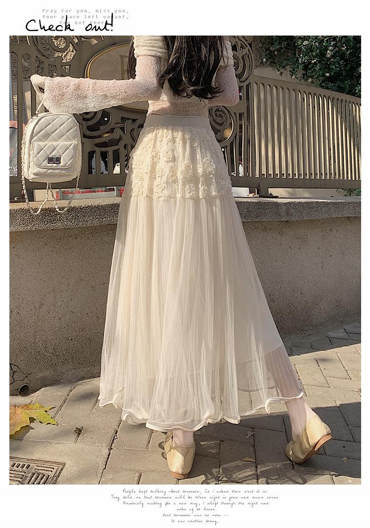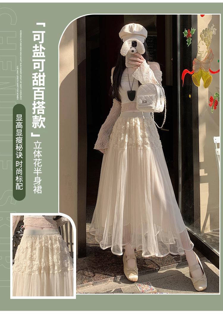 Falda de Malla con Flores Diseño Estilo Francés para Mujer Primavera y Verano 2025 Cintura Alta Adelgazante Línea A Falda Paraguas Falda Plisada Larga
