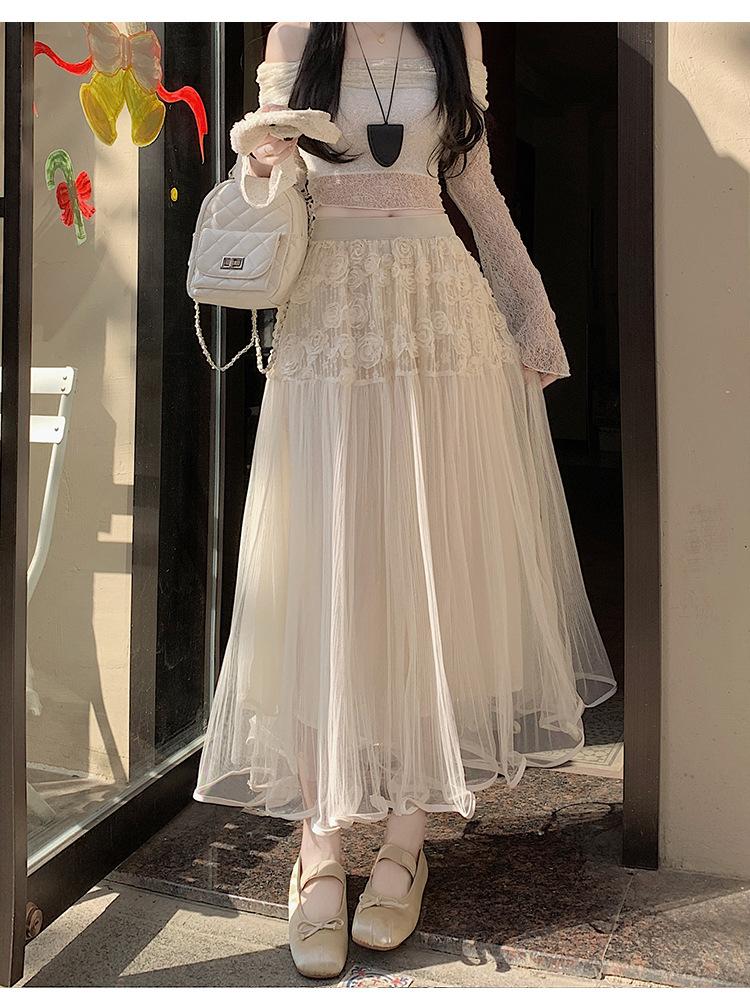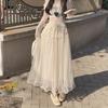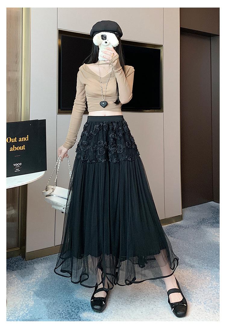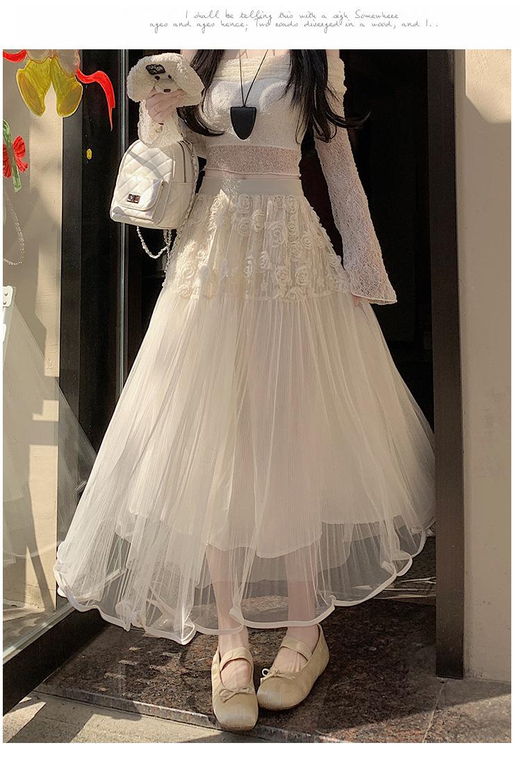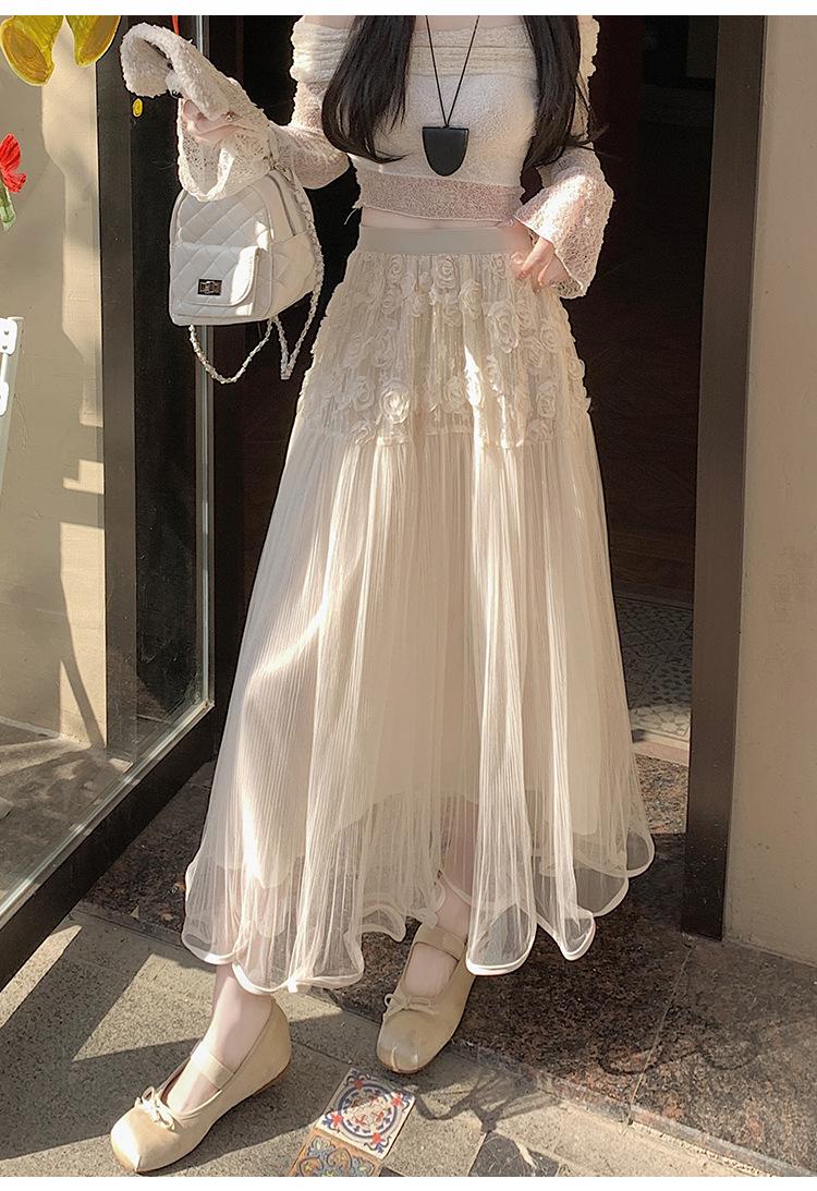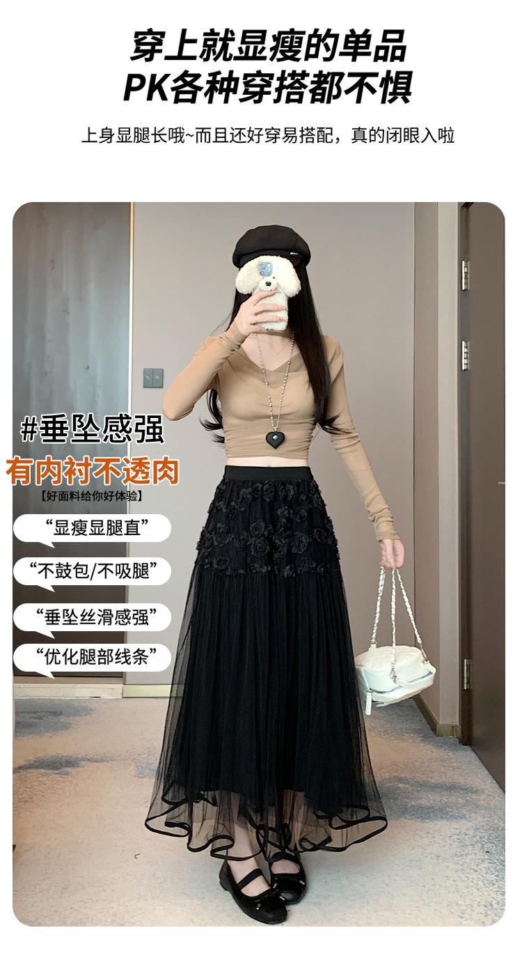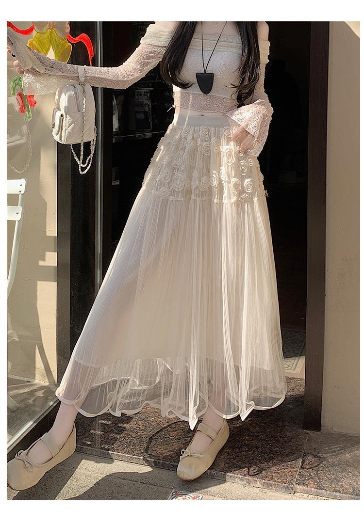Falda de Malla con Flores Diseño Estilo Francés para Mujer Primavera y Verano 2025 Cintura Alta Adelgazante Línea A Falda Paraguas Falda Plisada Larga