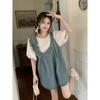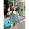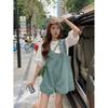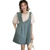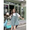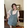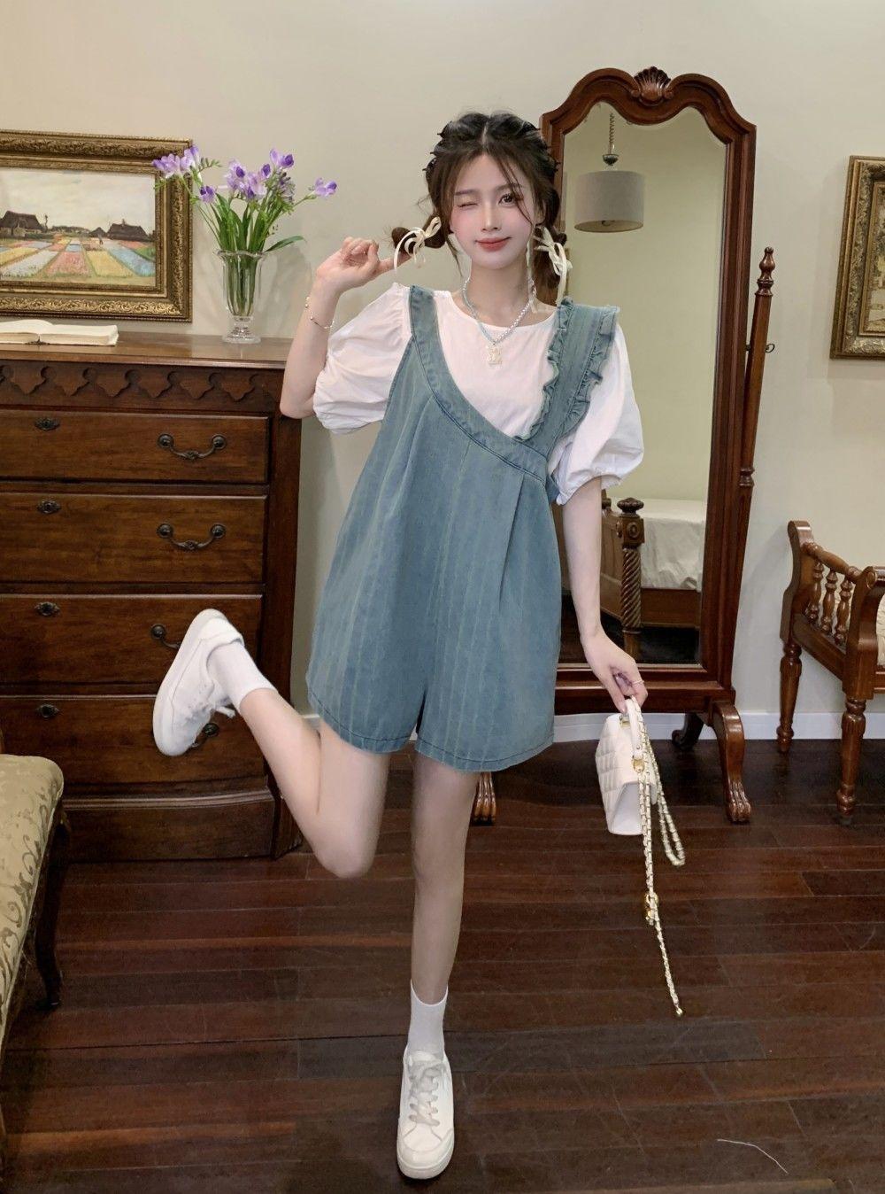 Traje de moda para mujer, soldado, verano, nuevo, dulce, color sólido, camiseta de manga corta, pantalones cortos vaqueros con tirantes irregulares para mujer, moda para mujer