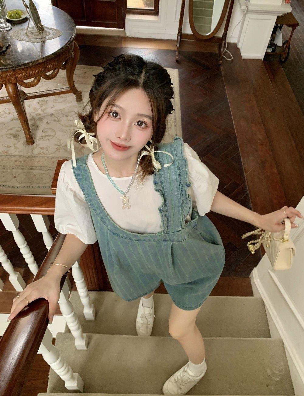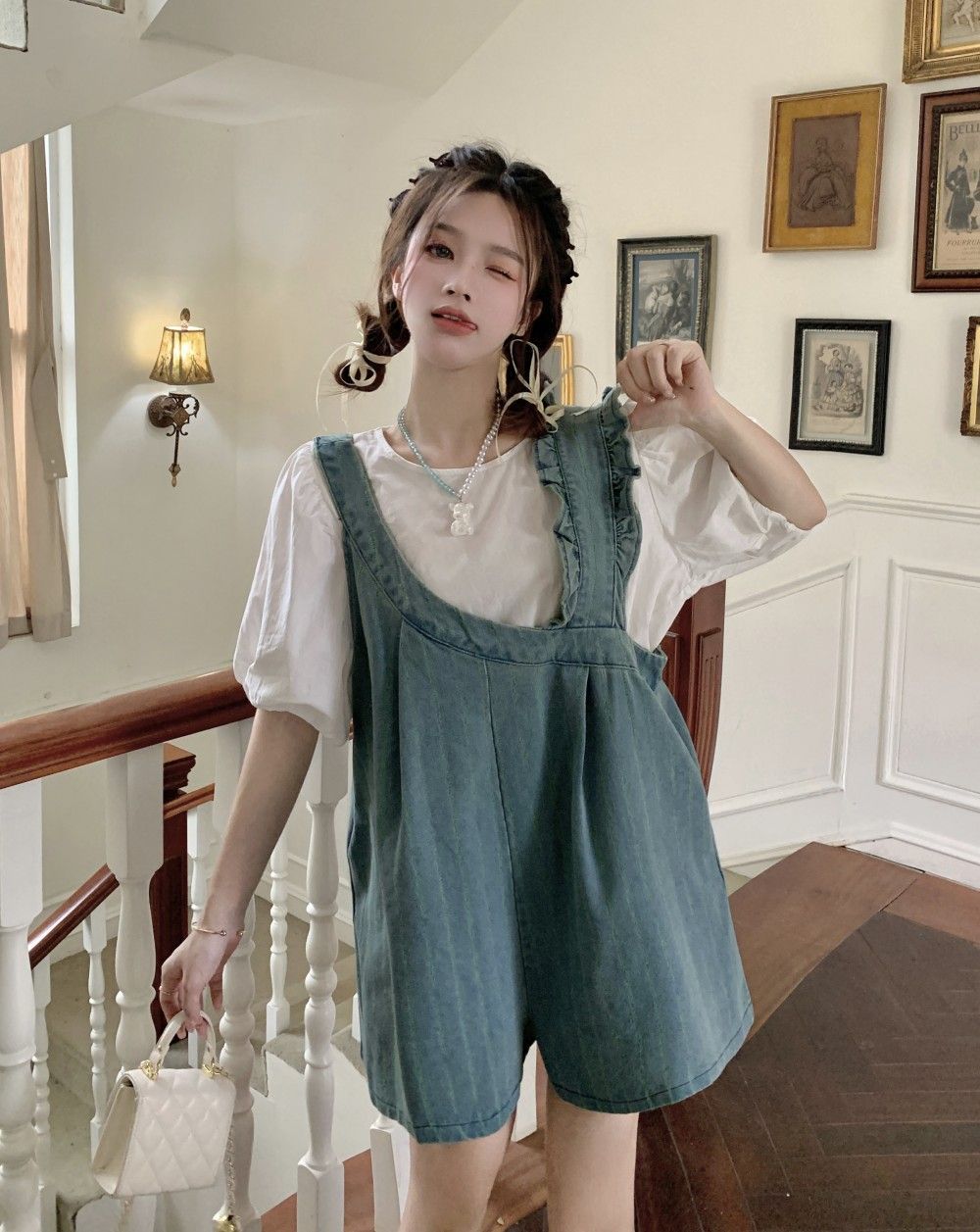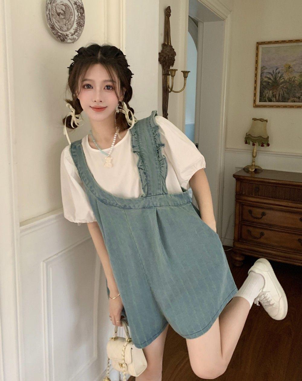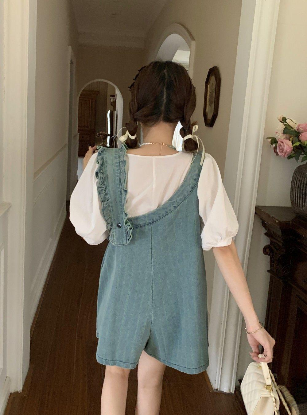 White top [huaduoduo selection] good quality, Denim overalls [huaduoduo selection] good quality, Top + overalls