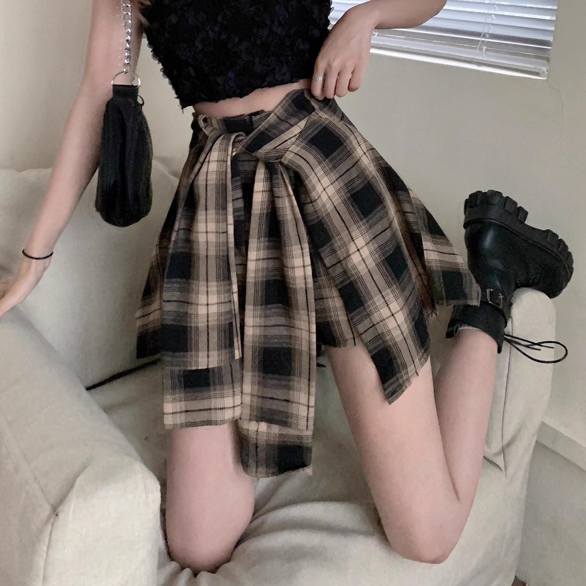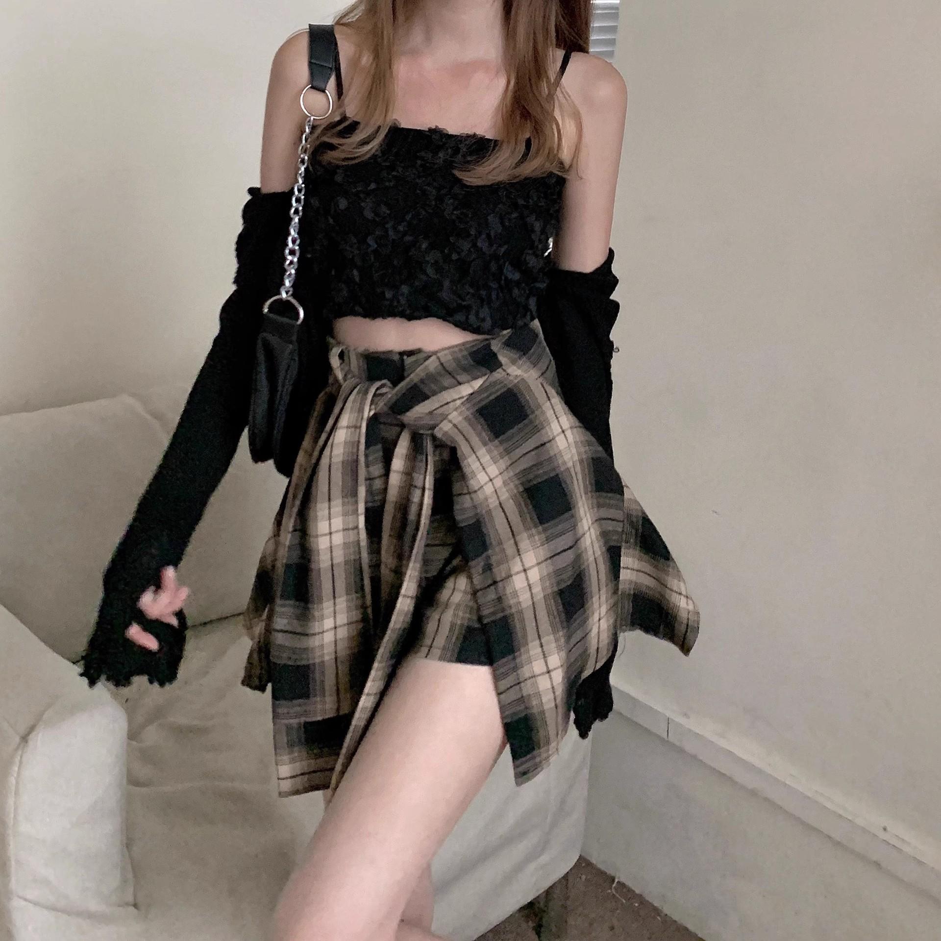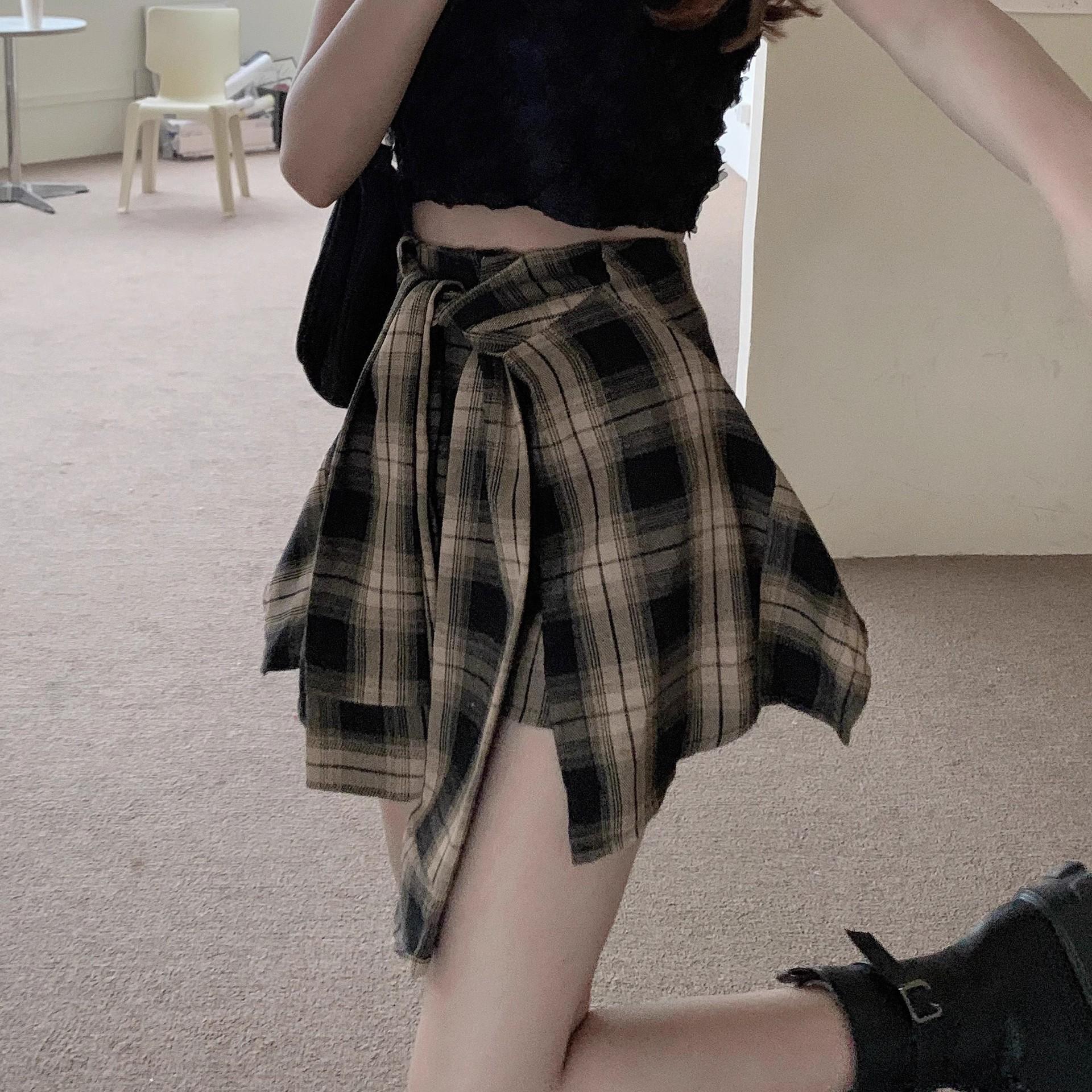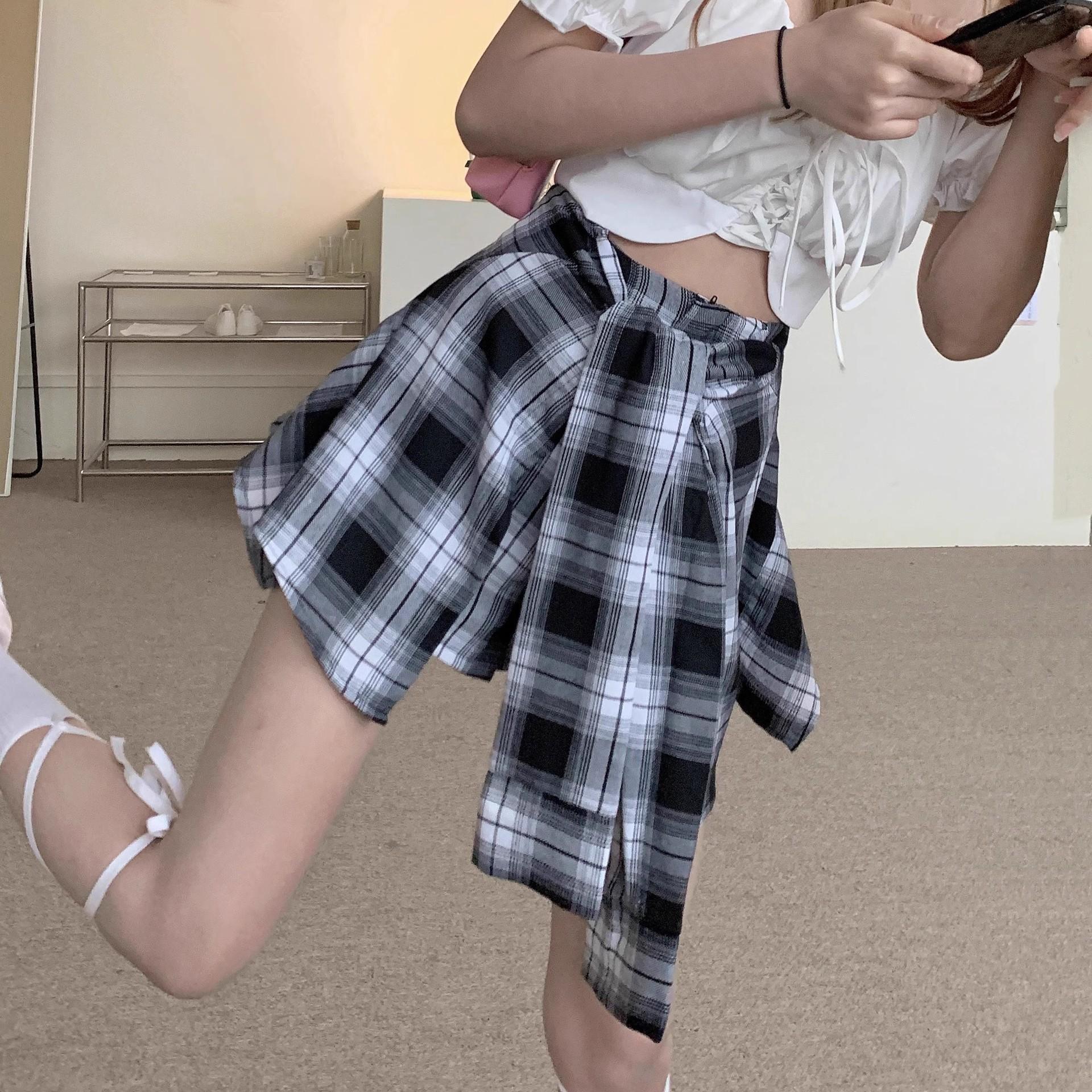 Falda de Cuadros Irregular para Mujer Verano Nuevo Europeo Retro Cintura Alta Chica Hot Reductor de Edad Vacaciones Dos Piezas Shorts Falda