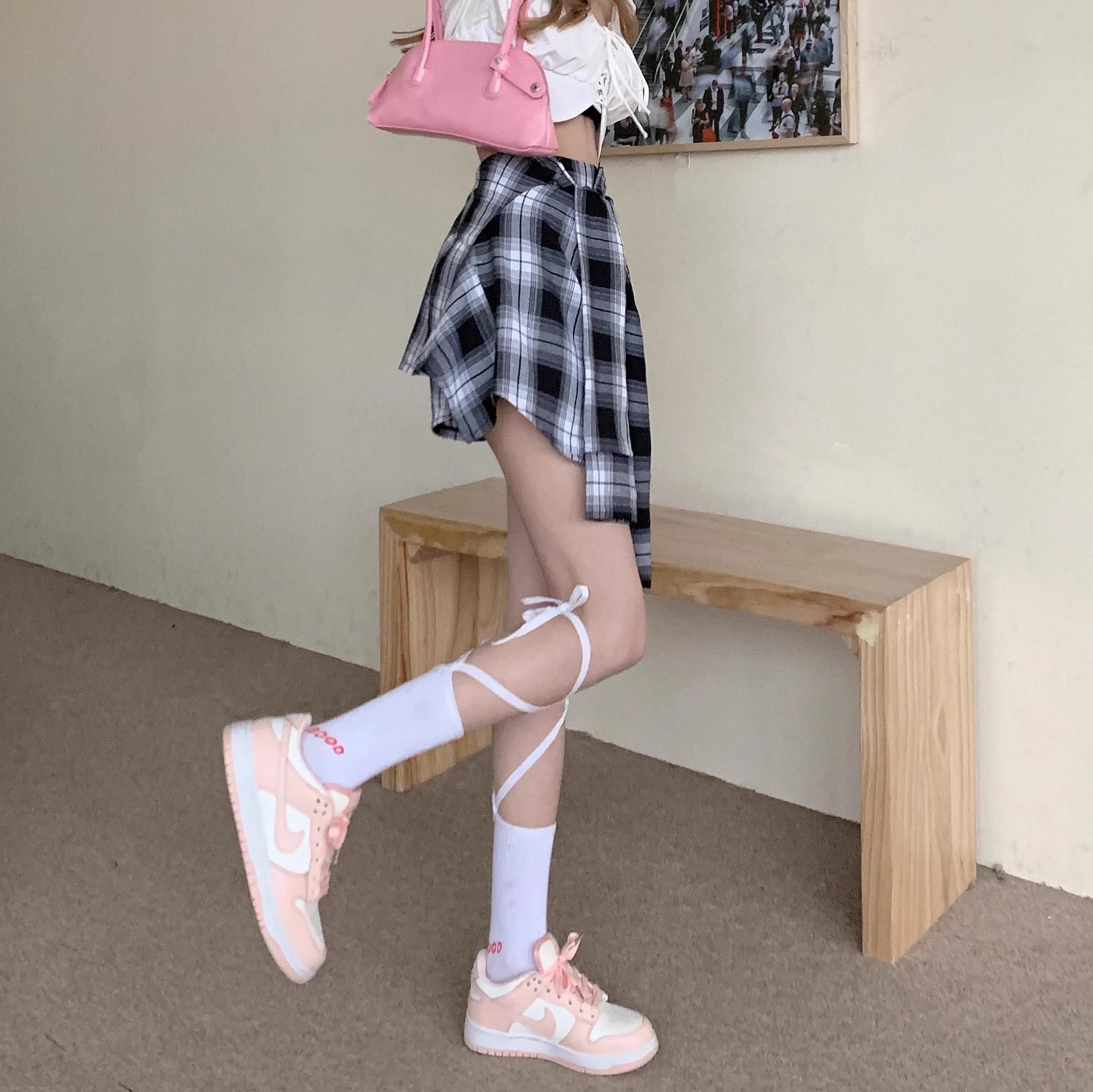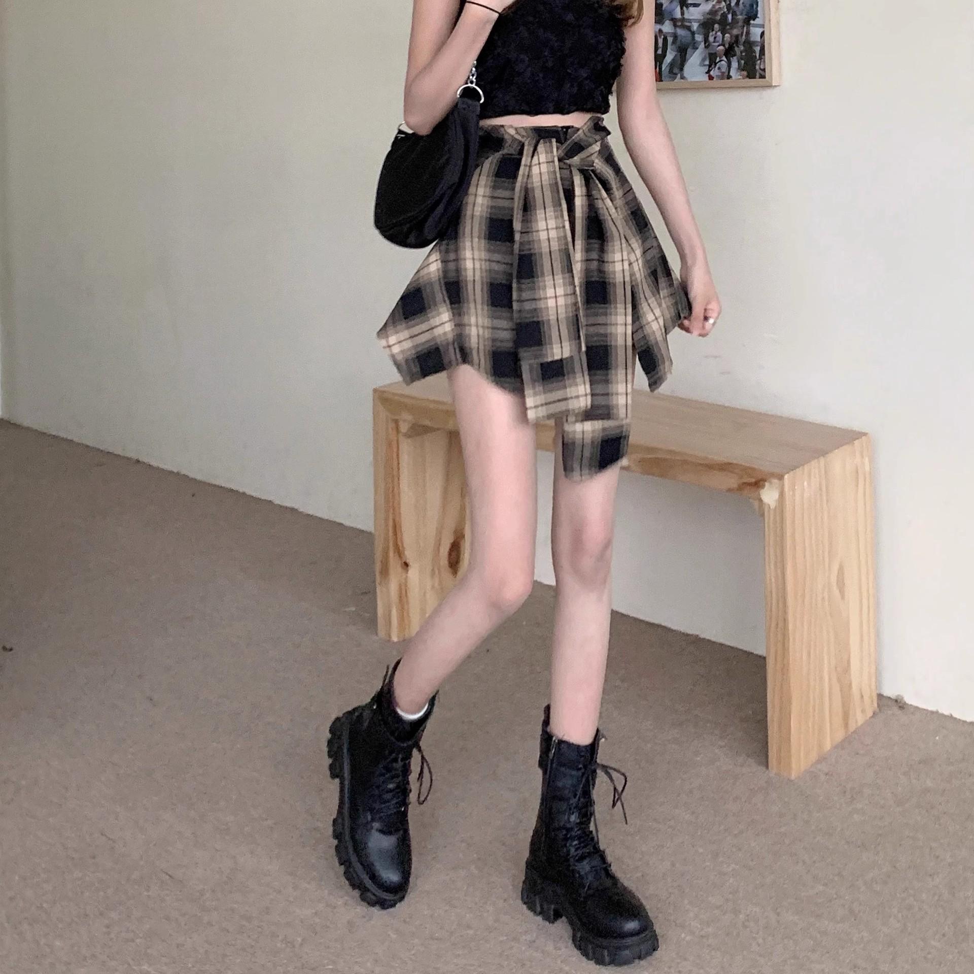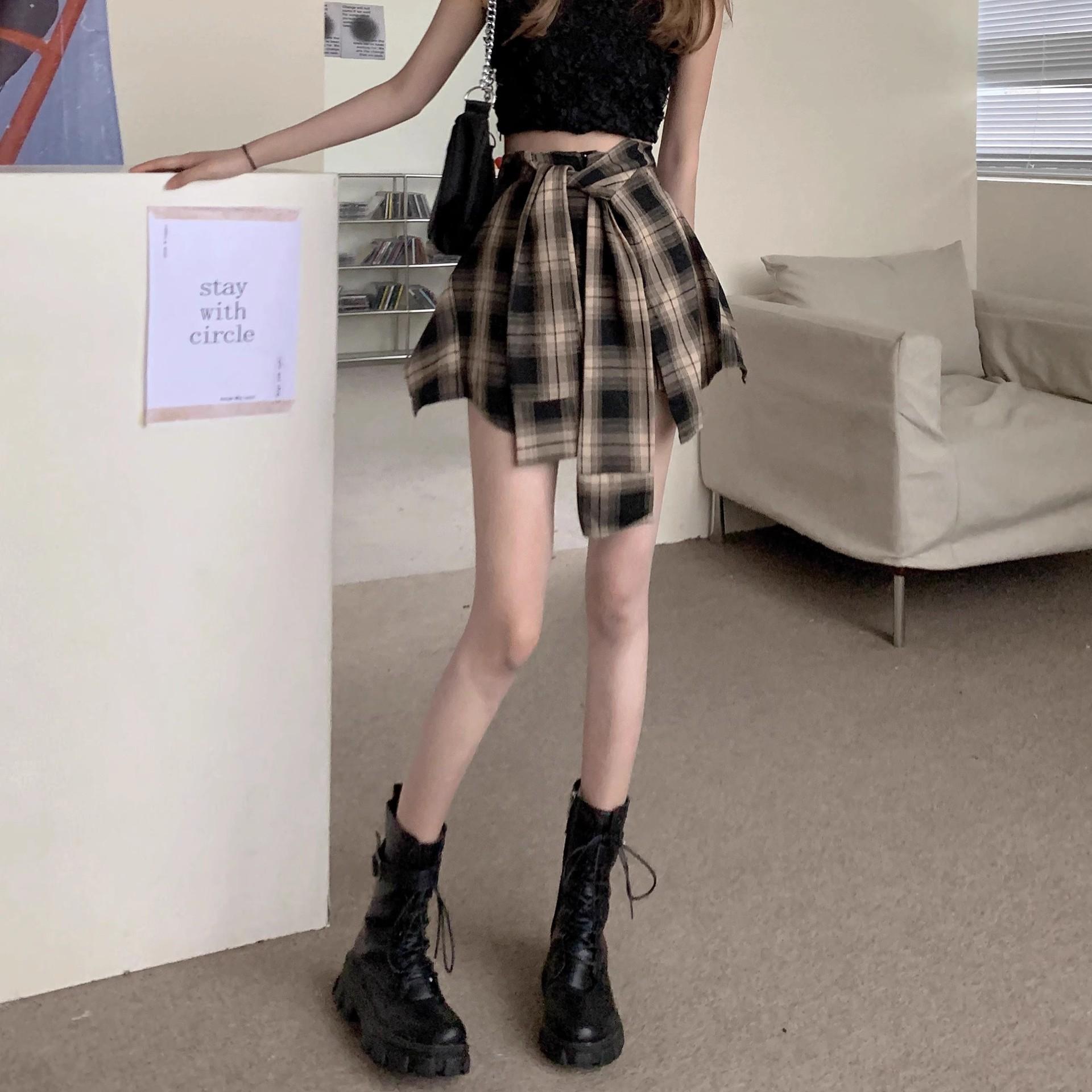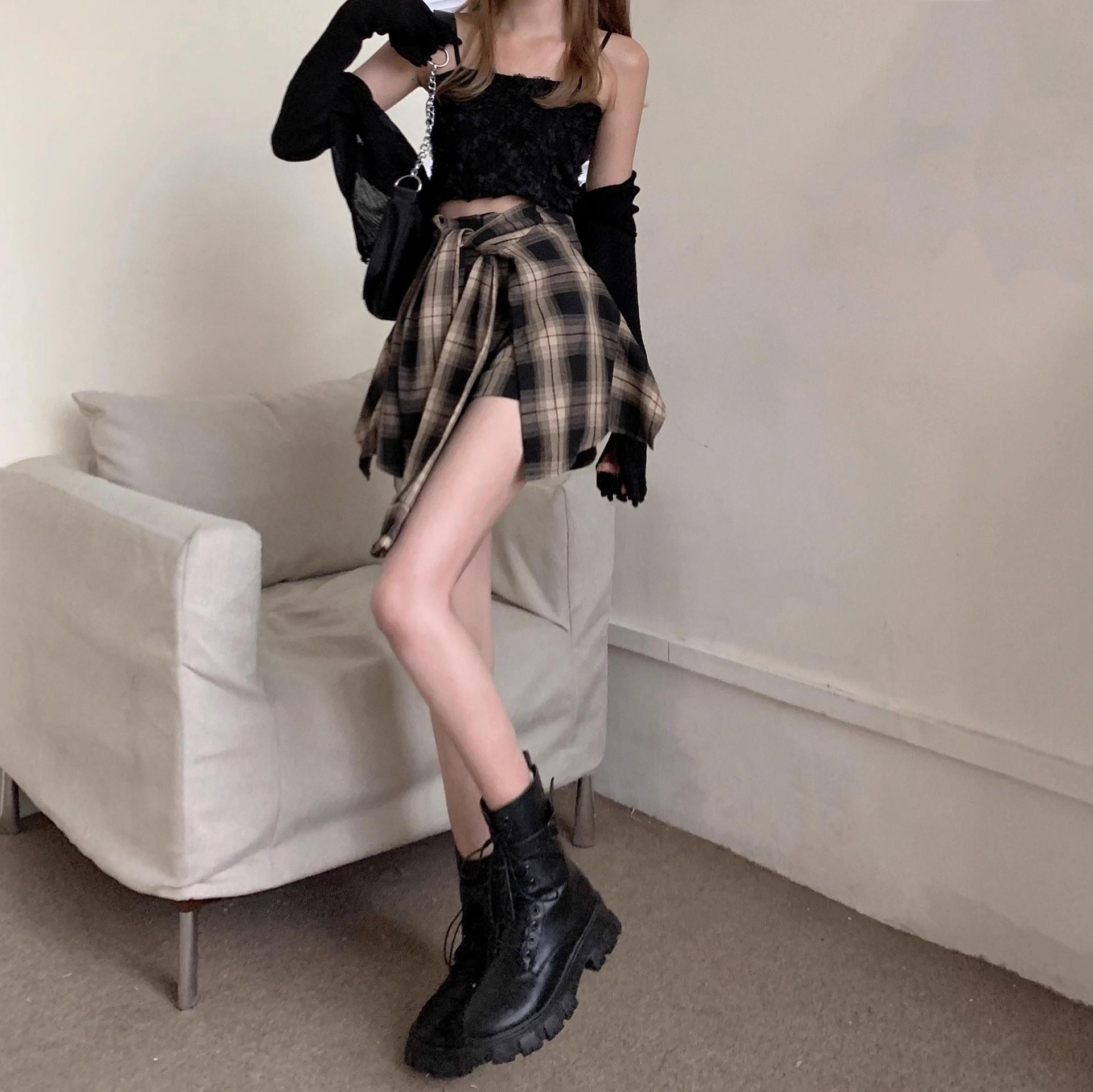 Falda de Cuadros Irregular para Mujer Verano Nuevo Europeo Retro Cintura Alta Chica Hot Reductor de Edad Vacaciones Dos Piezas Shorts Falda