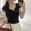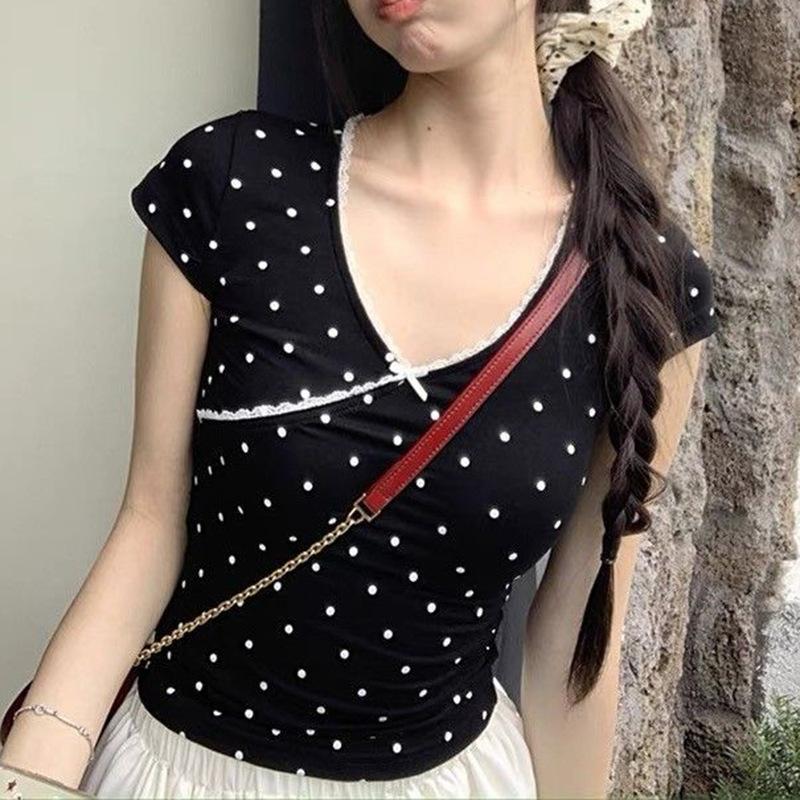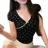 Camiseta de Manga Corta Ajustada con Lazo de Lunares Estilo Coreano Transfronterizo para Mujer Verano Cuello en V Versátil para Ir al Trabajo Diseño con Sentido del Hombro Recto Top Negro