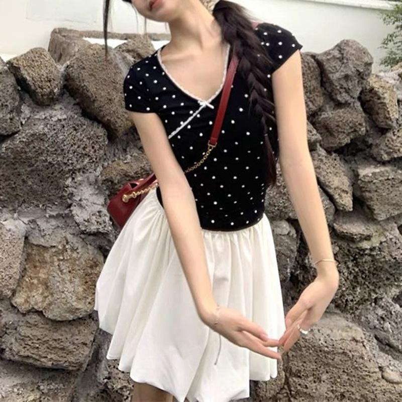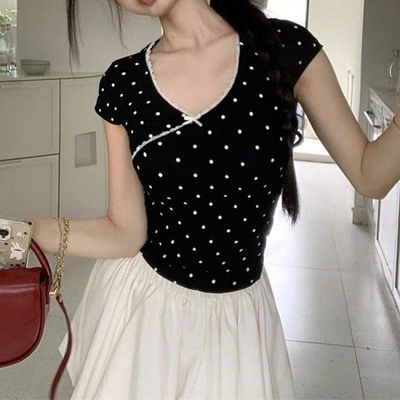 K-style polka dot bowsilm short-sleeved t-shirt for women summer