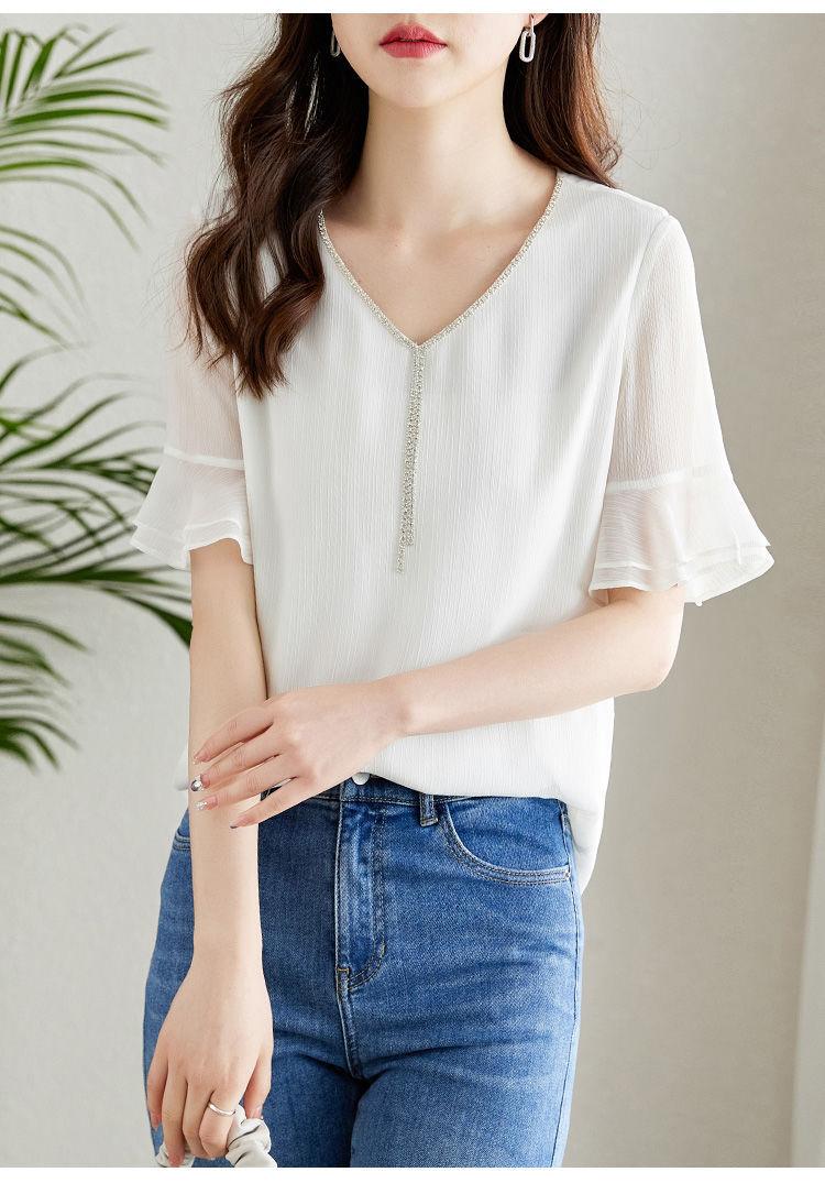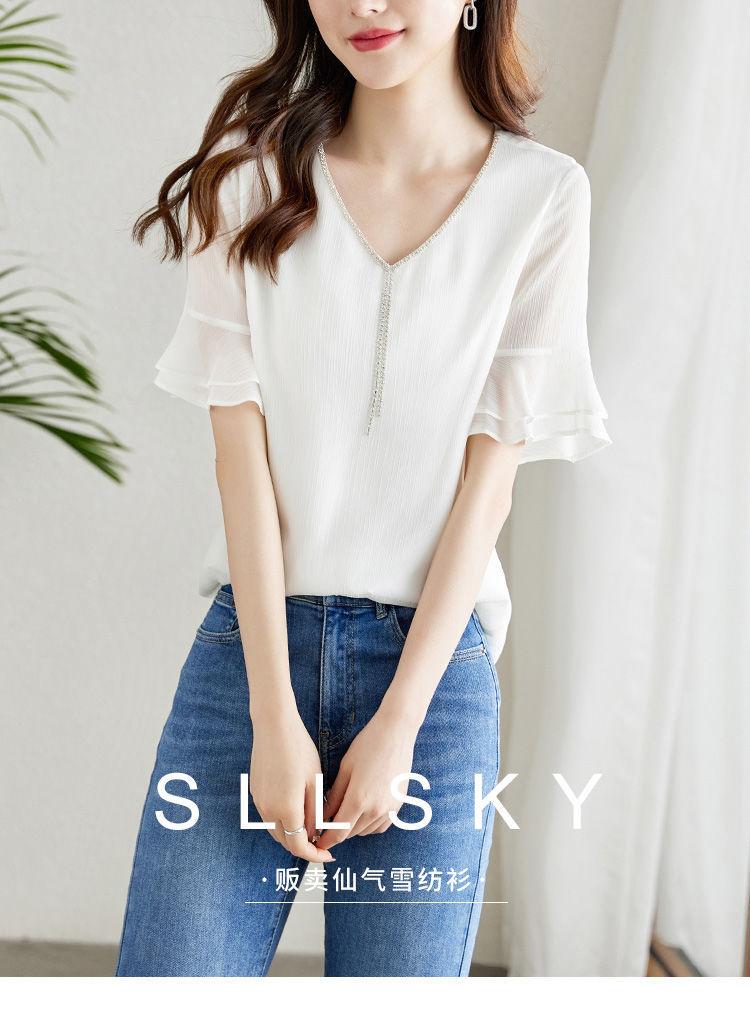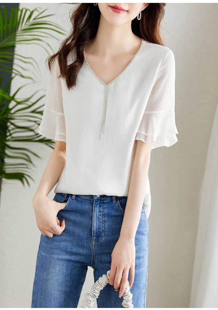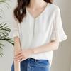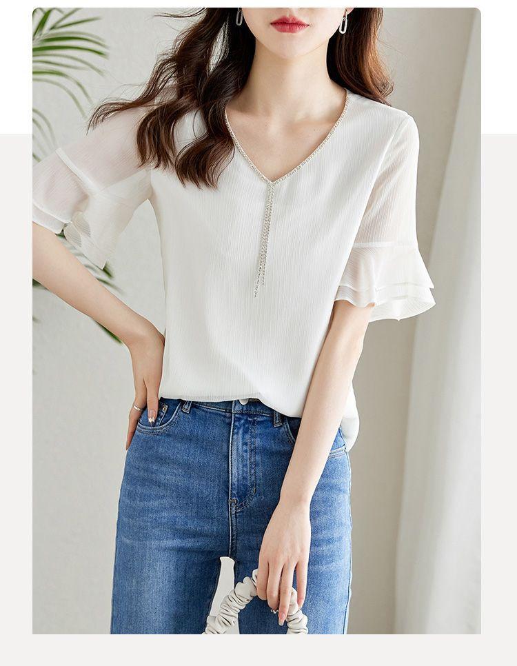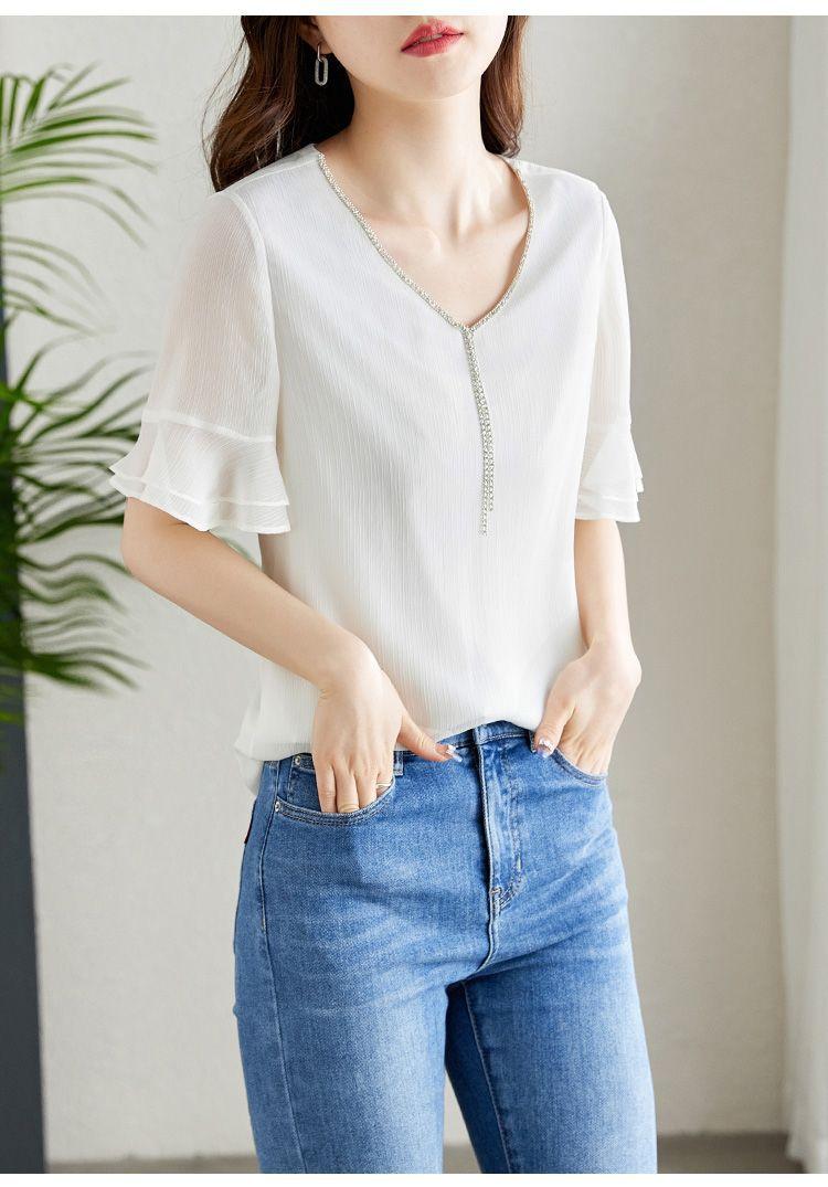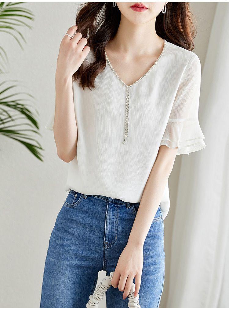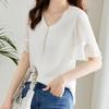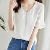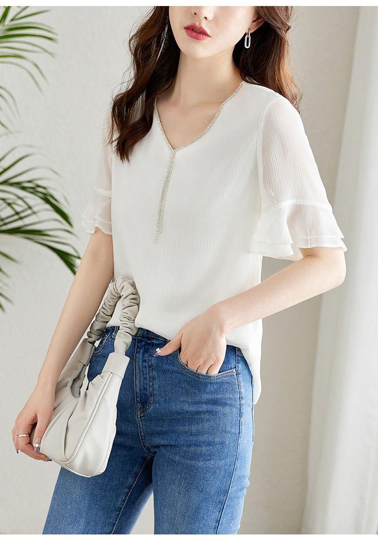 Camisa de Gasa con Cuello en V y Manga con Volantes para Mujer Verano 2025 Nueva Holgada Cubre Vientre Adelgazante Top Blanco Super Hada Camisa Trendy