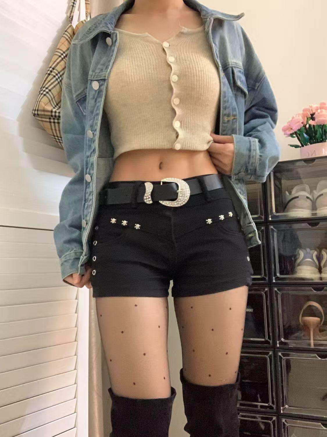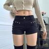 Shorts de Mezclilla Negros de Verano para Mujer 2025 Nuevo Hot Girl Remache Cintura Baja Ajustado Versátil Pierna Ancha Pantalones Cortos