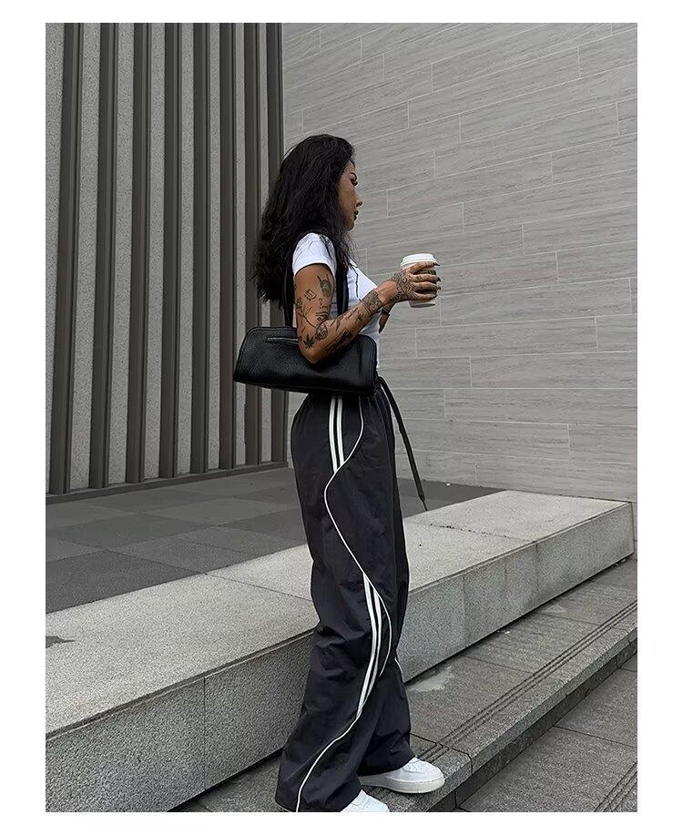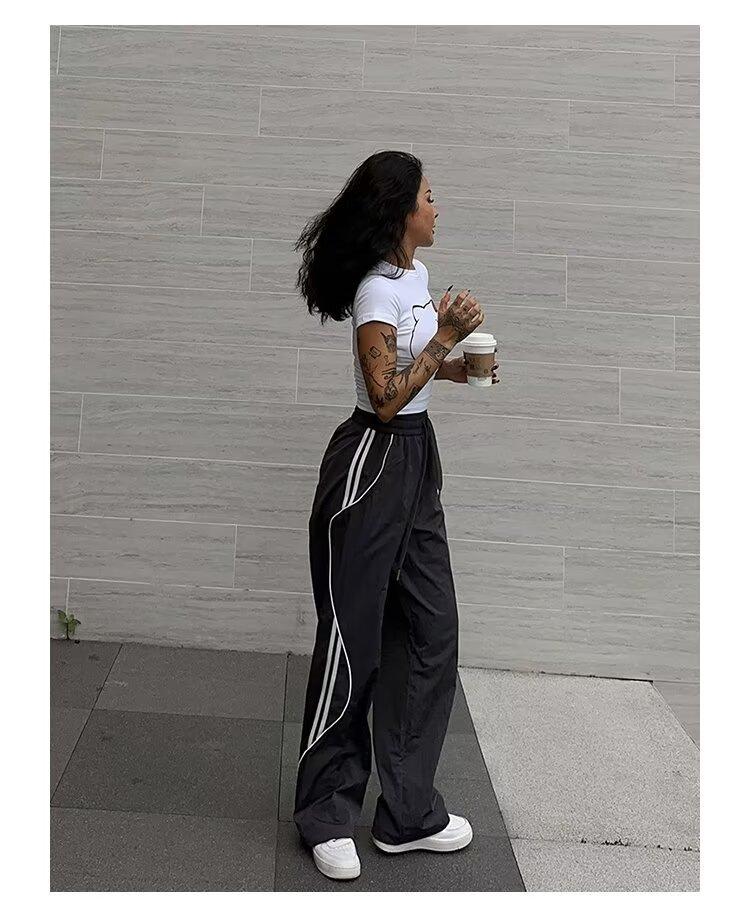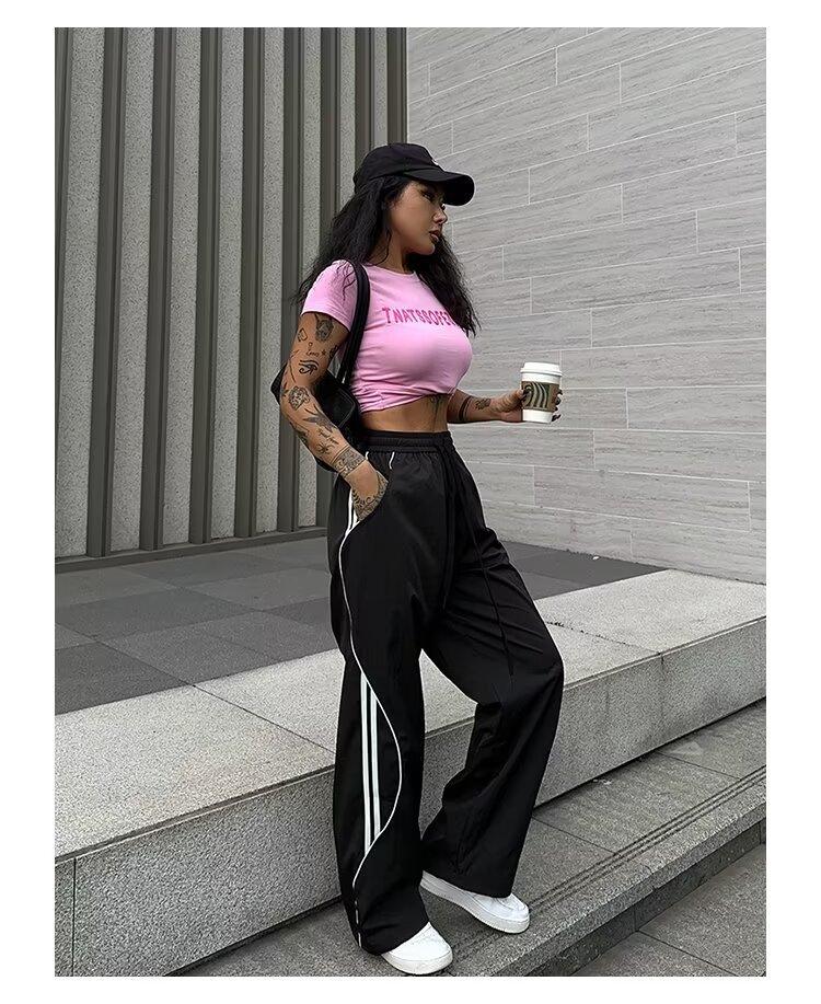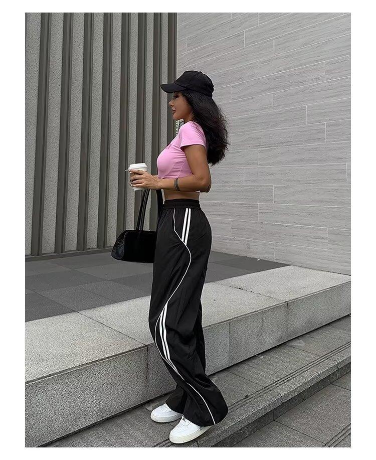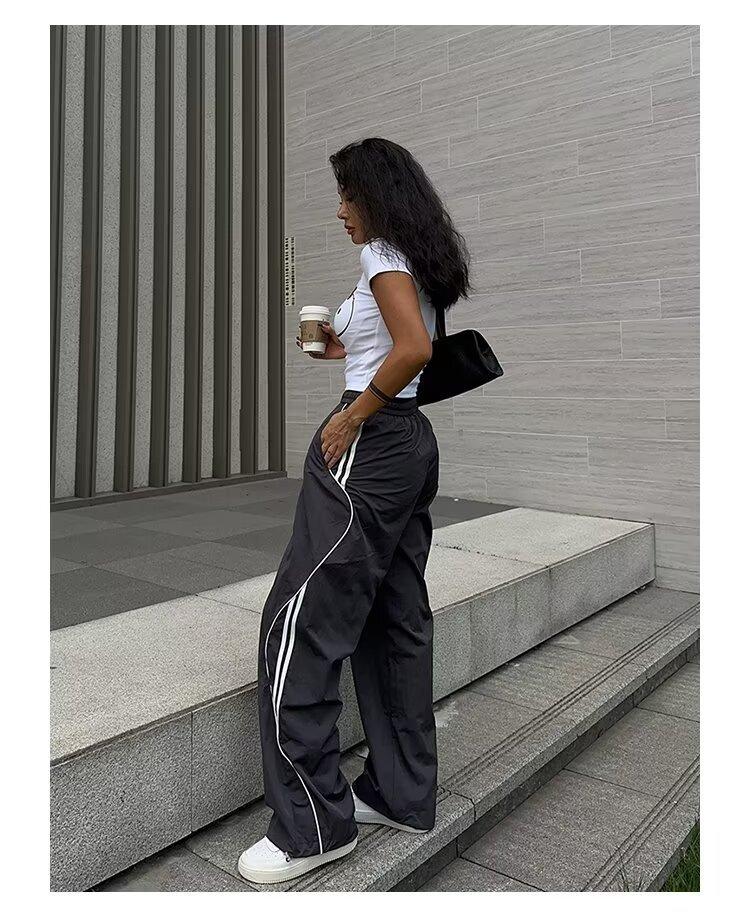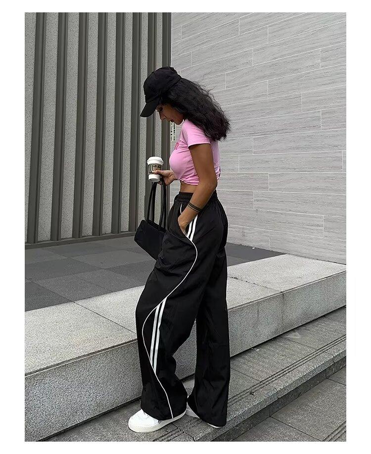 Pantalones Deportivos de Pierna Ancha Rayados Negros con Sentido del Diseño para Mujer Primavera y Verano Estilo Americano Retro Casual Sueltos Dumping Pantalones de Moda