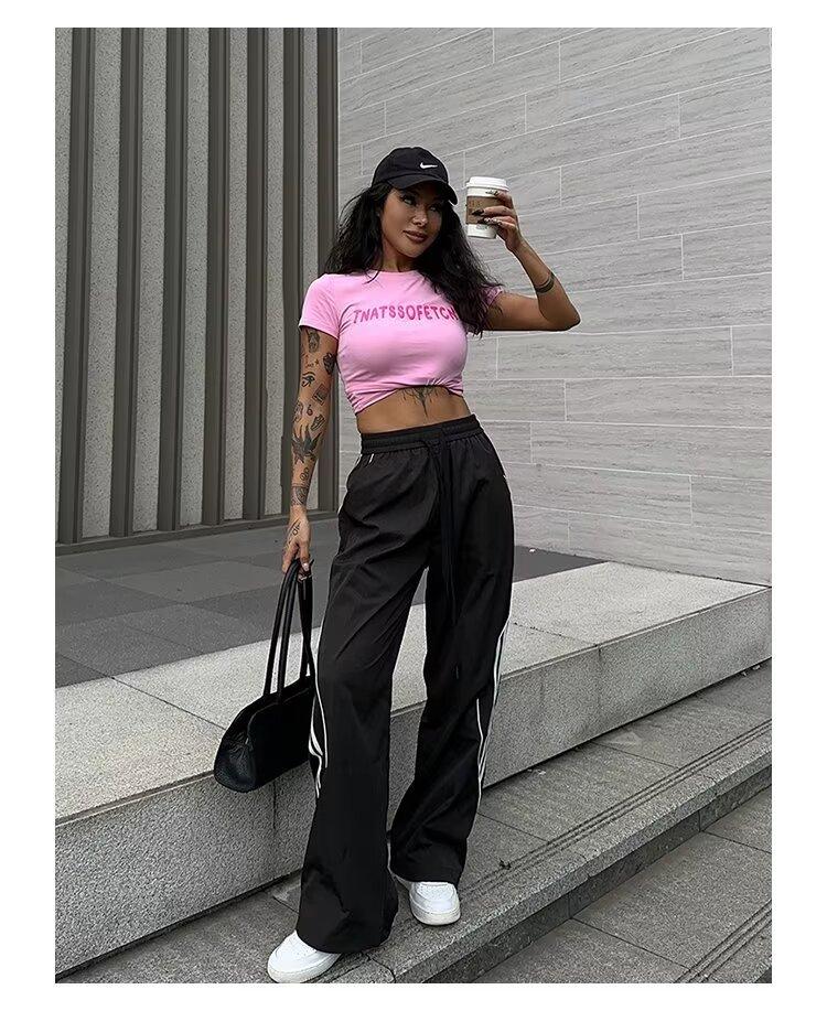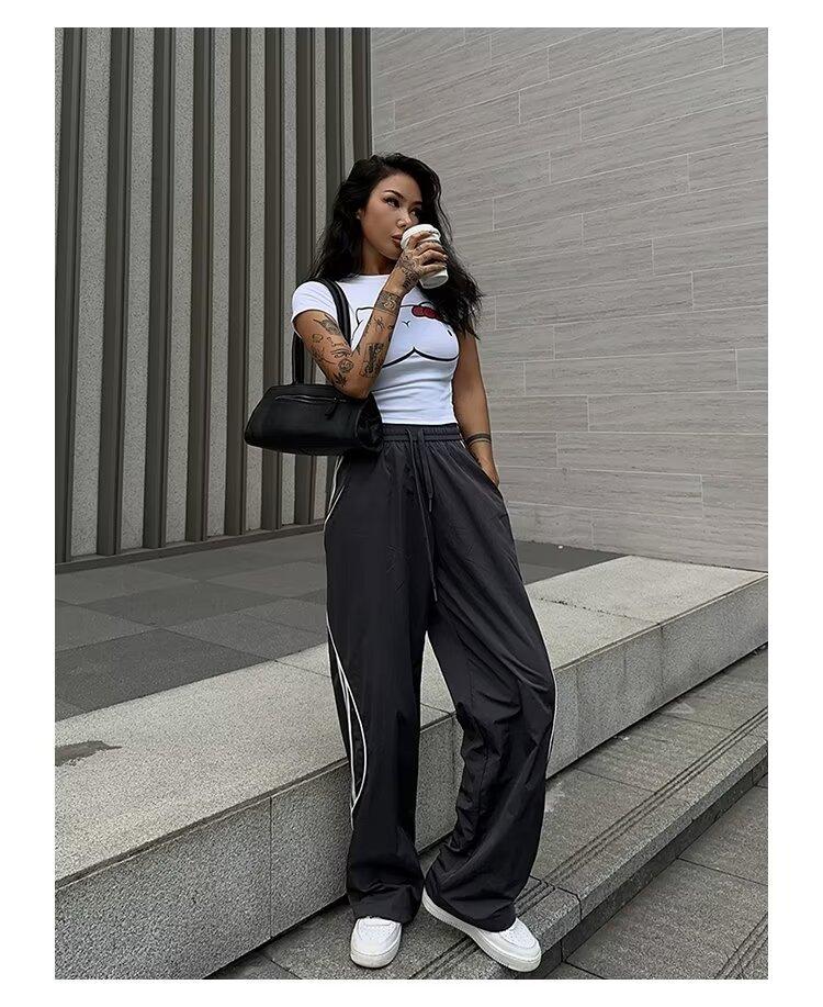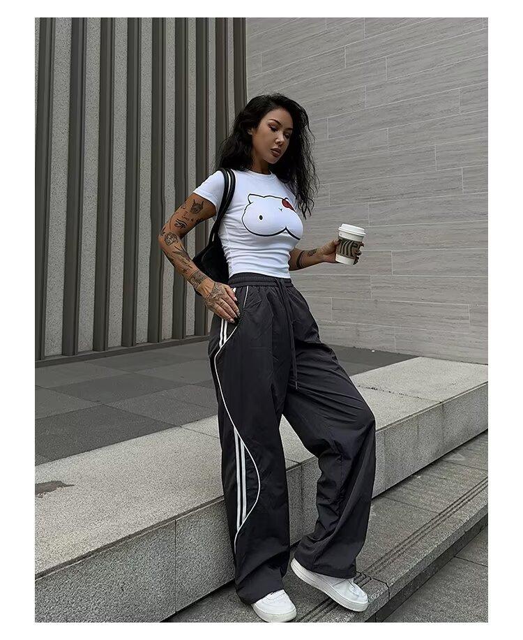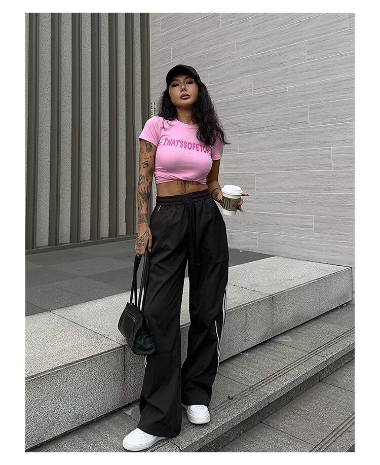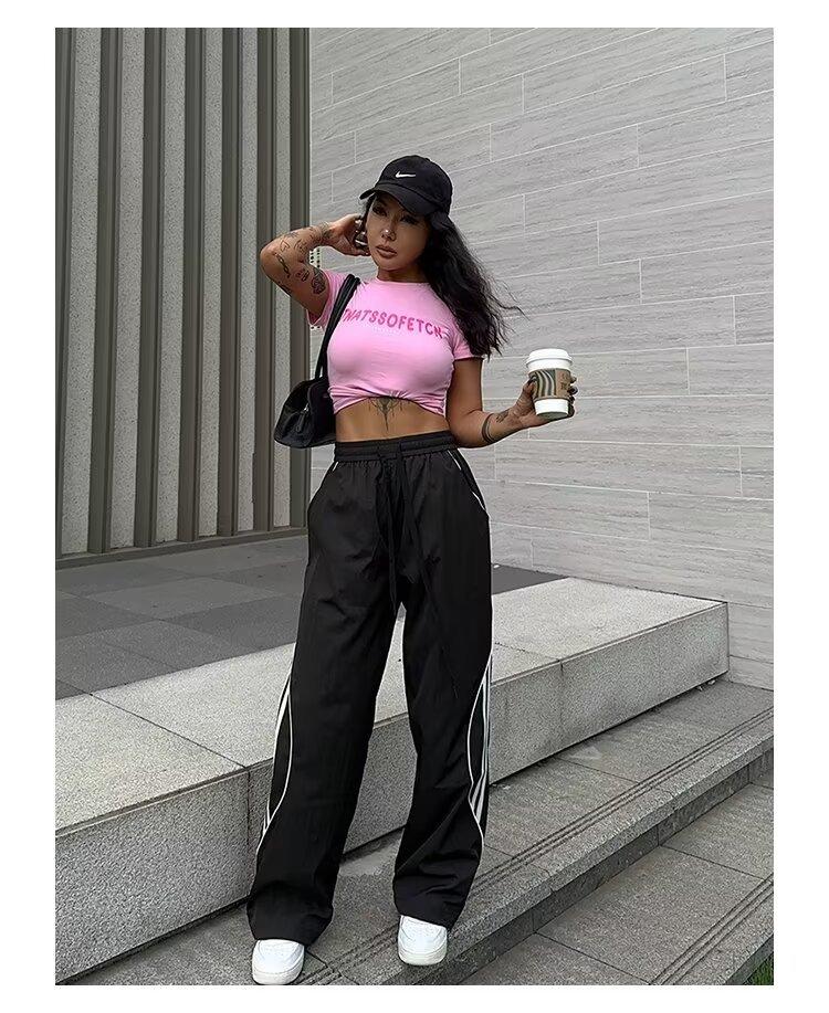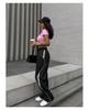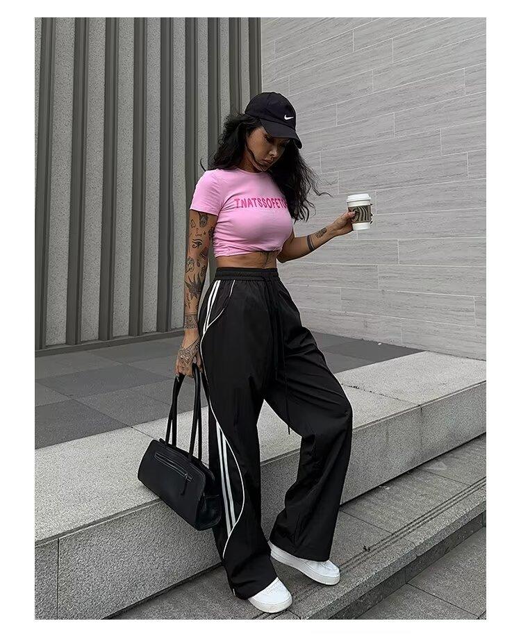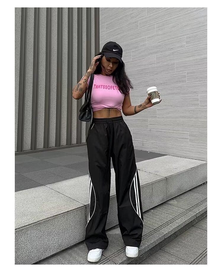 Pantalones Deportivos de Pierna Ancha Rayados Negros con Sentido del Diseño para Mujer Primavera y Verano Estilo Americano Retro Casual Sueltos Dumping Pantalones de Moda