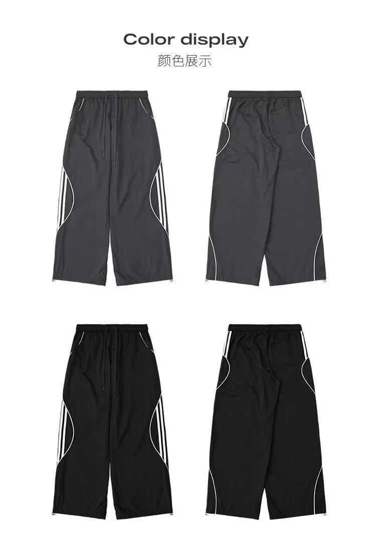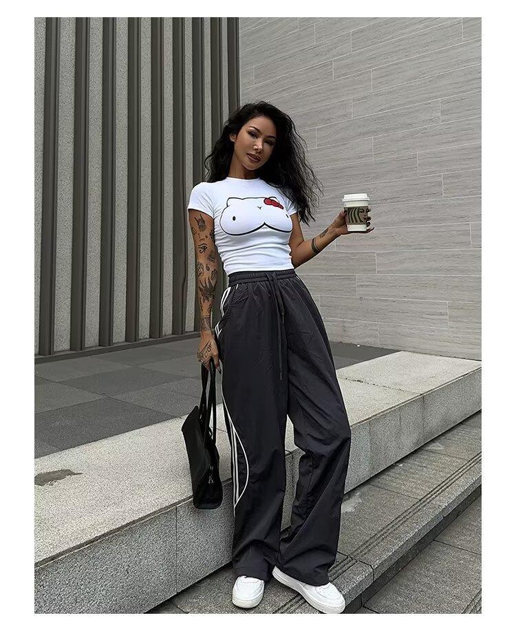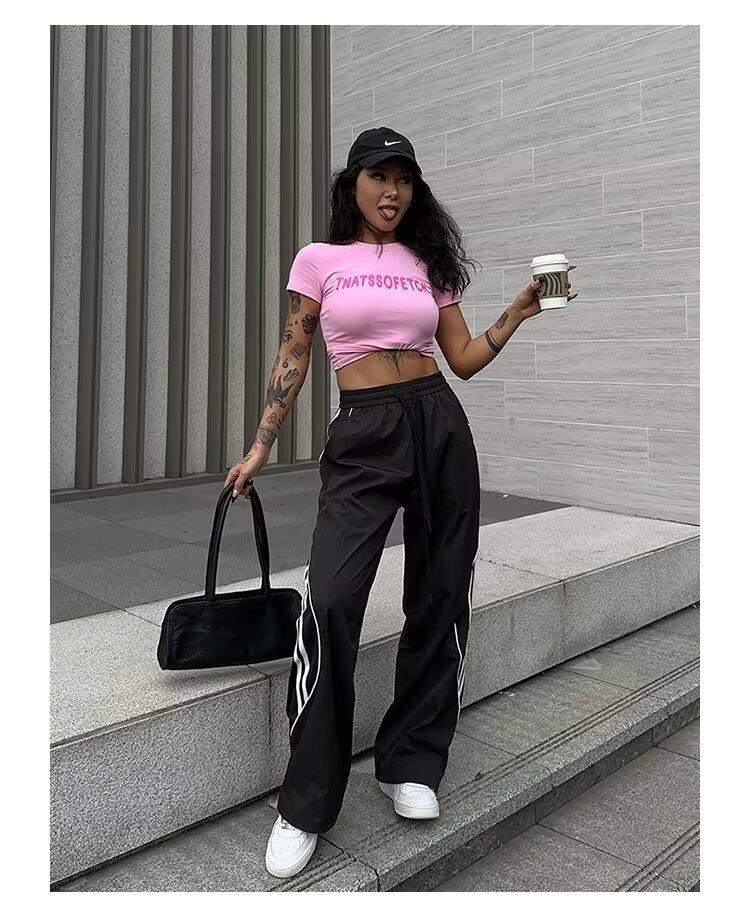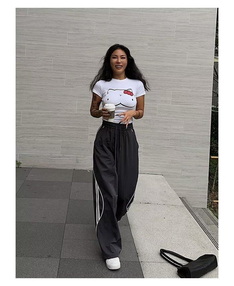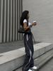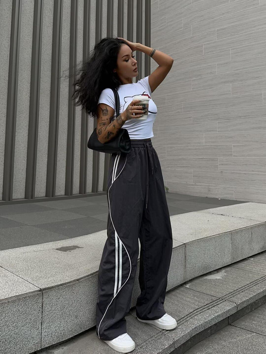 Pantalones Deportivos de Pierna Ancha Rayados Negros con Sentido del Diseño para Mujer Primavera y Verano Estilo Americano Retro Casual Sueltos Dumping Pantalones de Moda