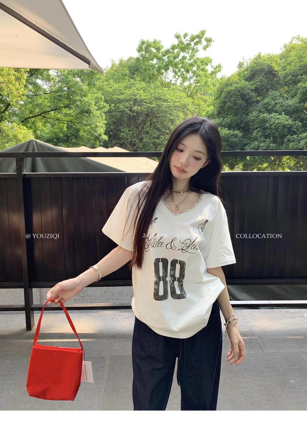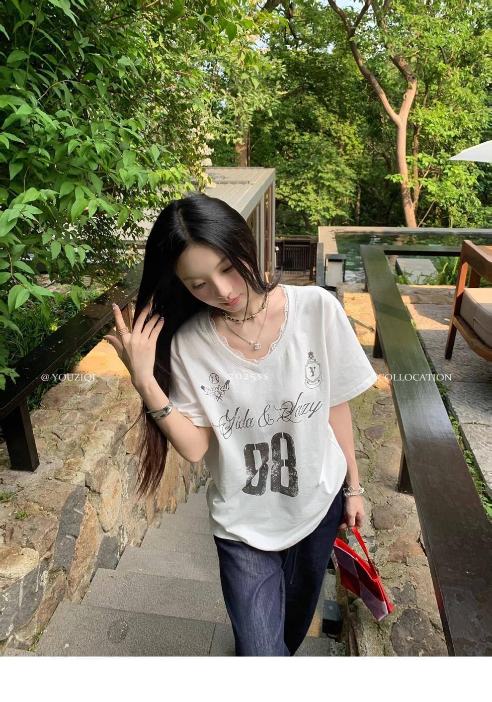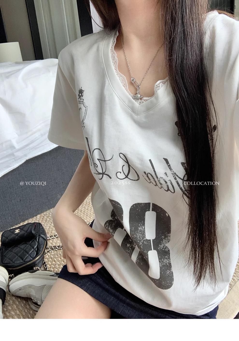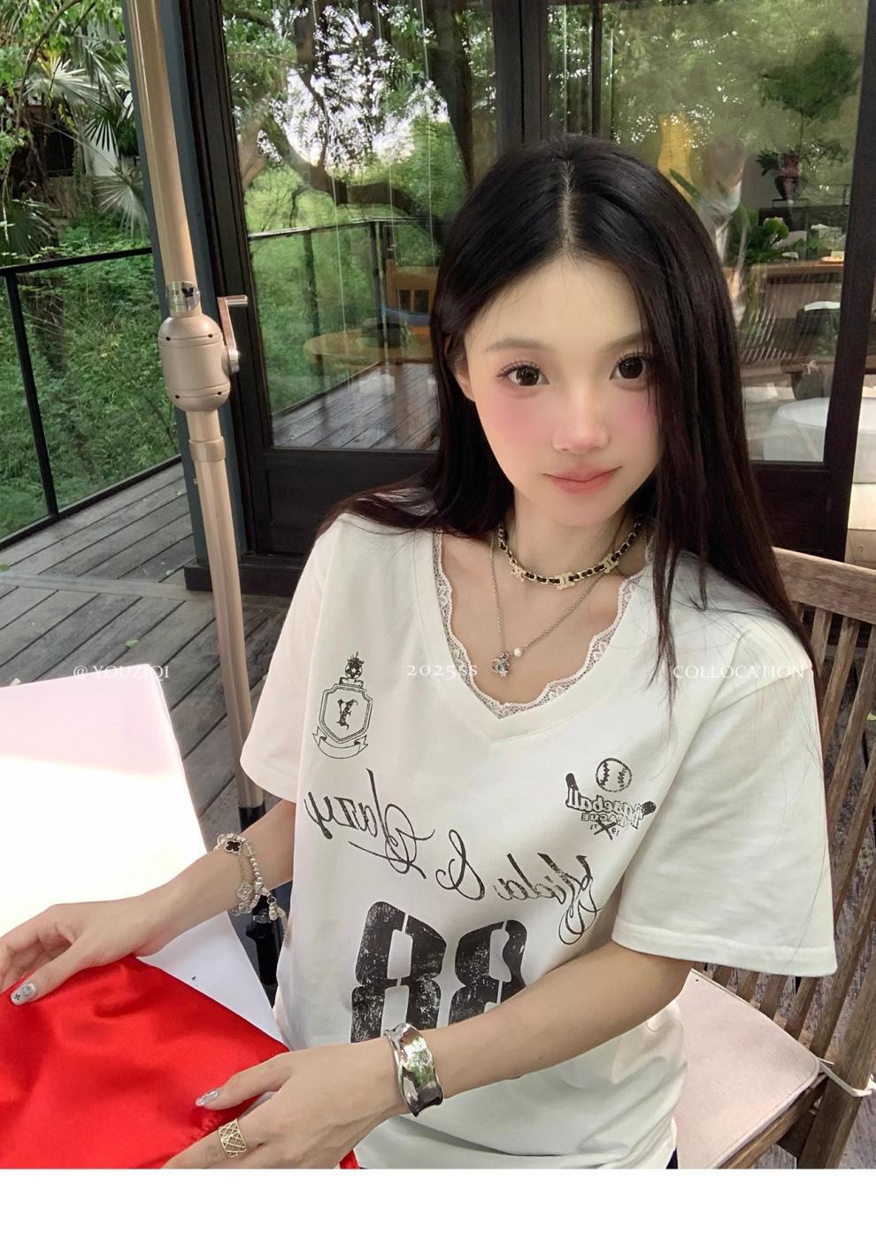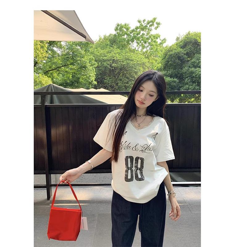 Playera Blanca Americana de Manga Corta para Mujer con Encaje de Cuello en V y Estampado Verano Holgada Look Retro Adelgazante y Diseño Lazy