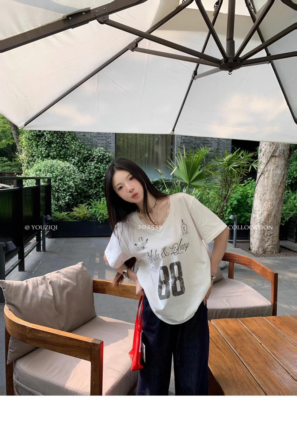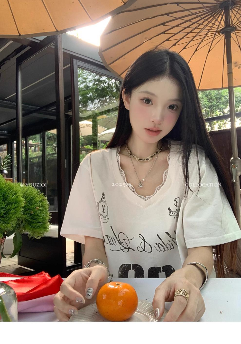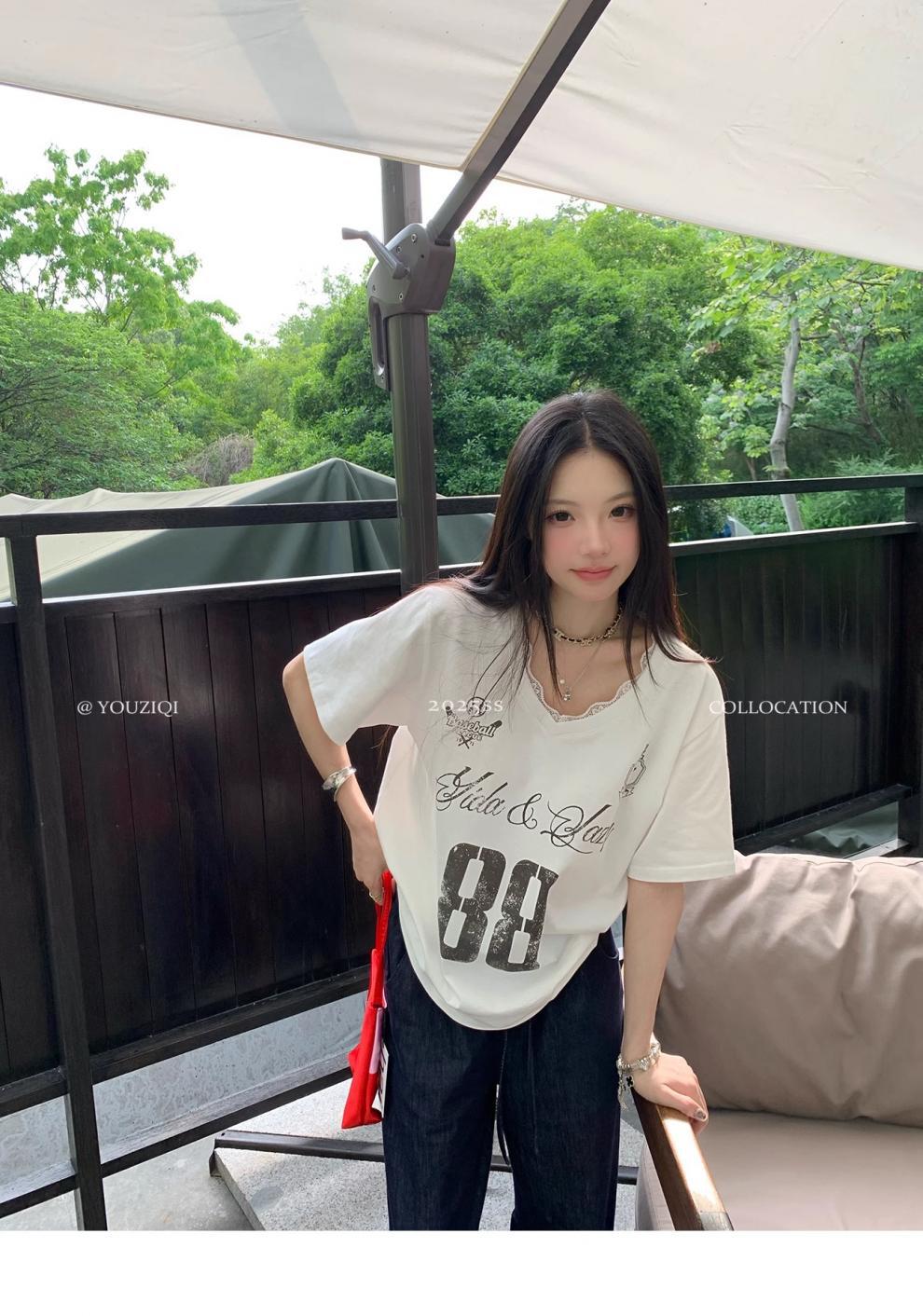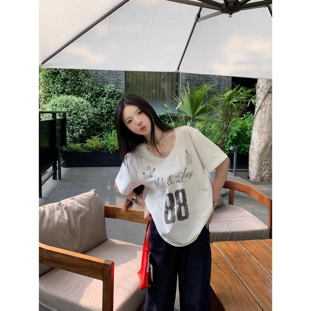 Playera Blanca Americana de Manga Corta para Mujer con Encaje de Cuello en V y Estampado Verano Holgada Look Retro Adelgazante y Diseño Lazy