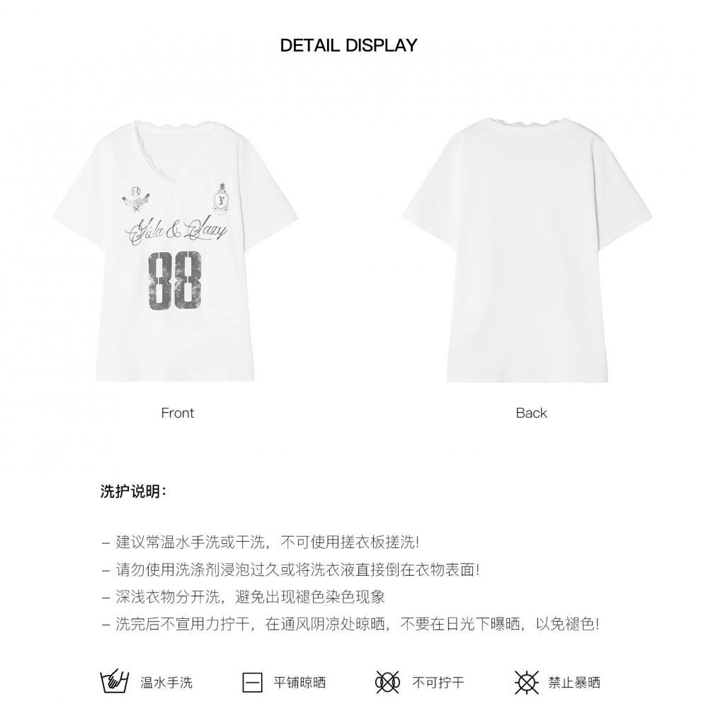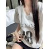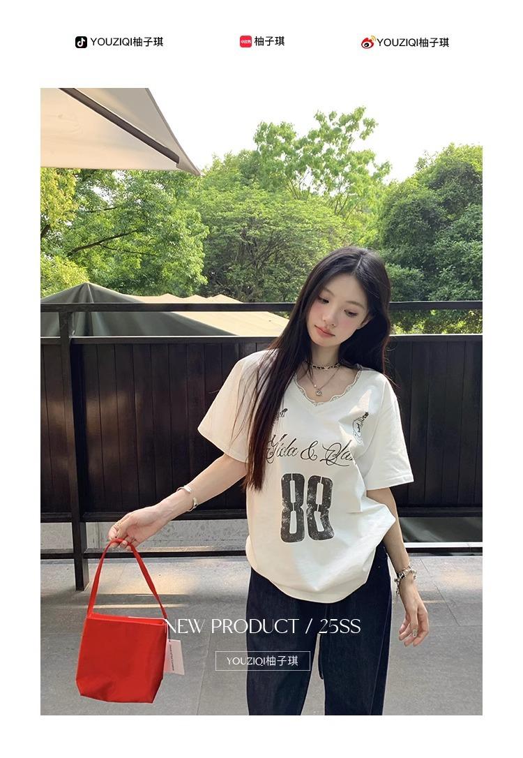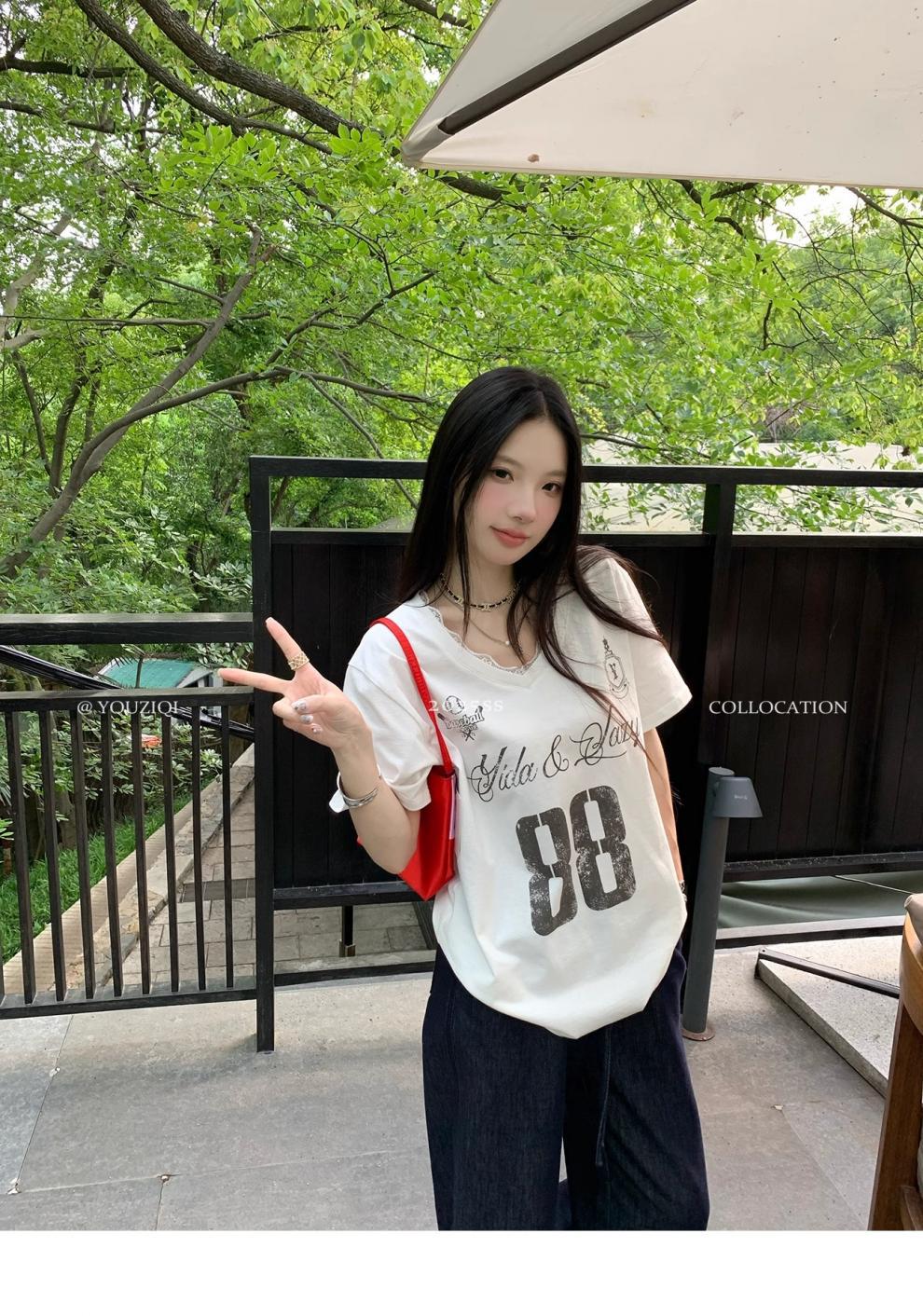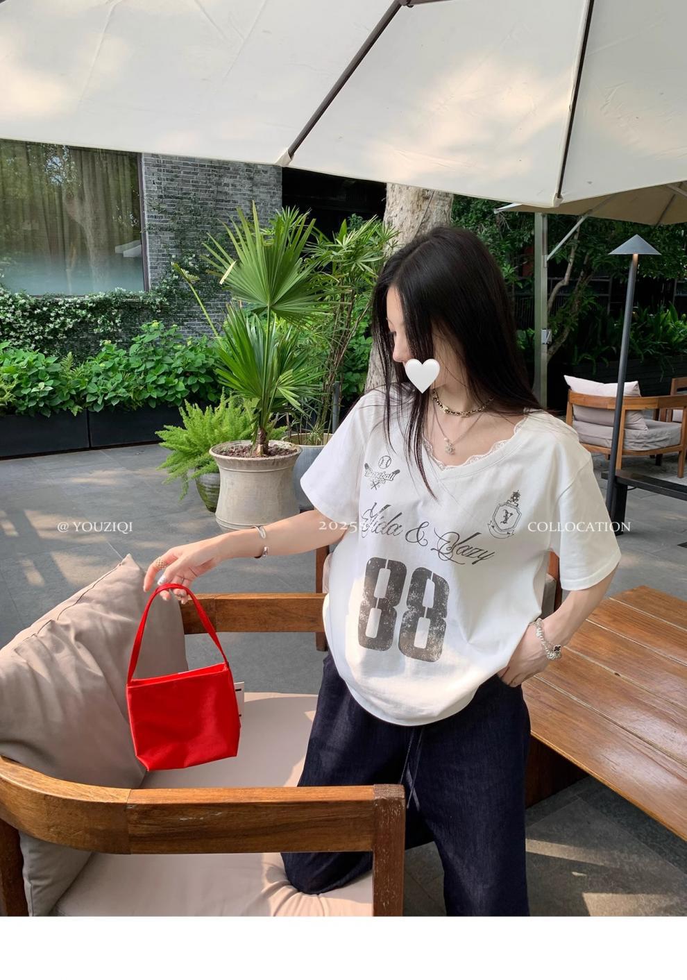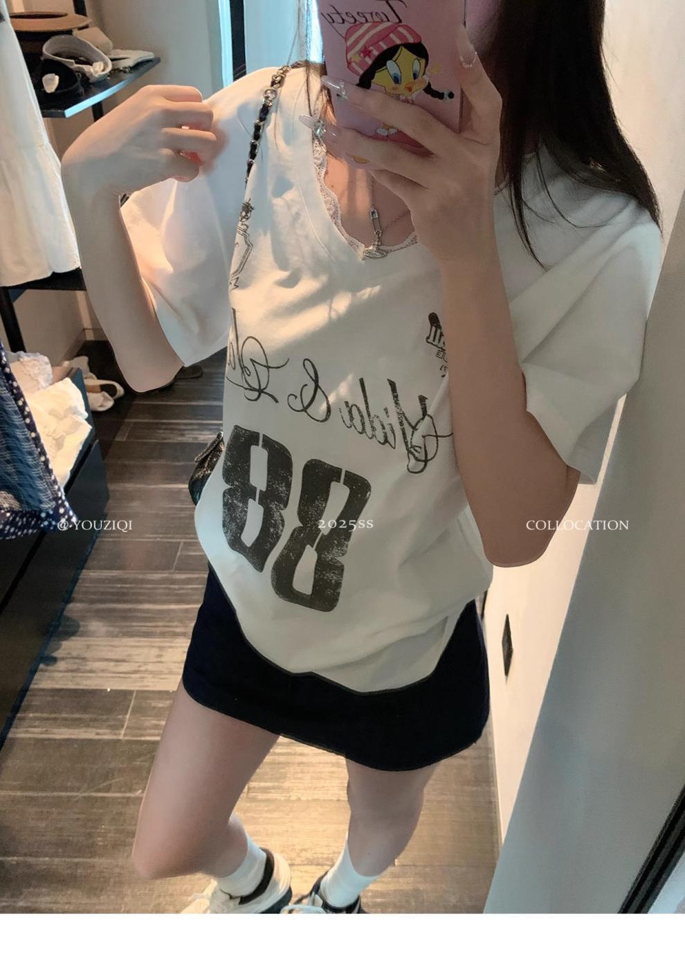 Playera Blanca Americana de Manga Corta para Mujer con Encaje de Cuello en V y Estampado Verano Holgada Look Retro Adelgazante y Diseño Lazy