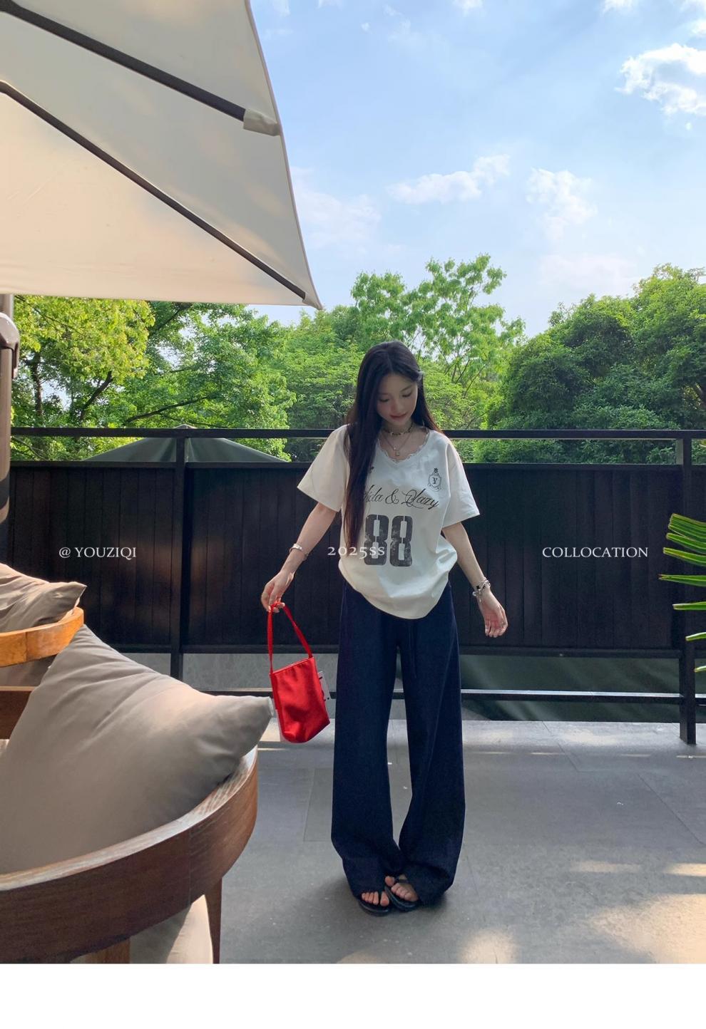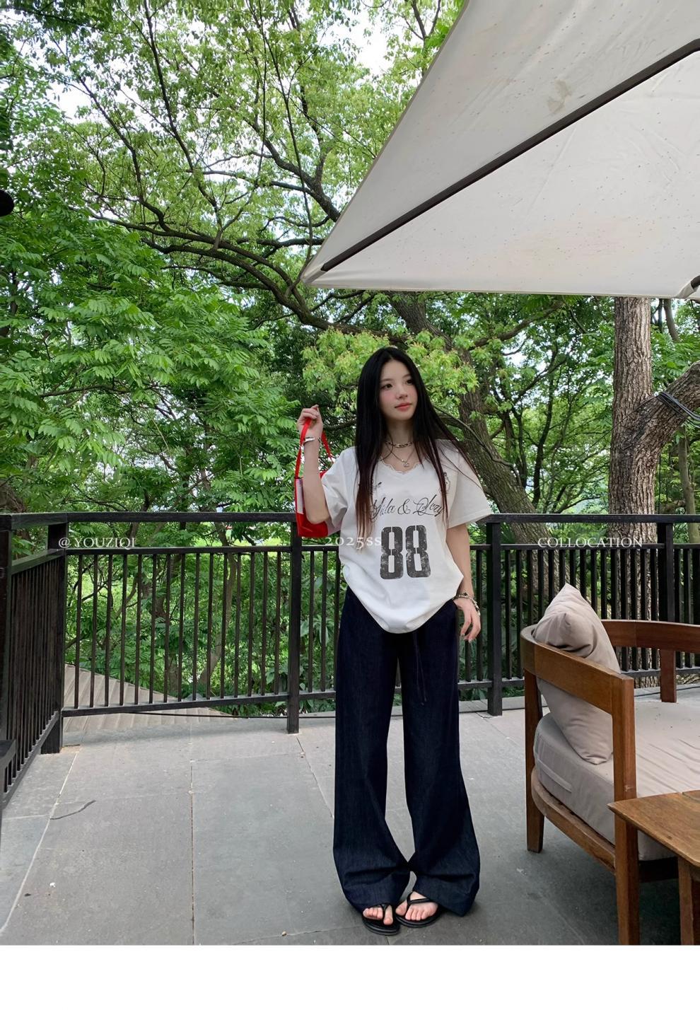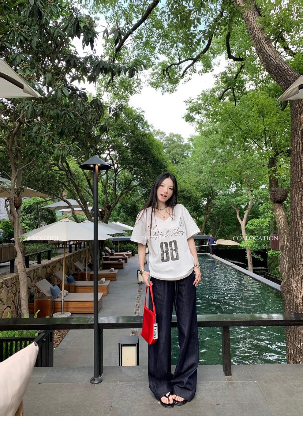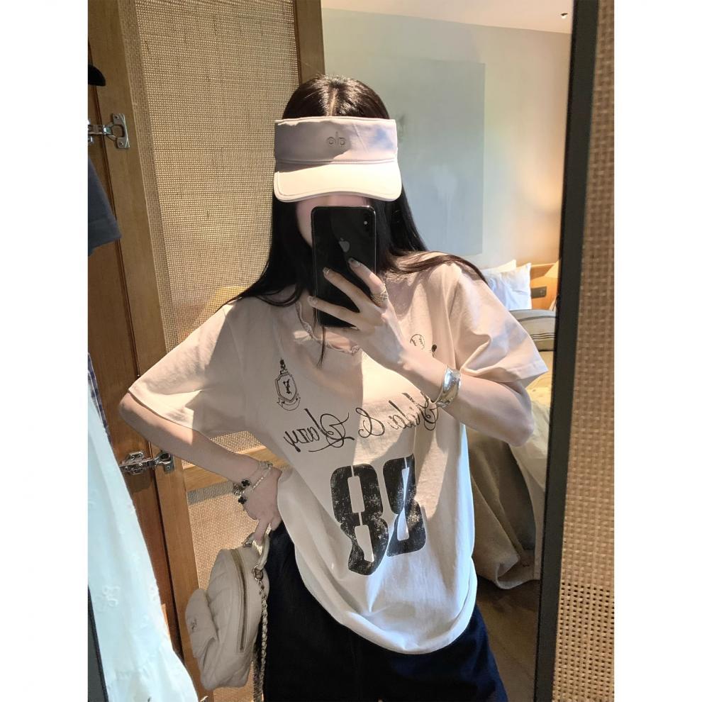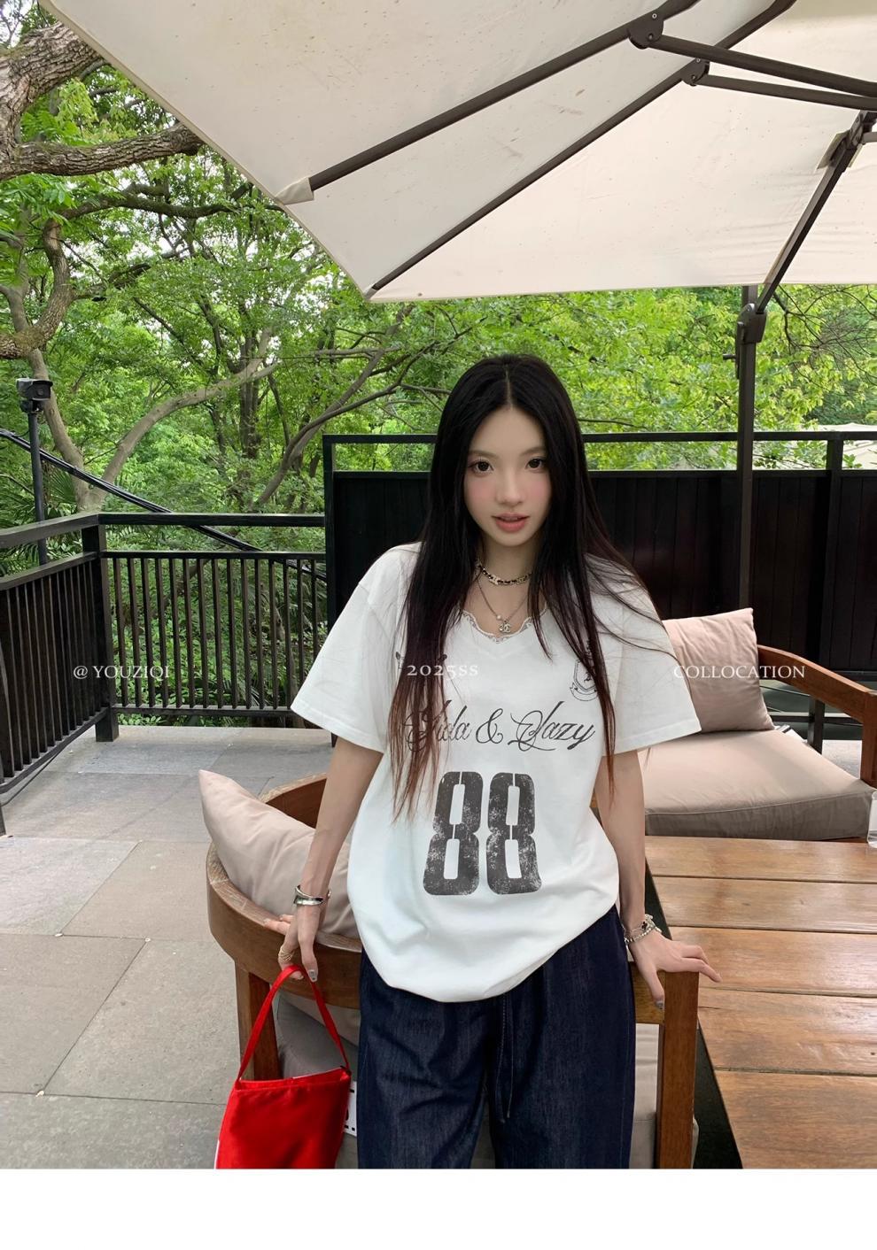 Playera Blanca Americana de Manga Corta para Mujer con Encaje de Cuello en V y Estampado Verano Holgada Look Retro Adelgazante y Diseño Lazy