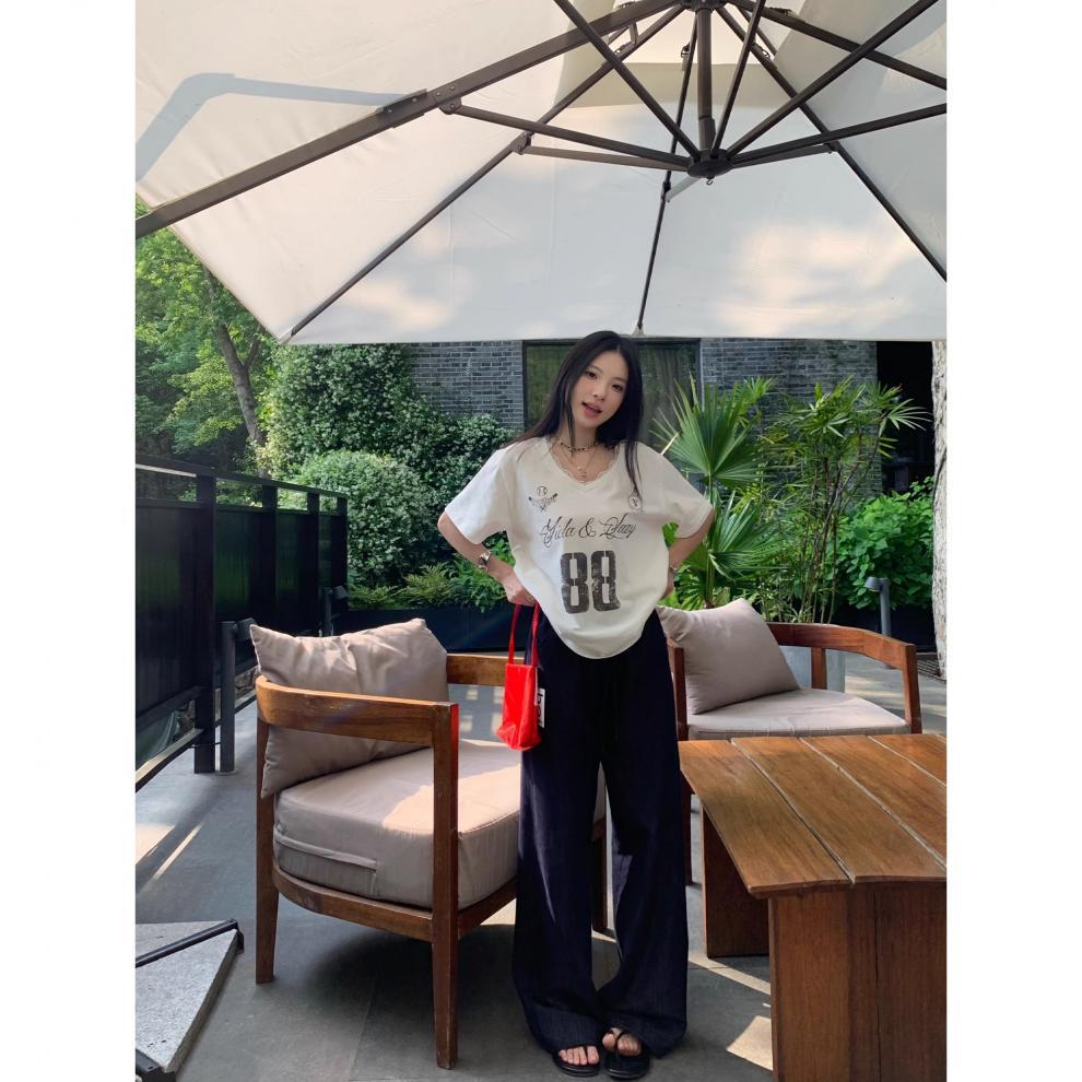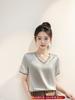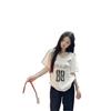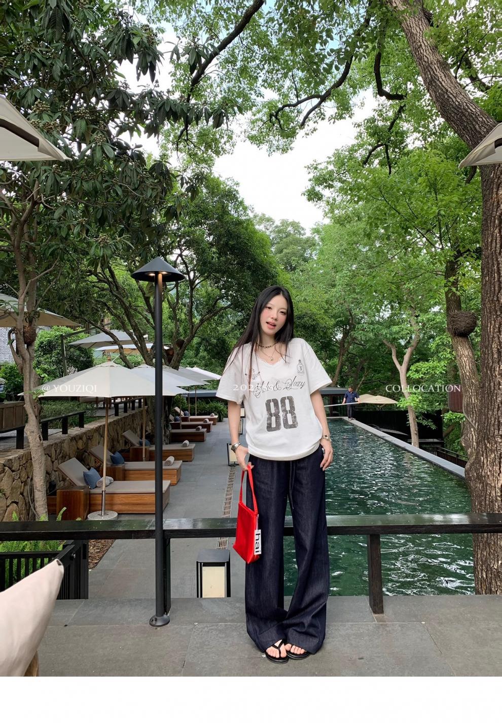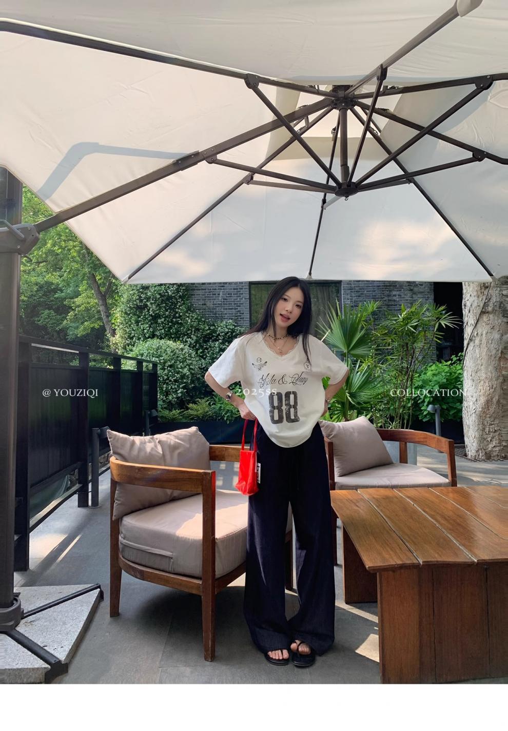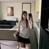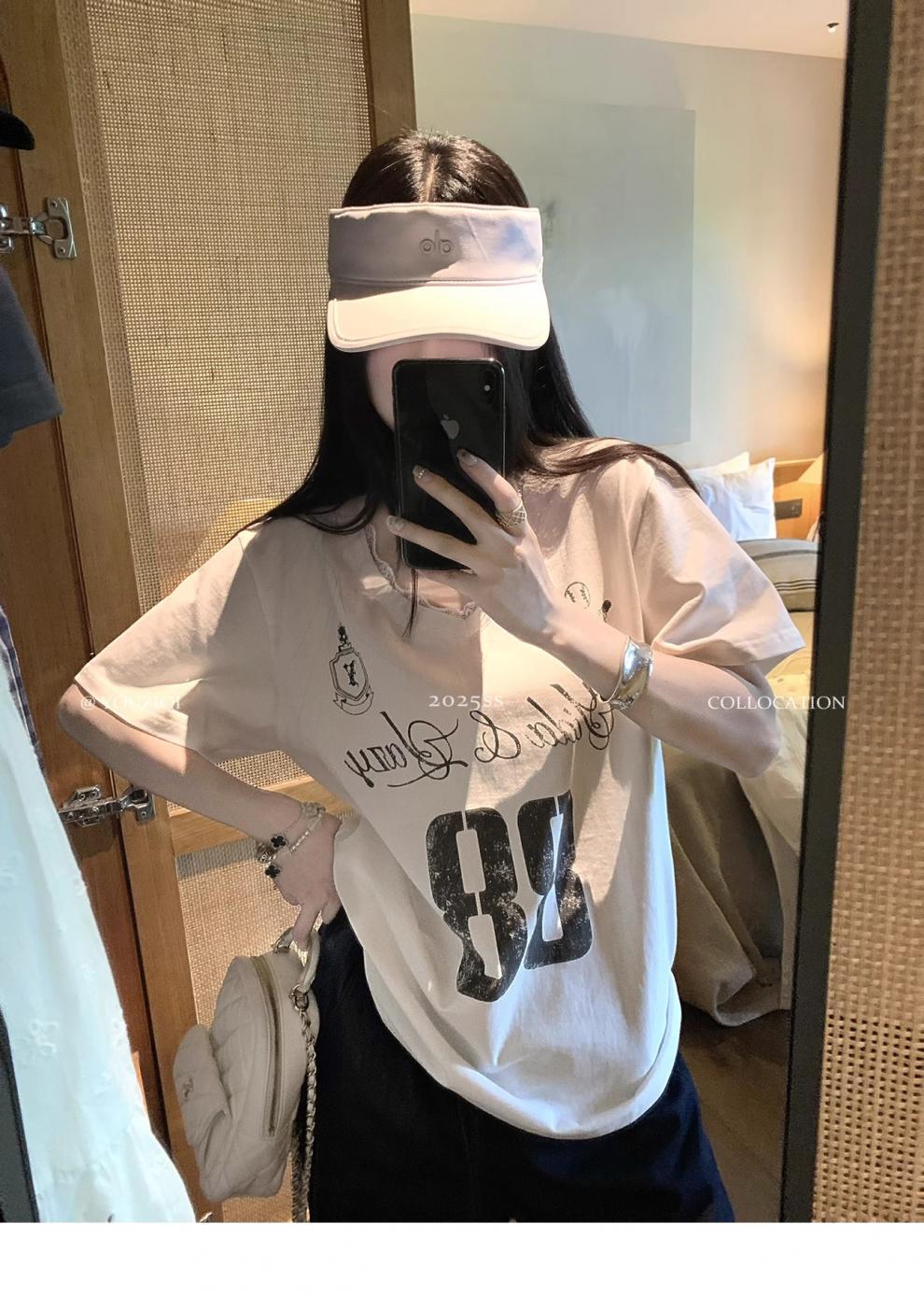 Playera Blanca Americana de Manga Corta para Mujer con Encaje de Cuello en V y Estampado Verano Holgada Look Retro Adelgazante y Diseño Lazy