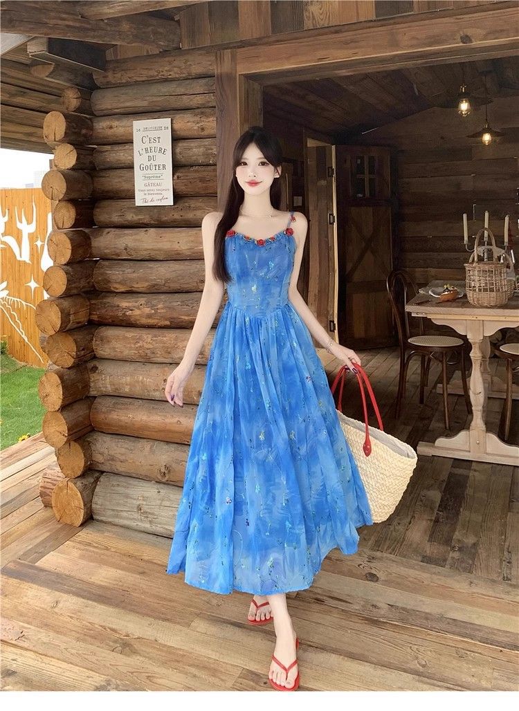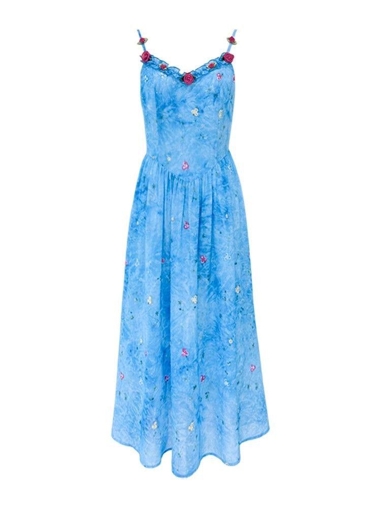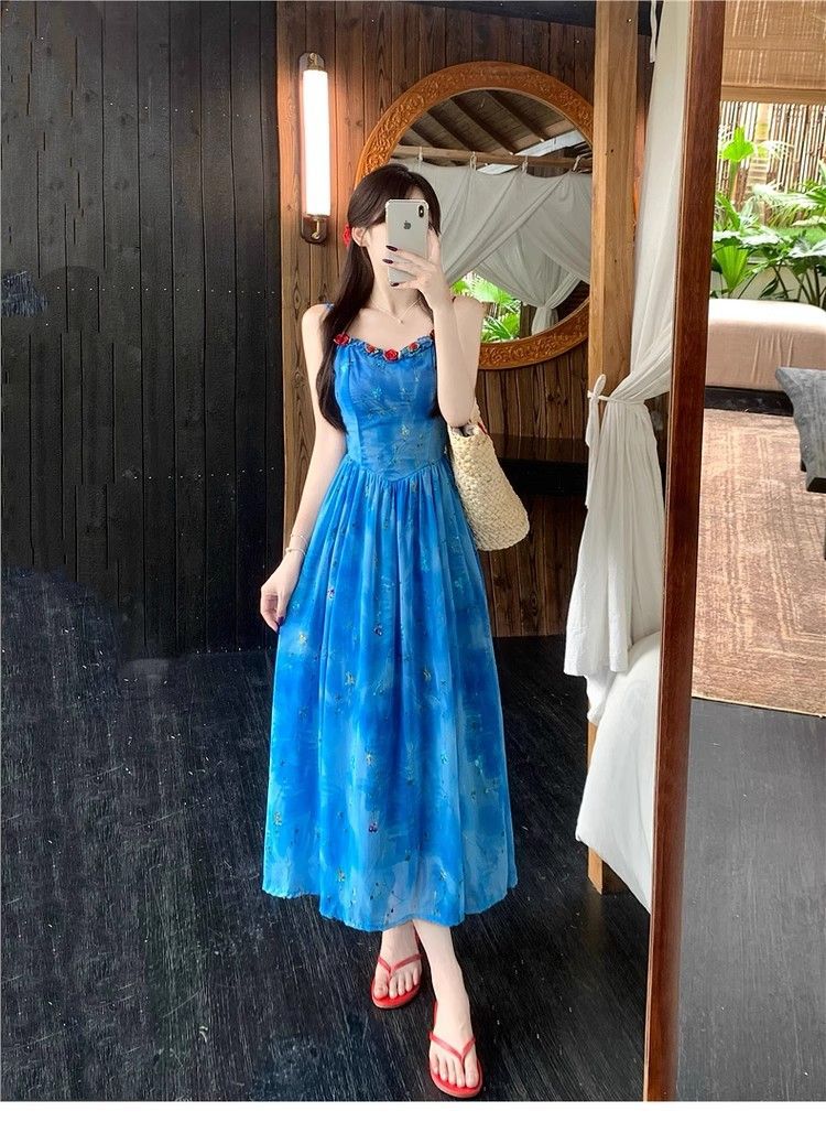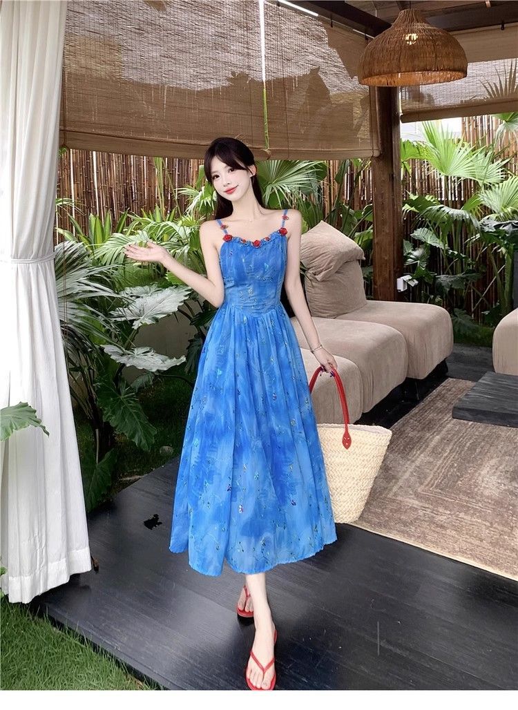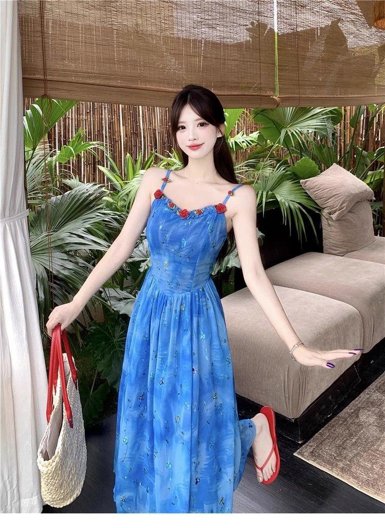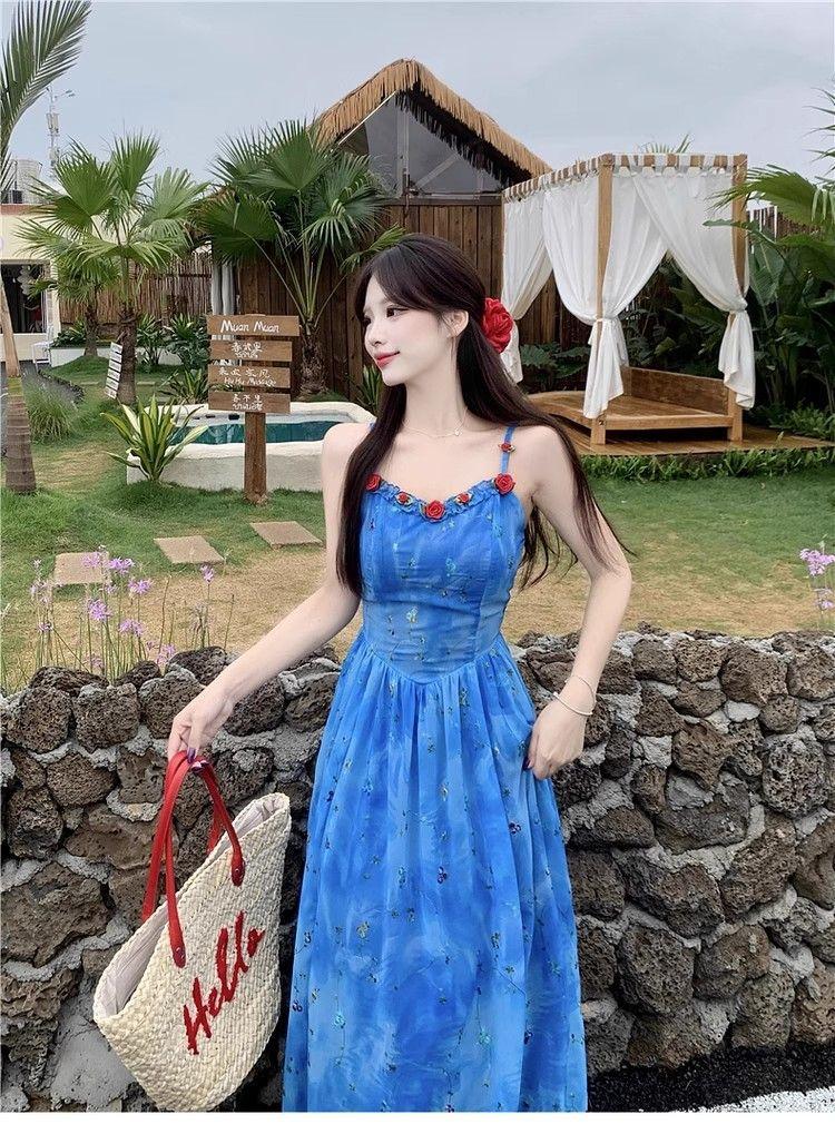 Verano Nuevo Rosa Francés Retro Suave Bordado Floral Estilo Vacacional Deseo Puro Adelgazante Commuter Vestido de Tirantes