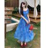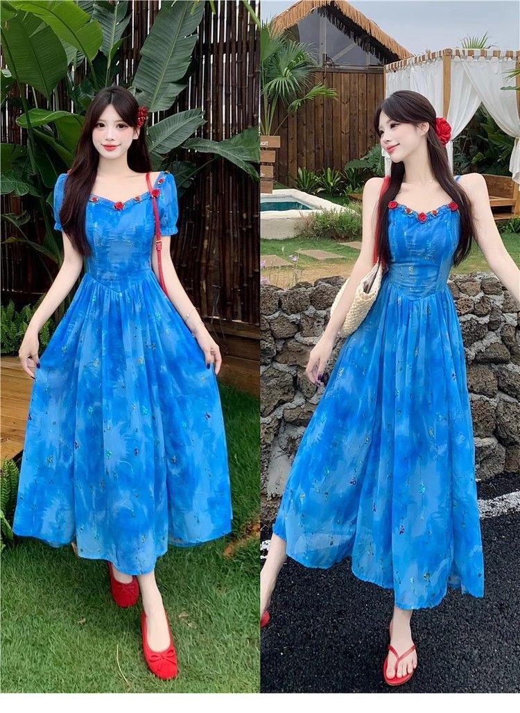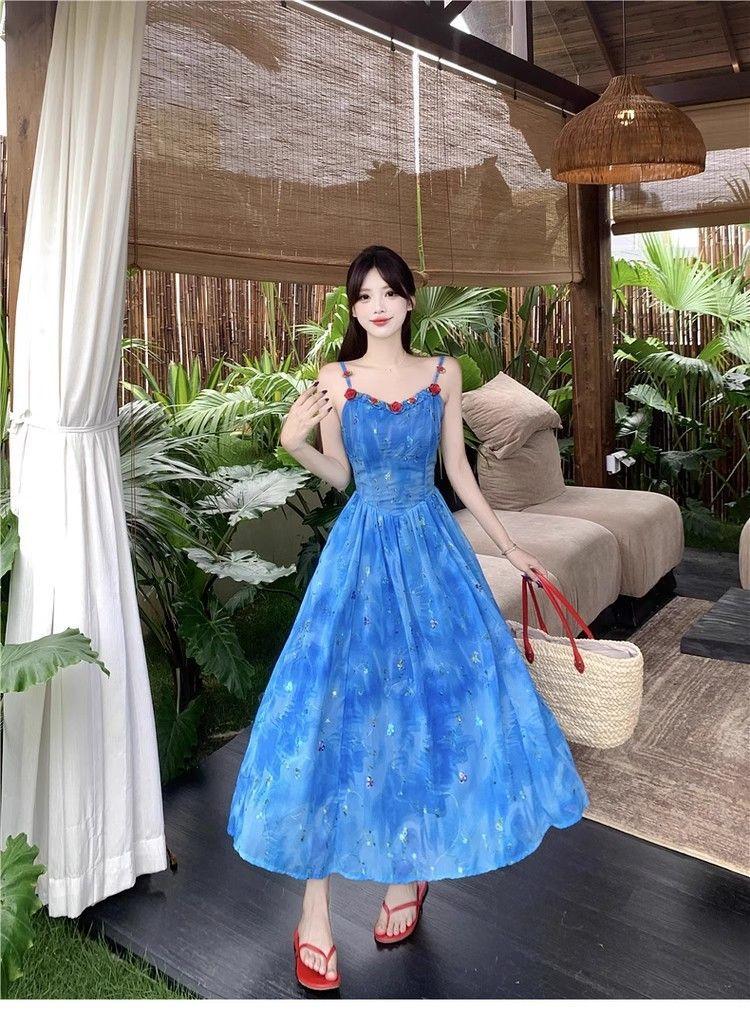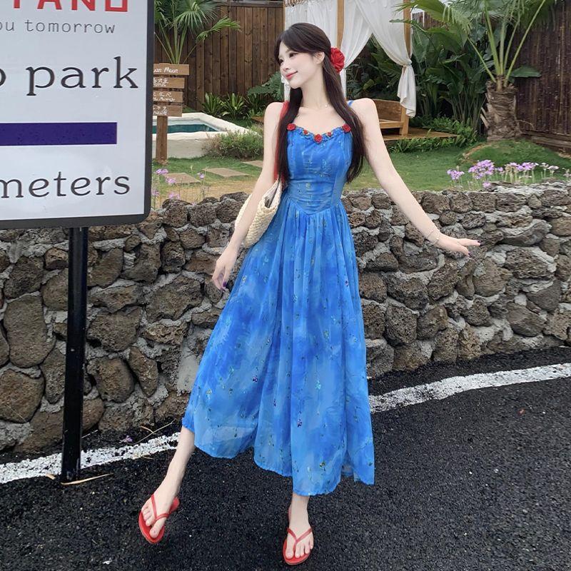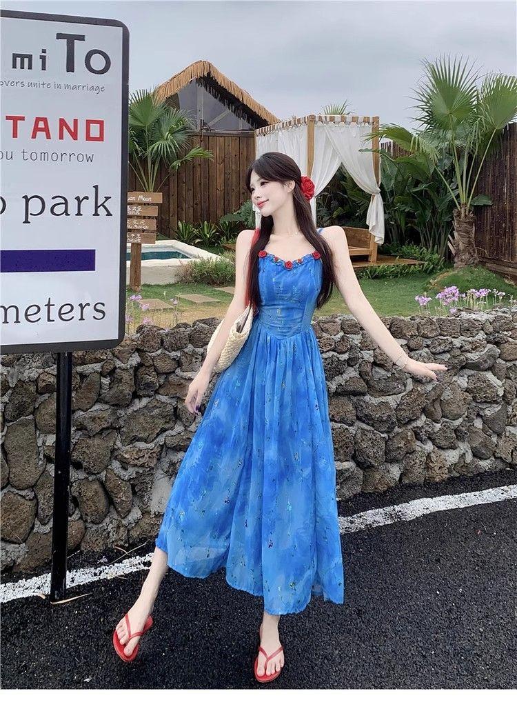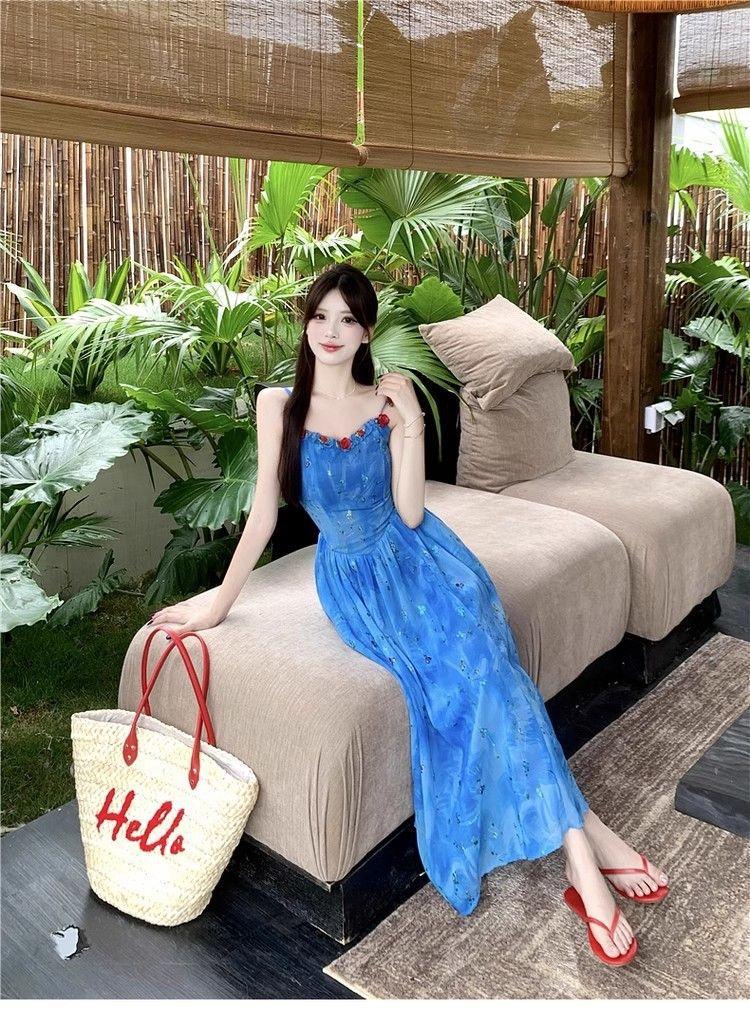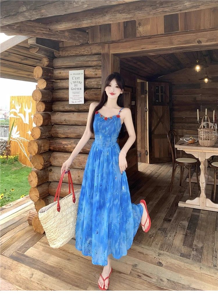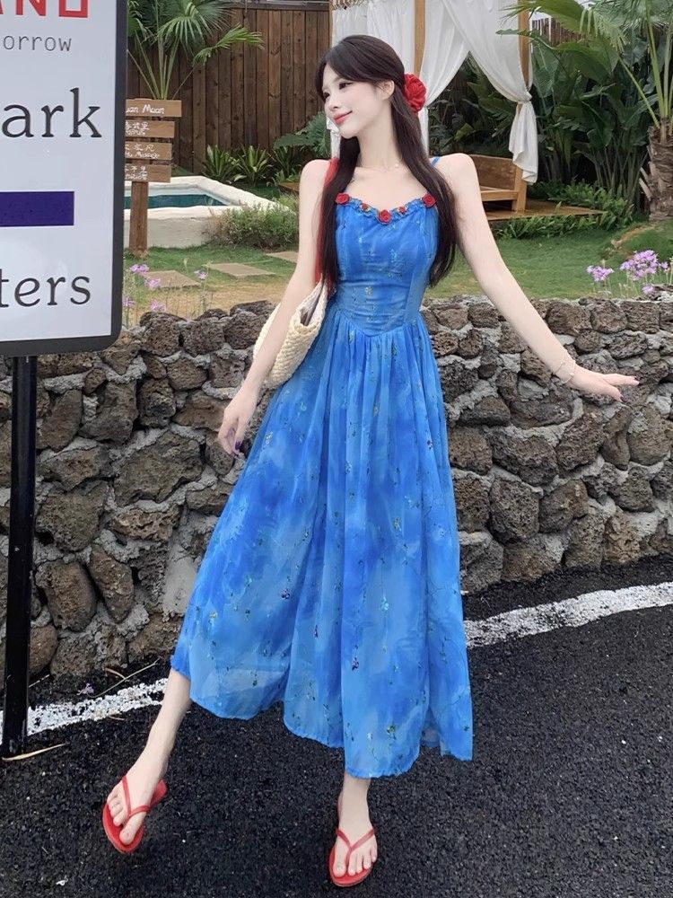 Verano Nuevo Rosa Francés Retro Suave Bordado Floral Estilo Vacacional Deseo Puro Adelgazante Commuter Vestido de Tirantes