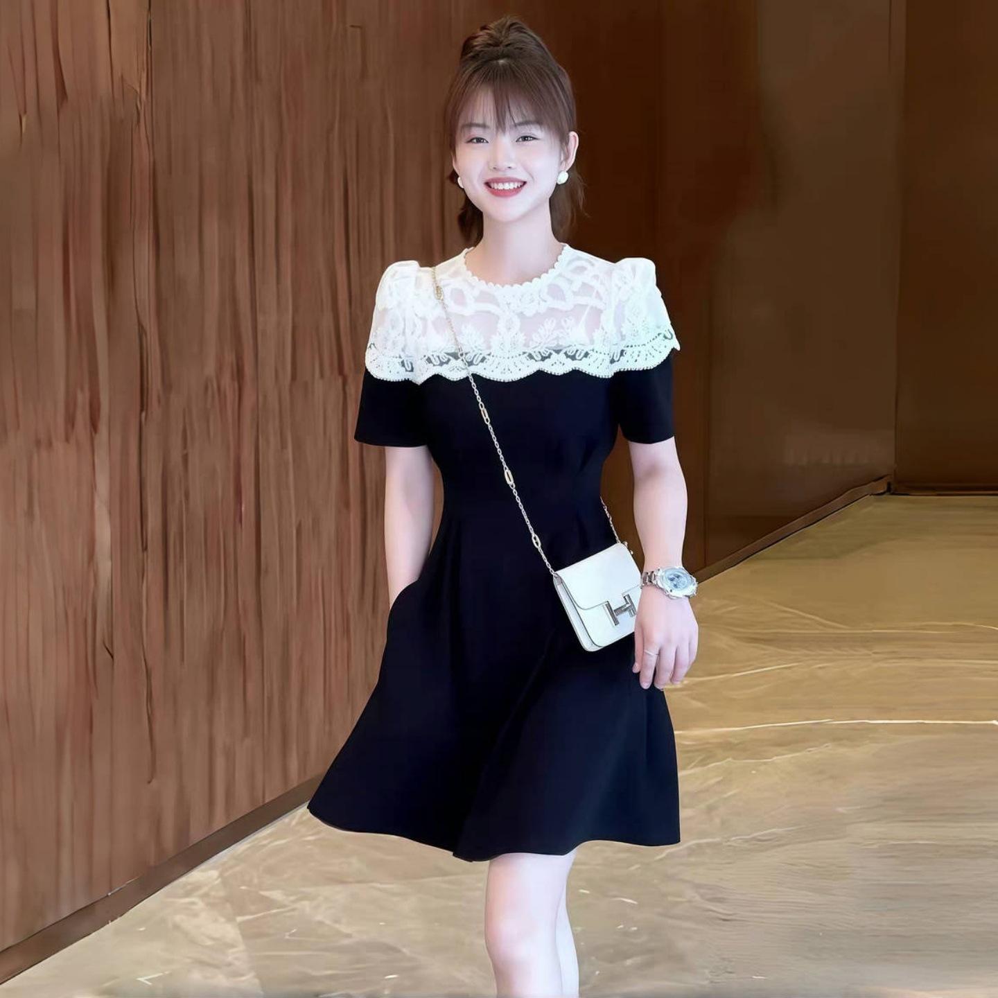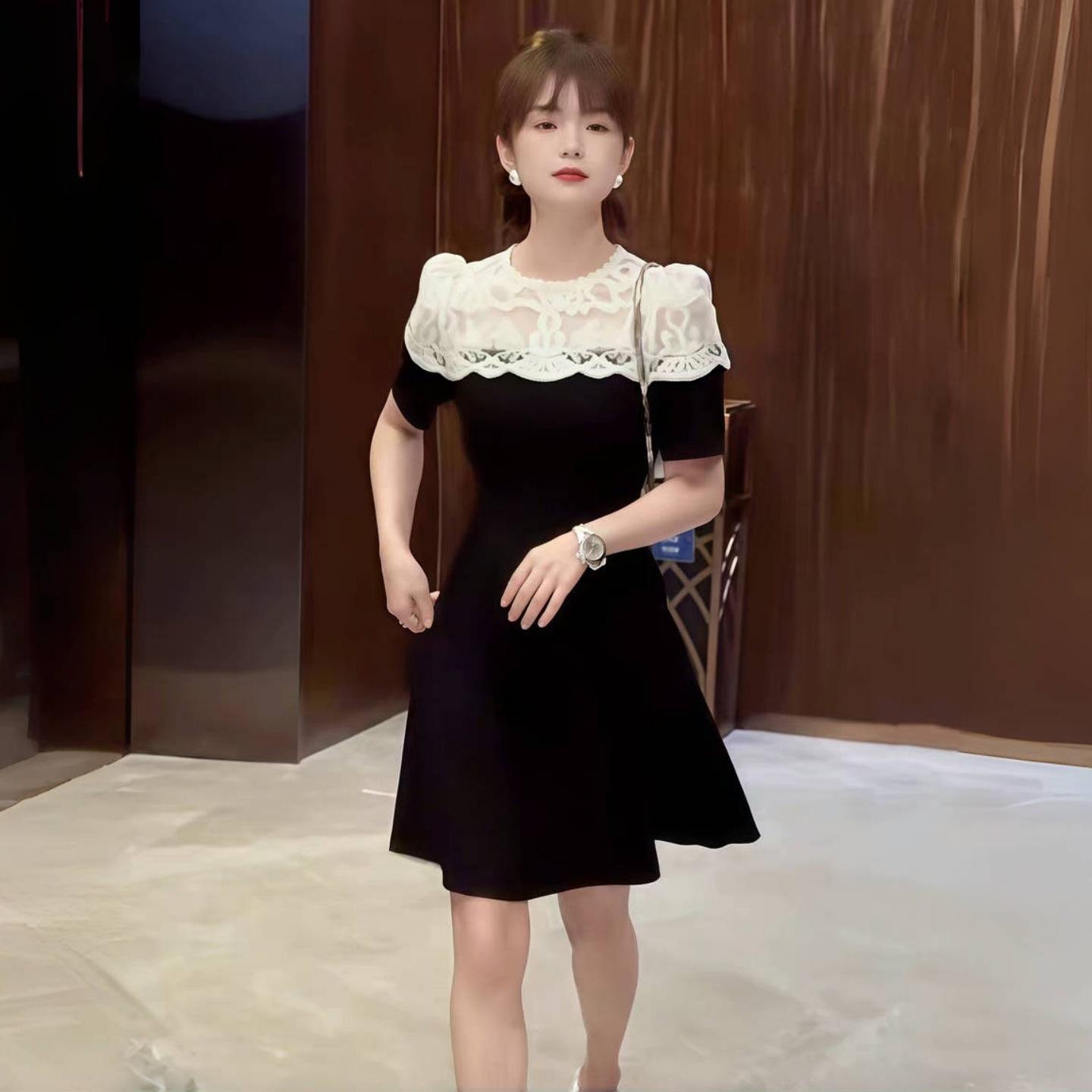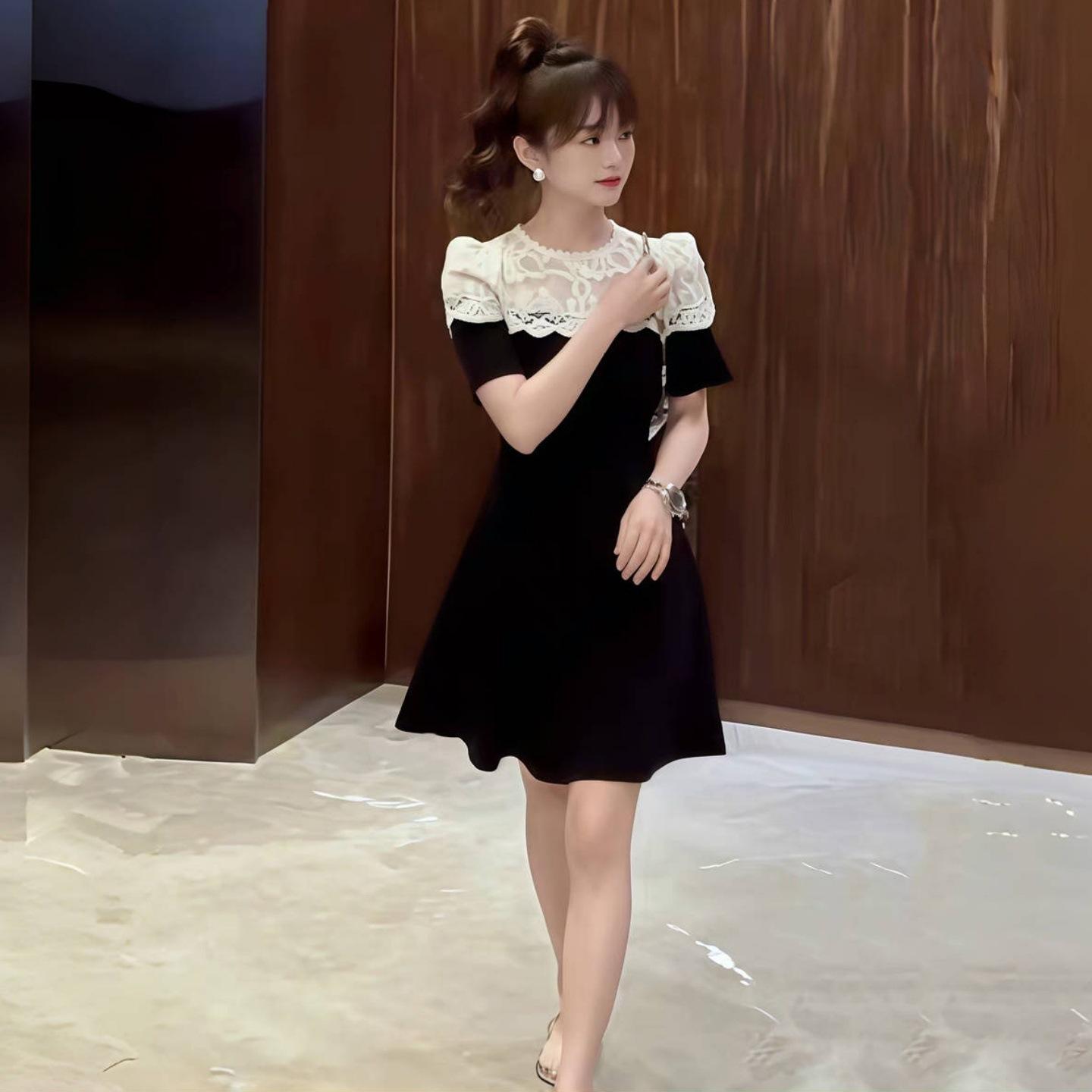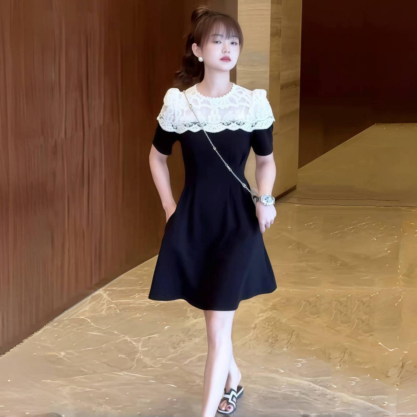 Vestido estilo francés para mujer, nuevo estilo de verano, vestido negro pequeño con encaje, falda midi adelgazante para personas pequeñas