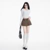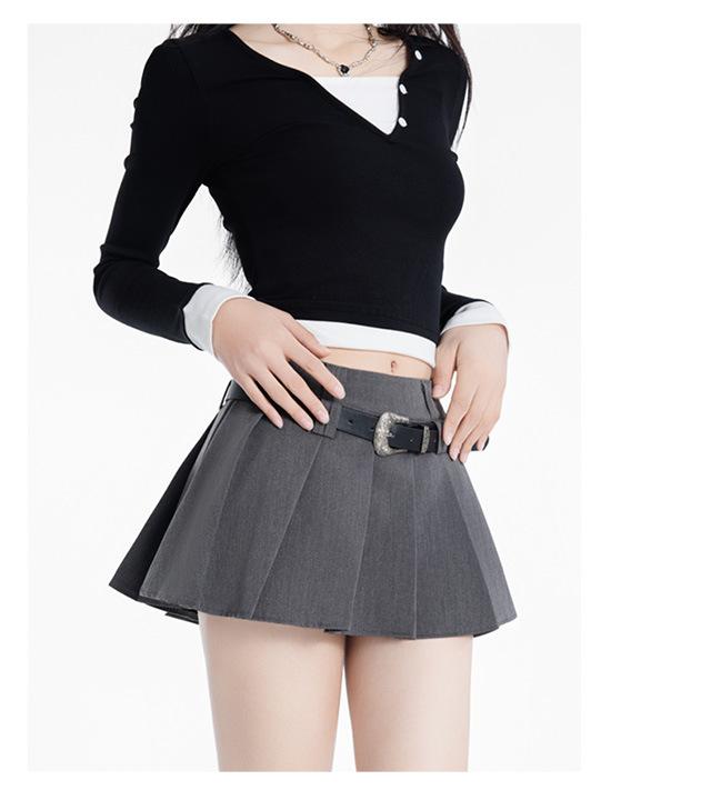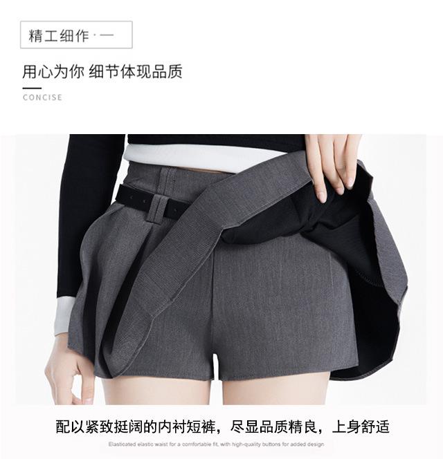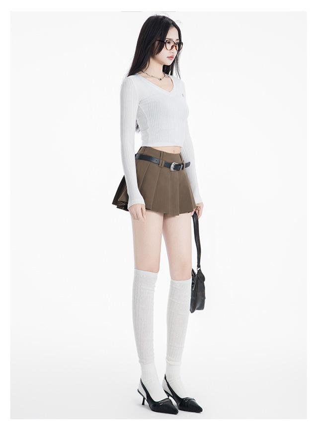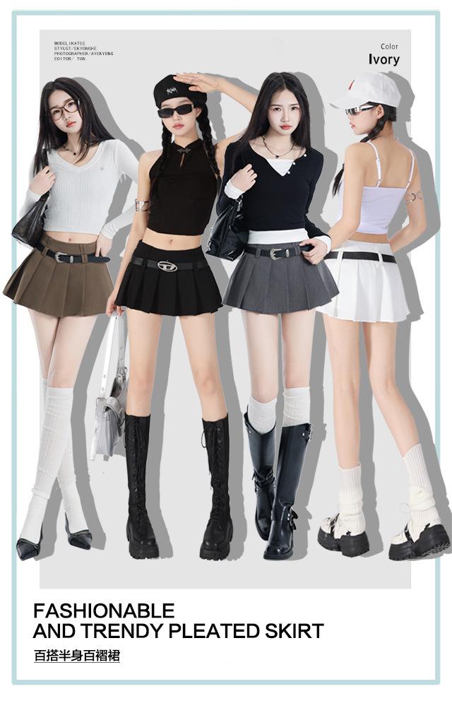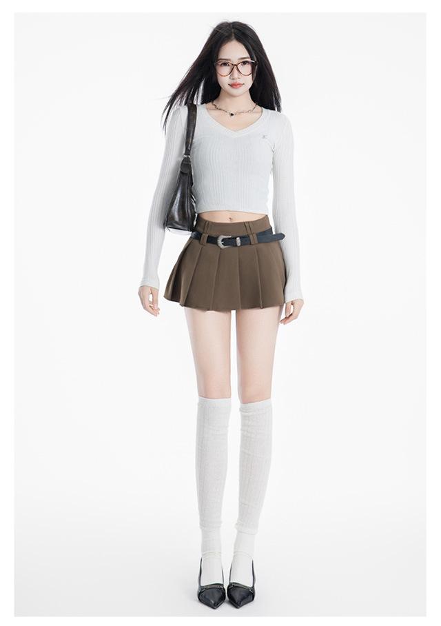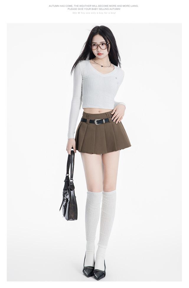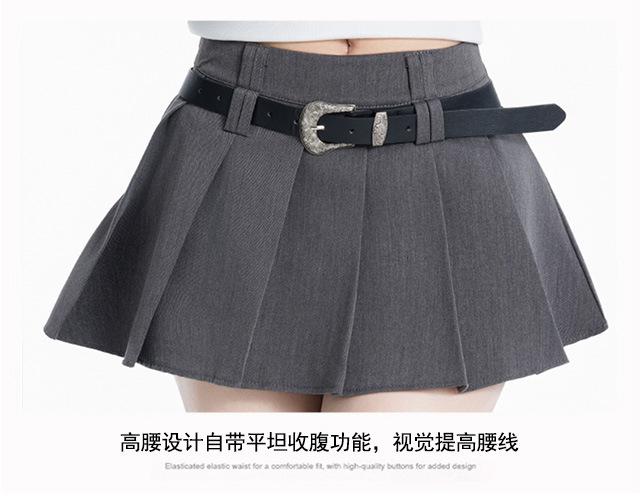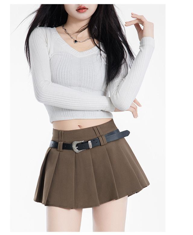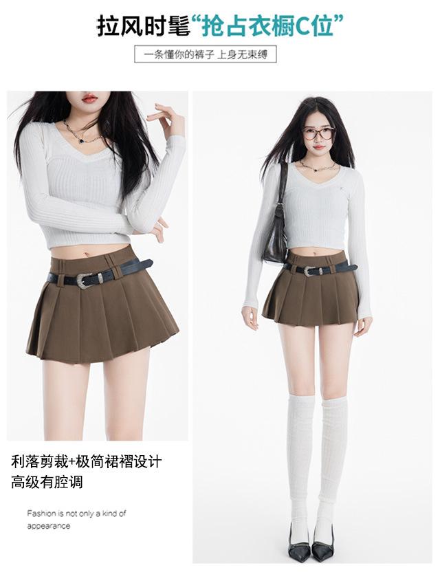 (Con cinturón forrado) Falda plisada adelgazante de cintura alta para chica caliente estilo americano, versátil, casual, línea A, falda corta marrón gris