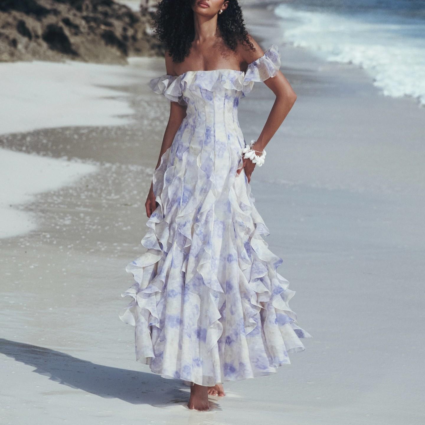 Falda de Tirantes Estilo Resort Costero Vestido de Playa Francés con Volantes Falda Larga Atmosférica Estilo Hada Elegante