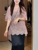 Camisa de Encaje Calado de Crochet Rosa para Mujer Verano Manga Corta Nuevo Estilo Francés Lazy Holgada y Versátil Top de Largo Medio