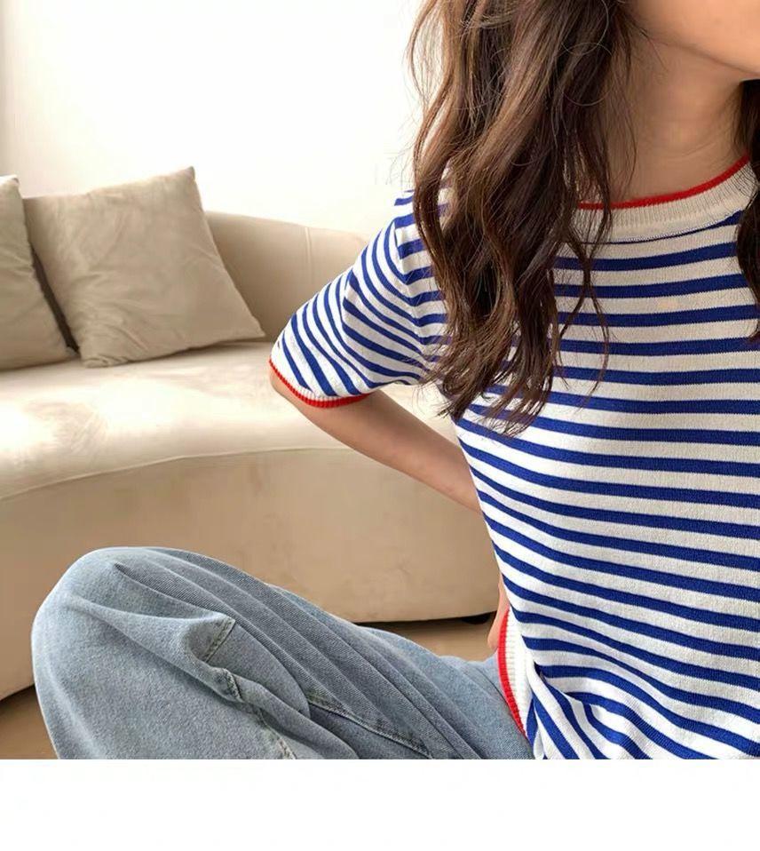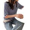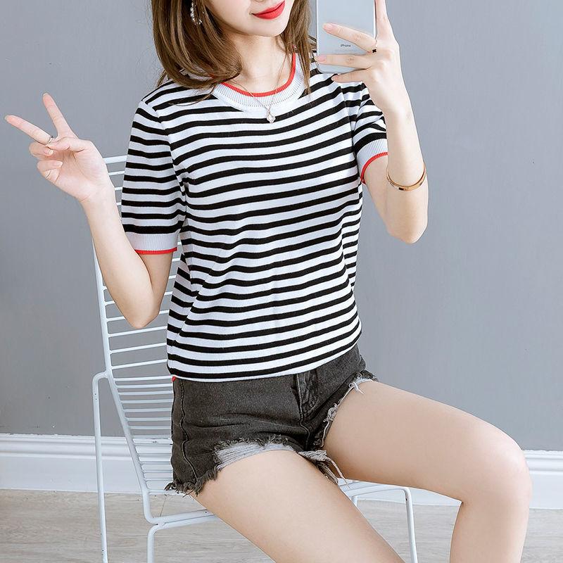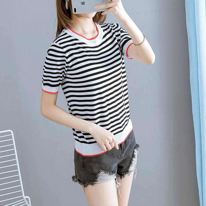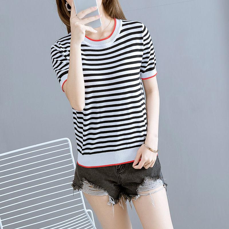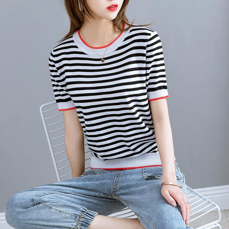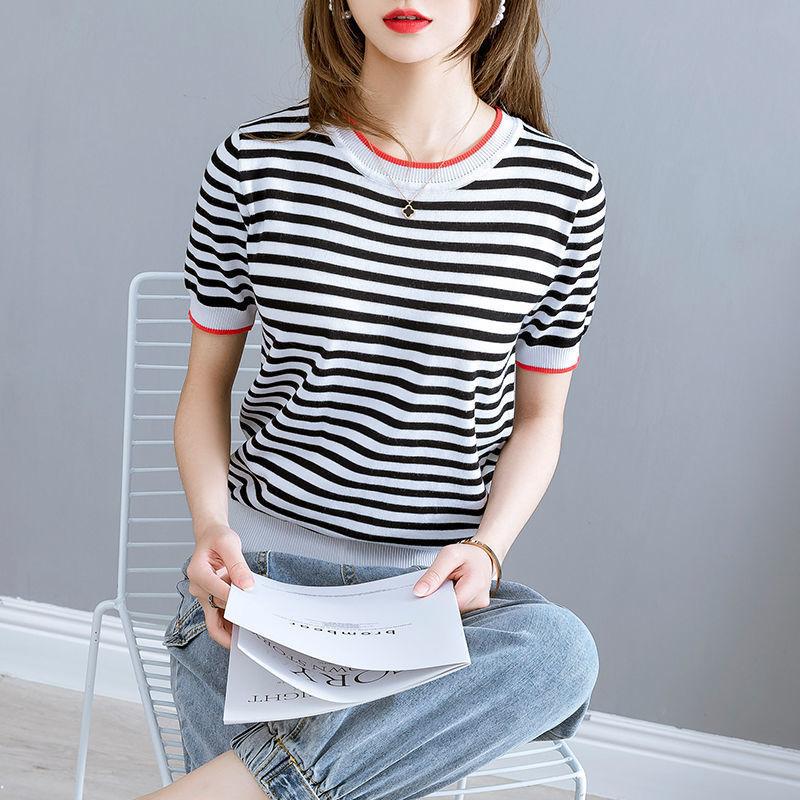 Verano Nuevo Estilo Pequeño Fresco Holgado Camisa Rayada Estilo de Mujer Tejido Manga Corta Trendy Estilo Fino Seda Helada Mujer