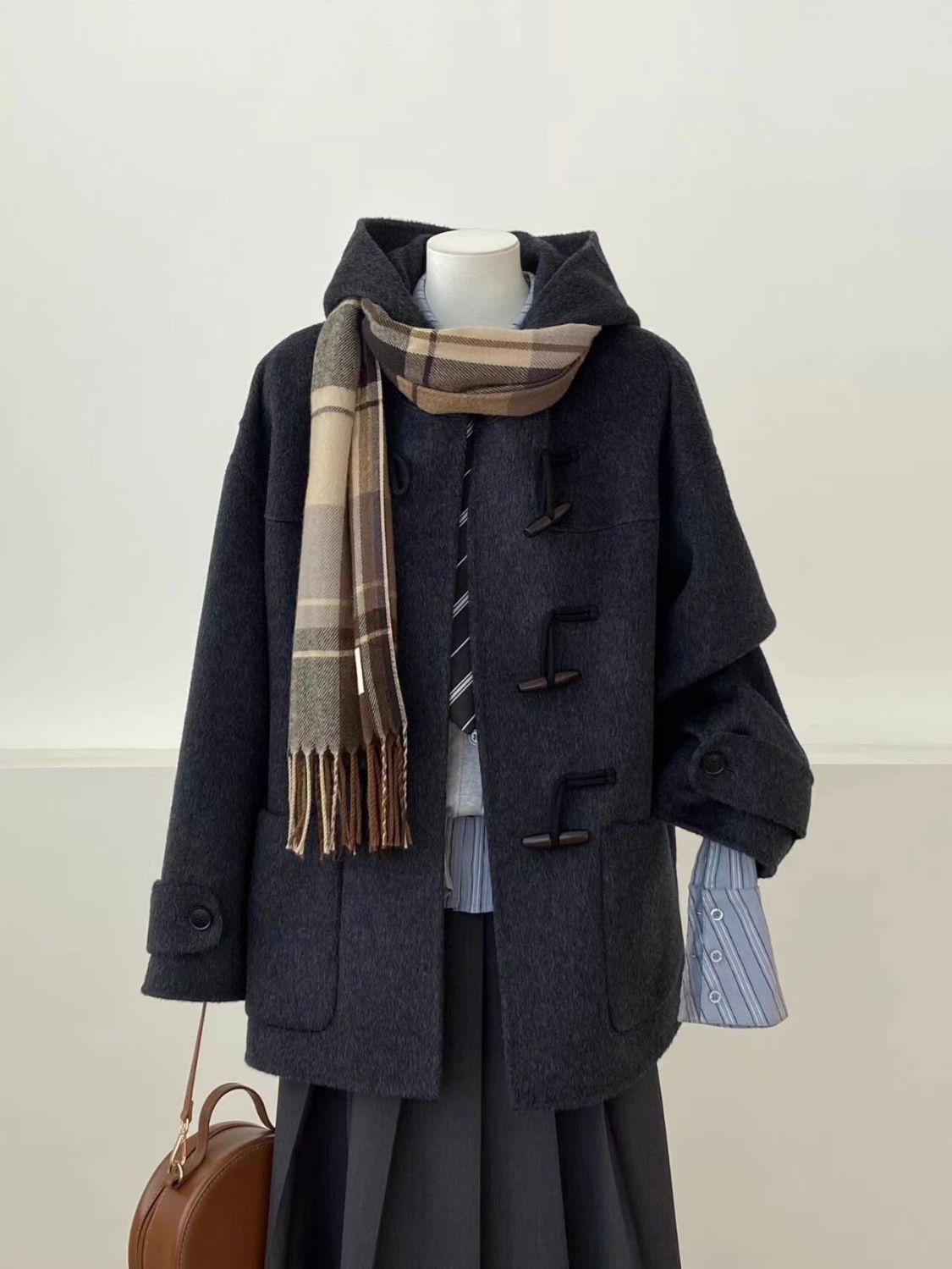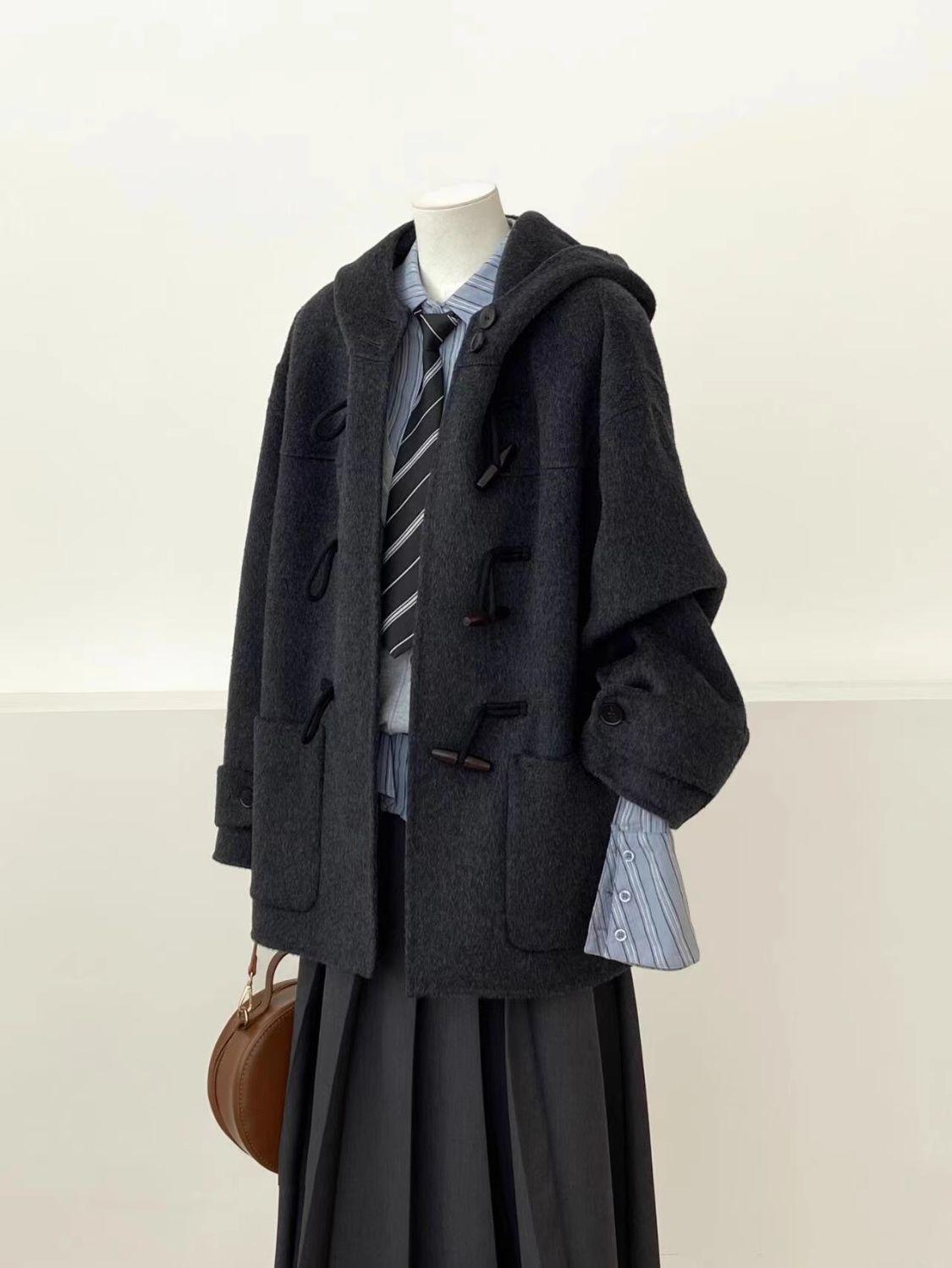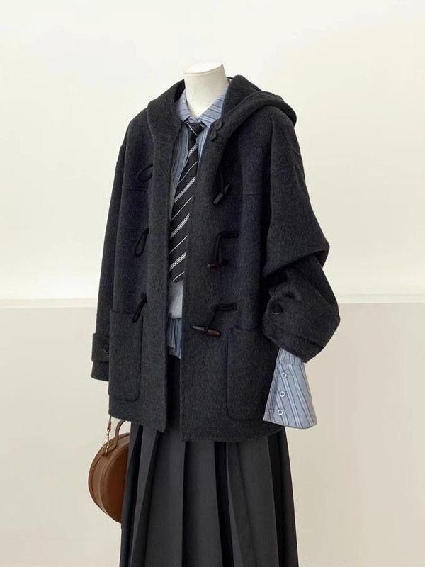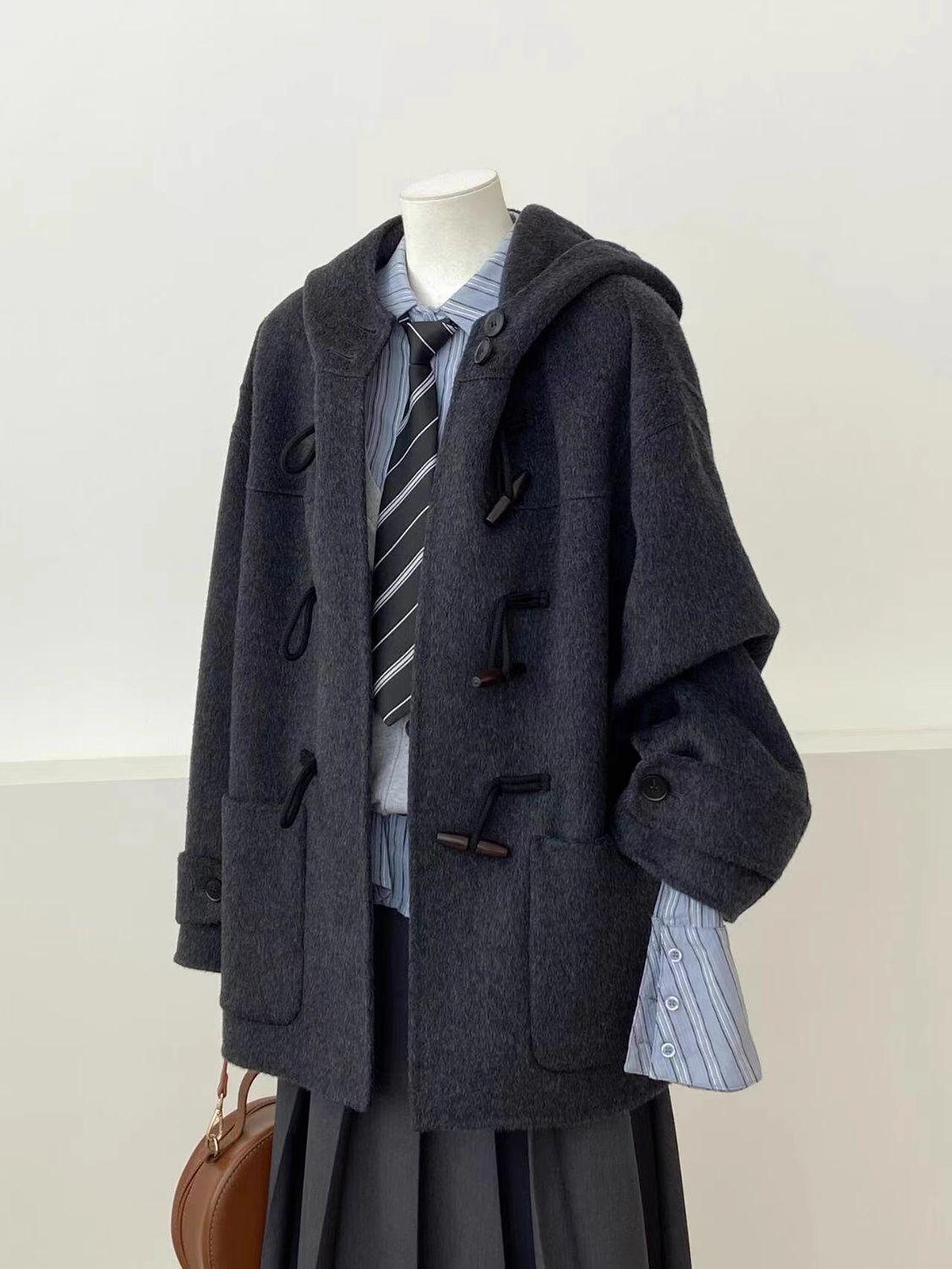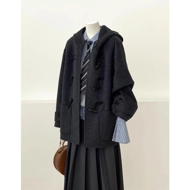 Abrigo de Lana con Capucha y Botones de Cuerno para Mujer Otoño e Invierno 2025 Estilo Coreano Abrigo de Lana para Mujer con Moda de Alta Gama