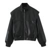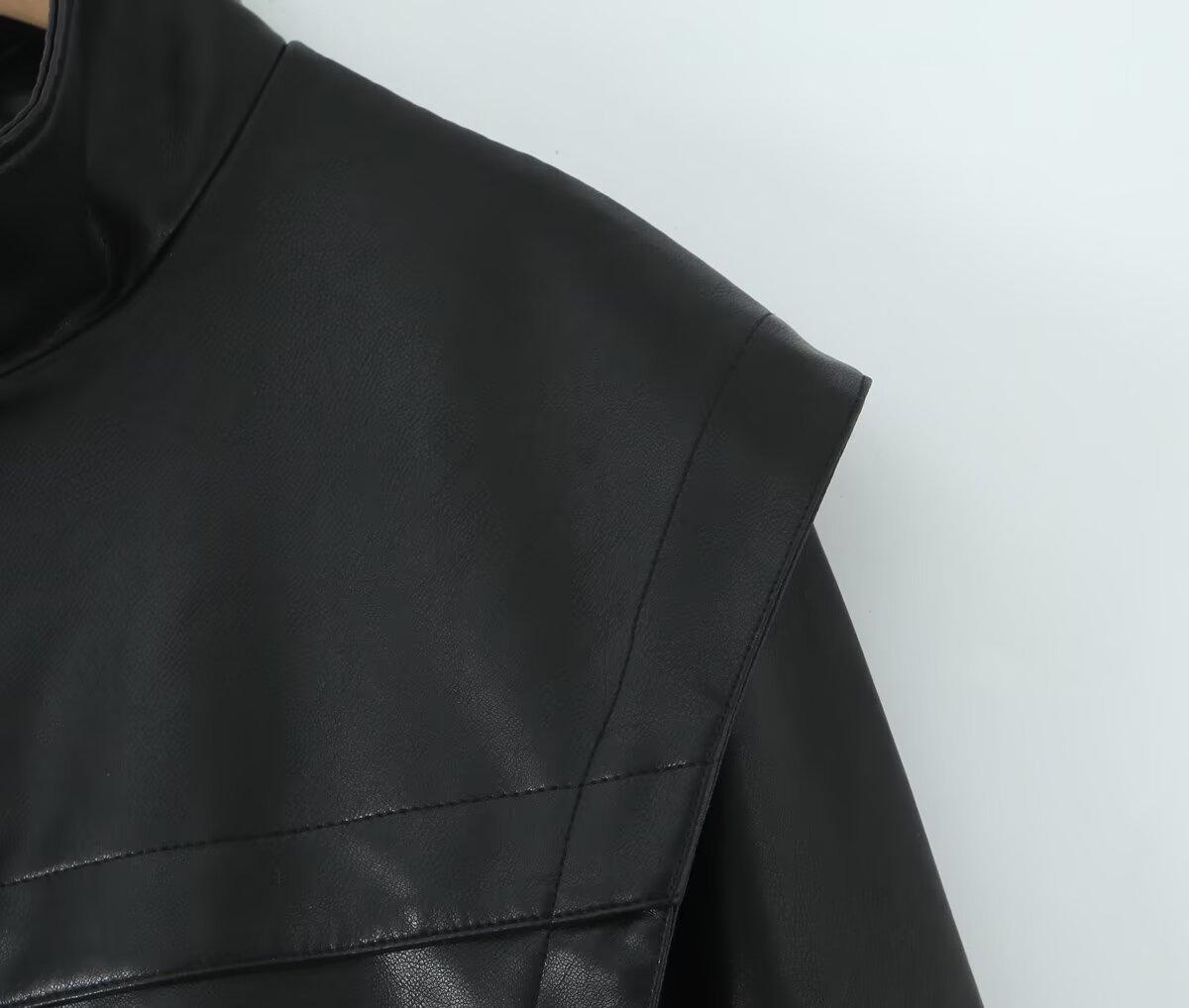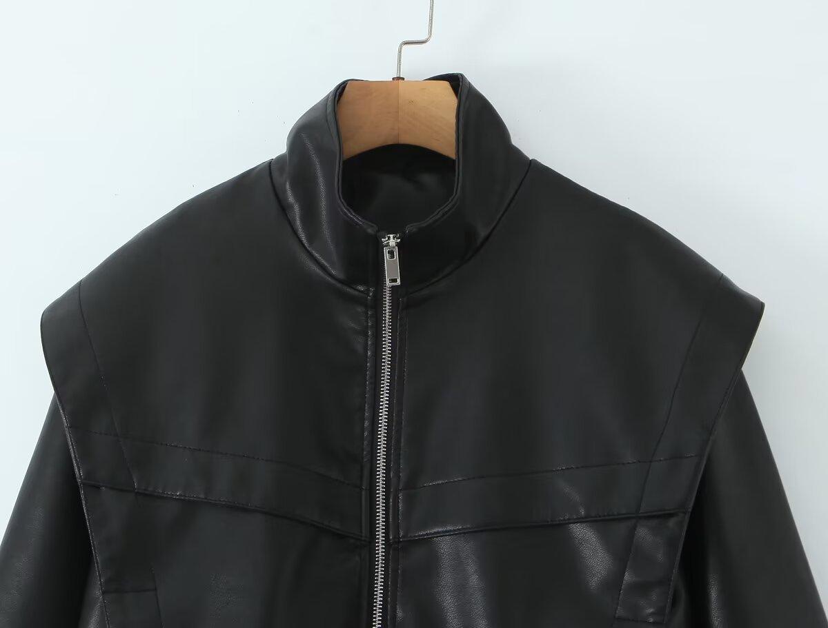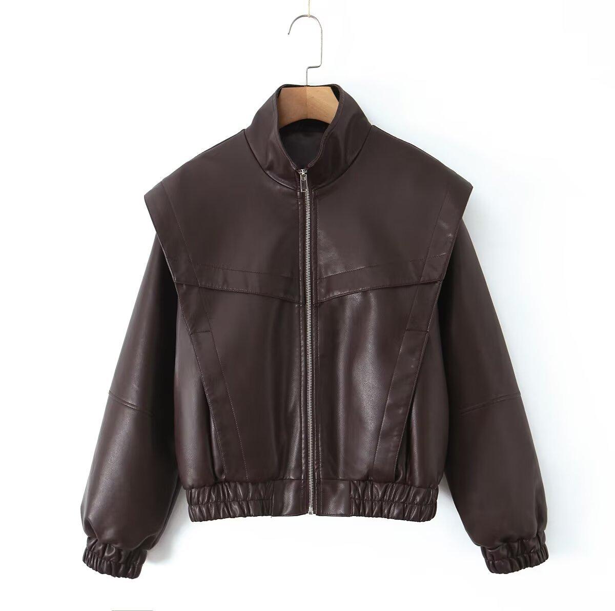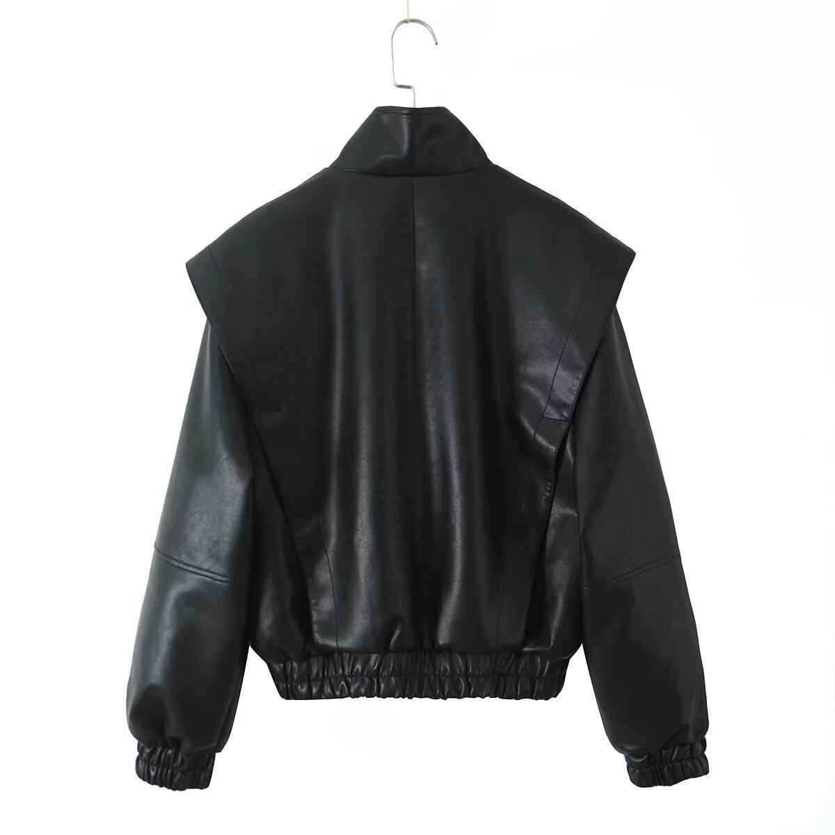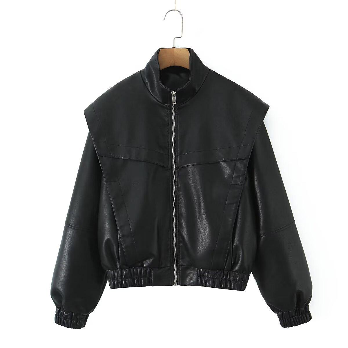 Ropa de Mujer Transfronteriza Europea y Americana 2025 Otoño Nuevo Estilo Retro Diseño de Hombro Grande Chaqueta con Cierre de Cuero PU Top