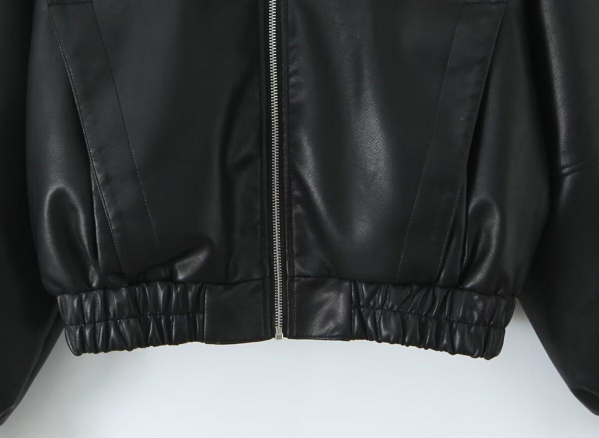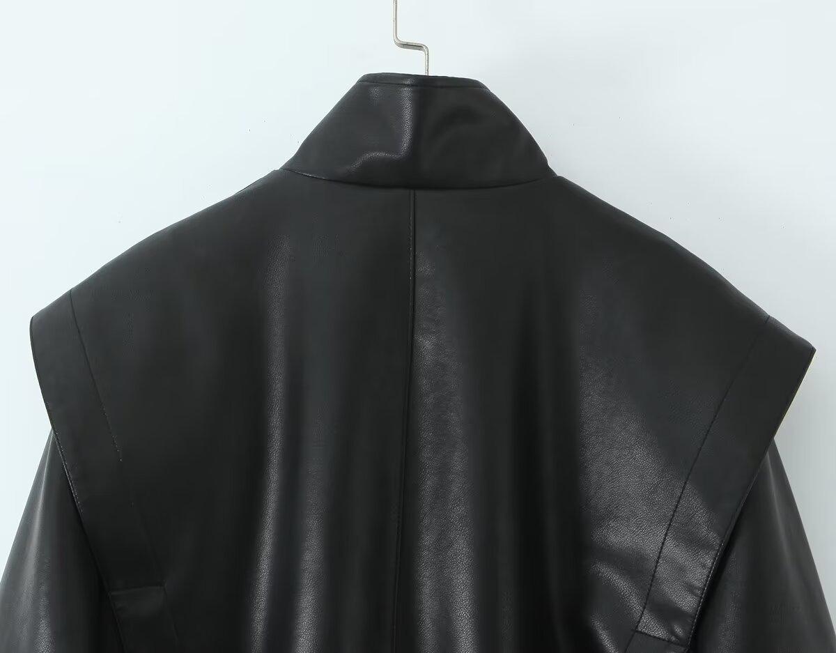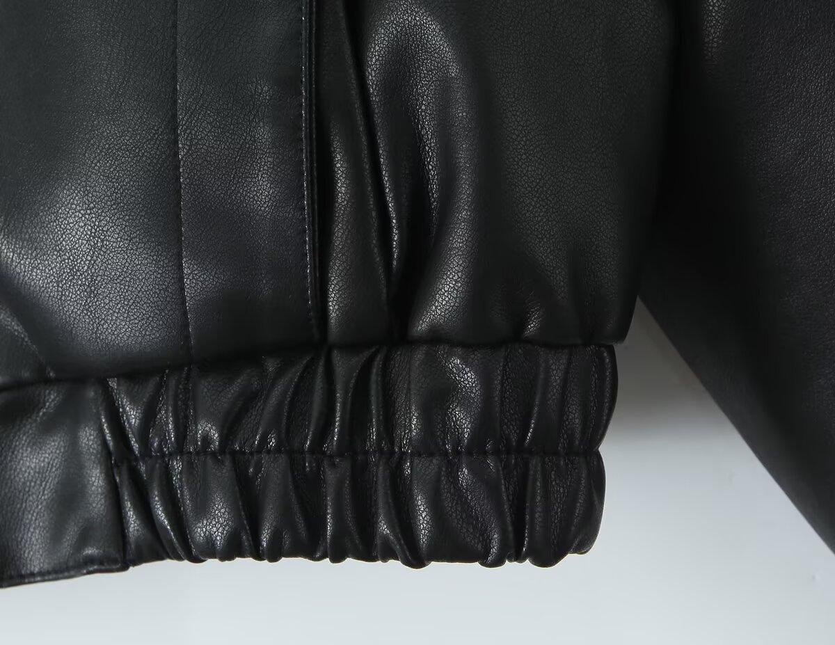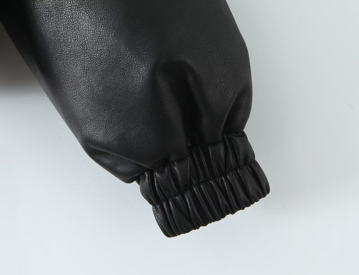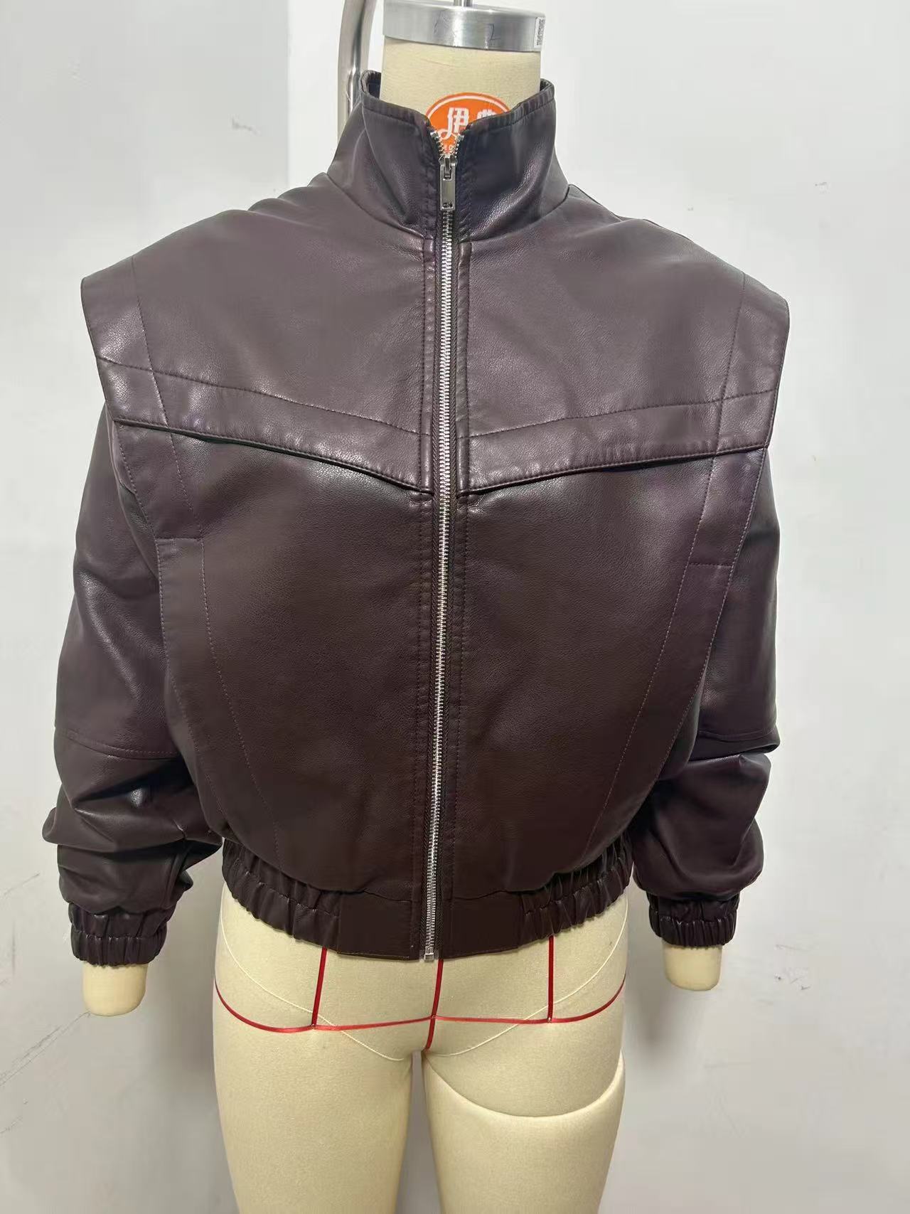Ropa de Mujer Transfronteriza Europea y Americana 2025 Otoño Nuevo Estilo Retro Diseño de Hombro Grande Chaqueta con Cierre de Cuero PU Top