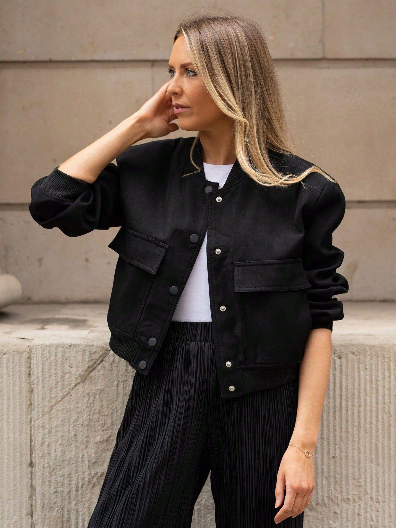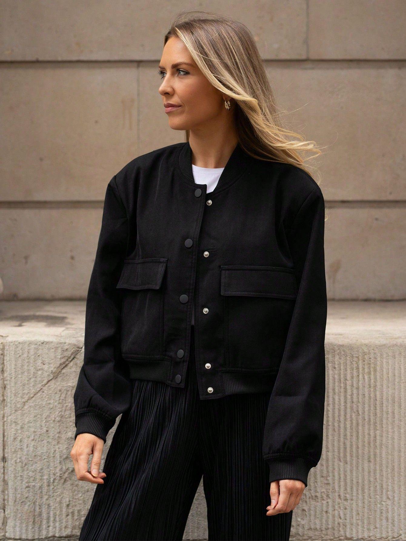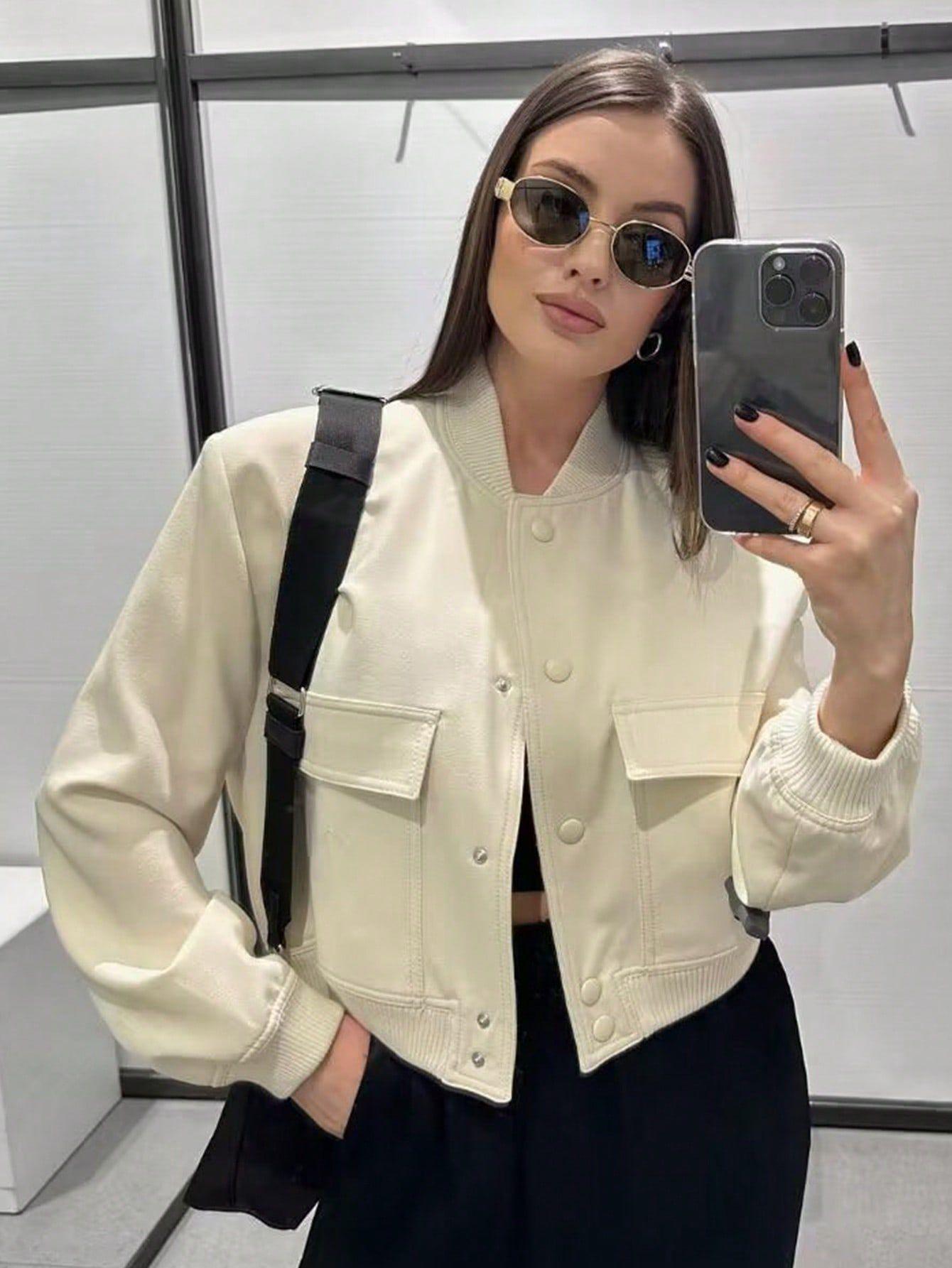 Ropa Popular de Primavera y Otoño para Mujer Transfronteriza 2 Colores Aliexpress Europea y Americana Cuello Alto Bolsillo Grande Chaqueta Abrigo de Mujer