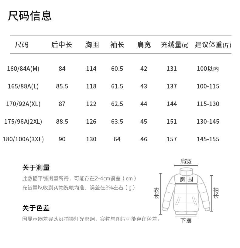 160/M, 165/L, 170/XL, 175/2XL, 180/3XL