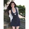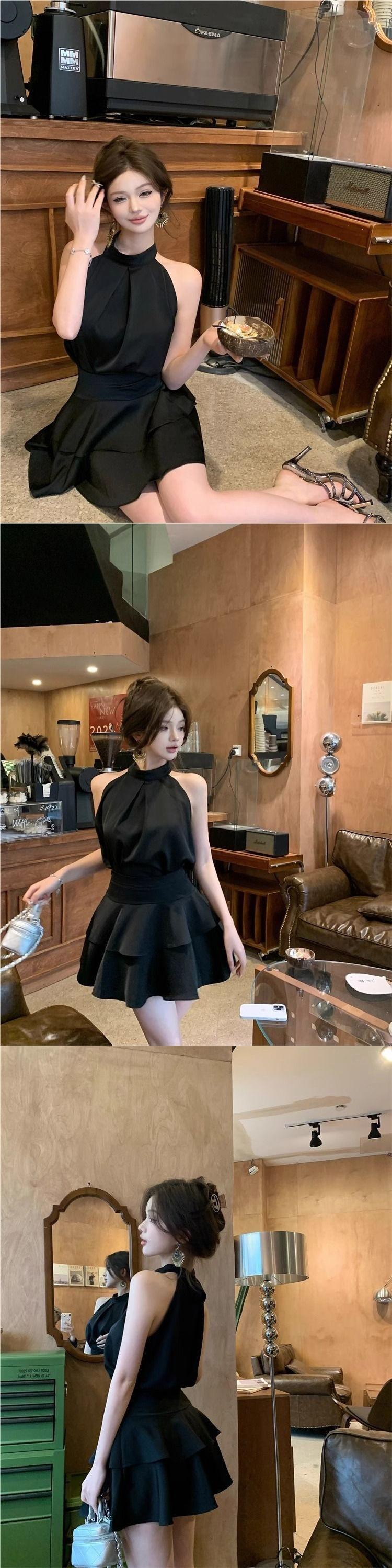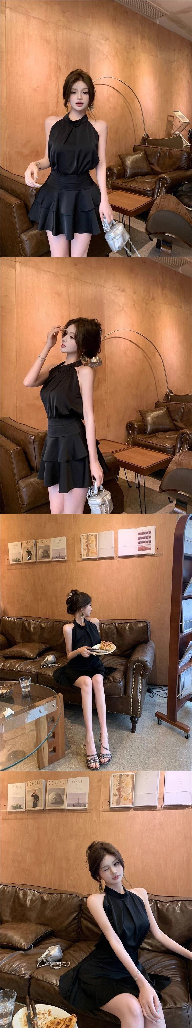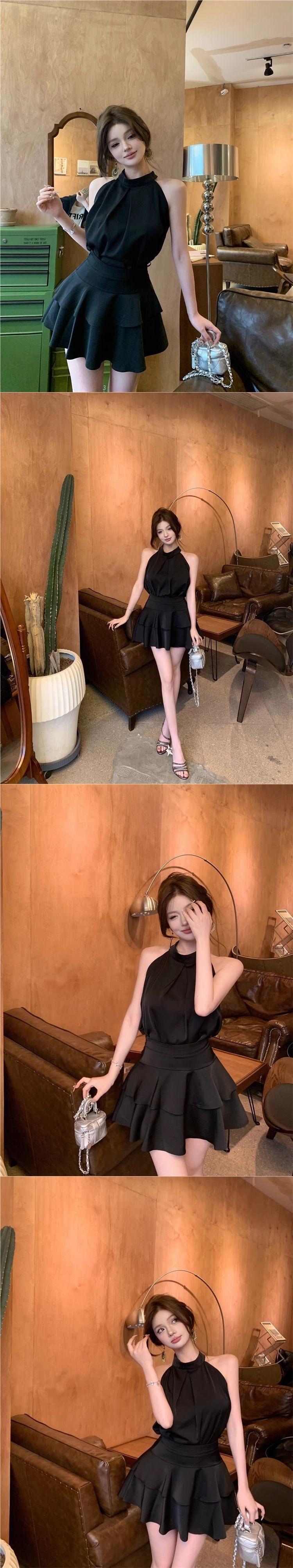 Top Chaleco Halter sin Mangas para Mujer en Verano, Falda Pastel con Volantes de Aspecto Adelgazante, Elegante Conjunto de Dos Piezas