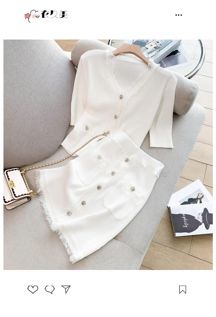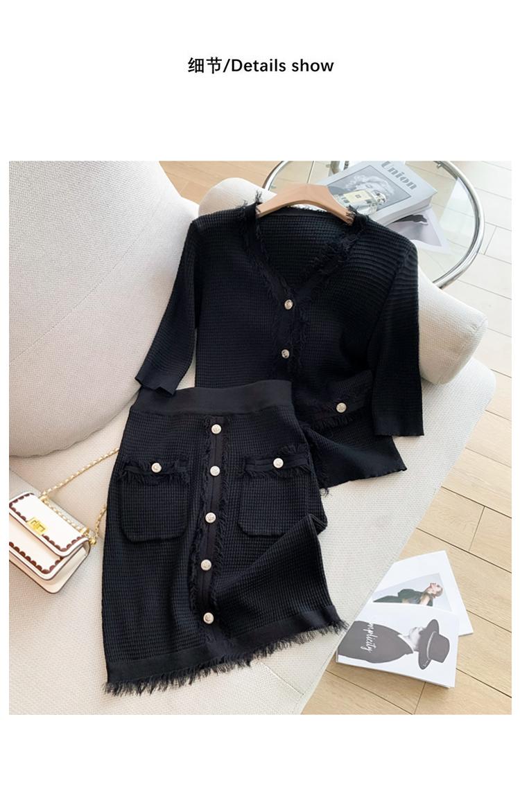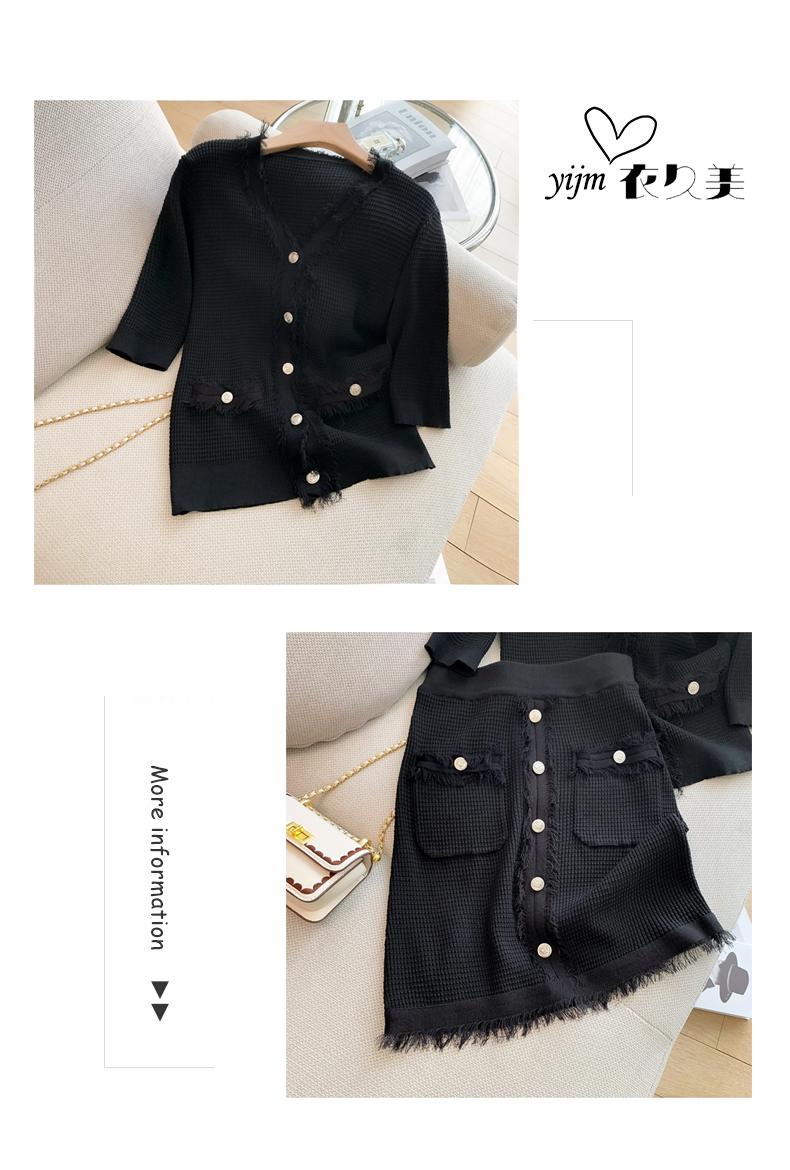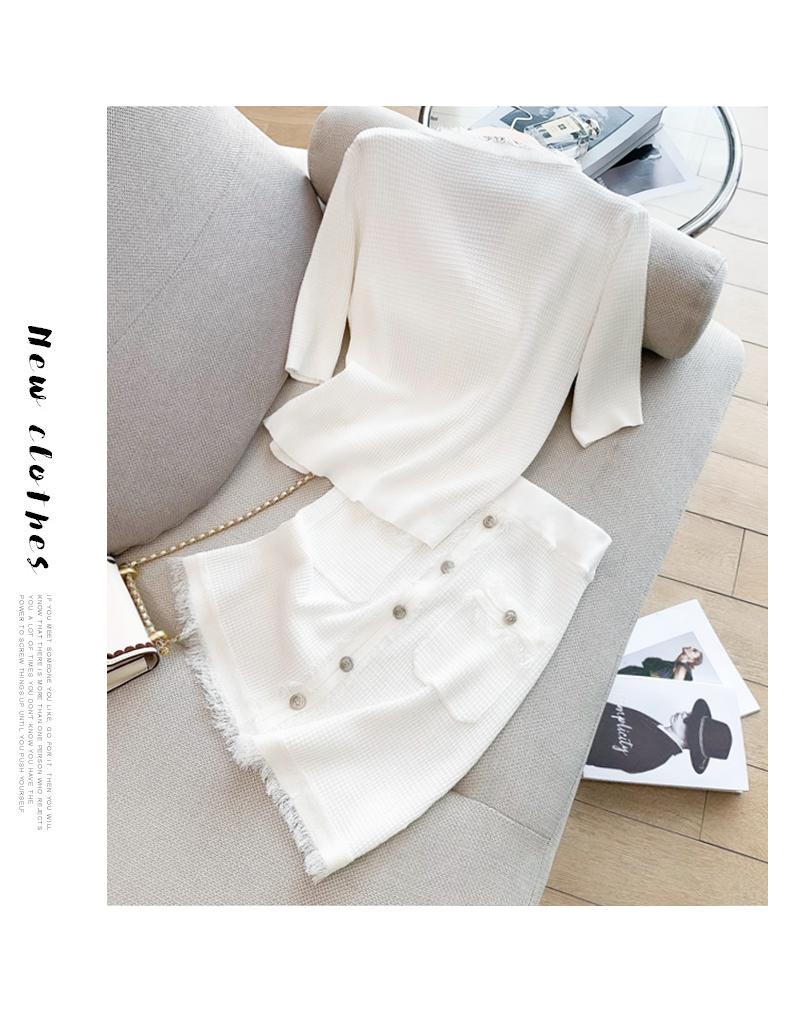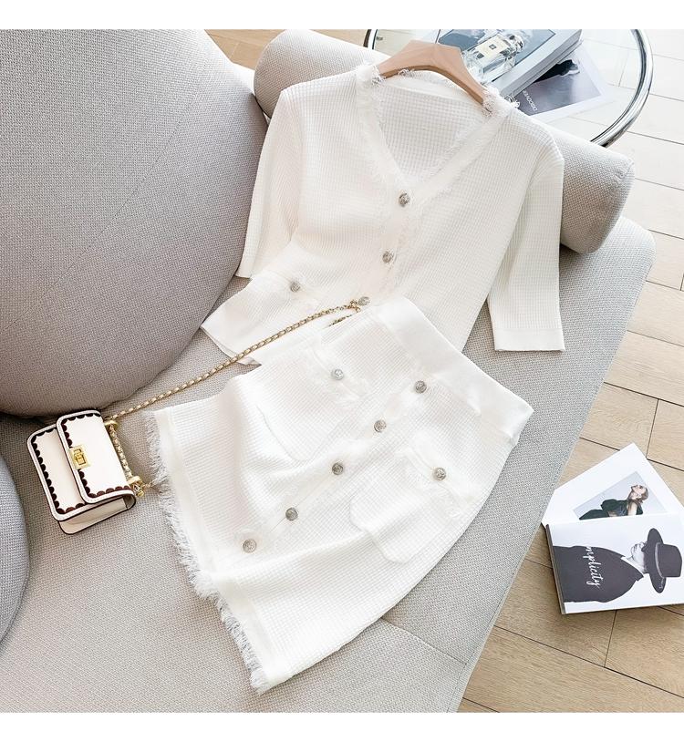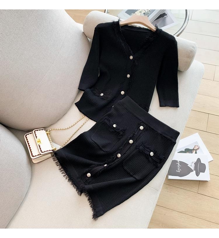 Conjunto de Dos Piezas de Verano para Mujer Estilo Tweed Color Puro Cuello en V Cárdigan de Punto Top de Manga Cinco Cuartos + Traje de Falda Falda Corta