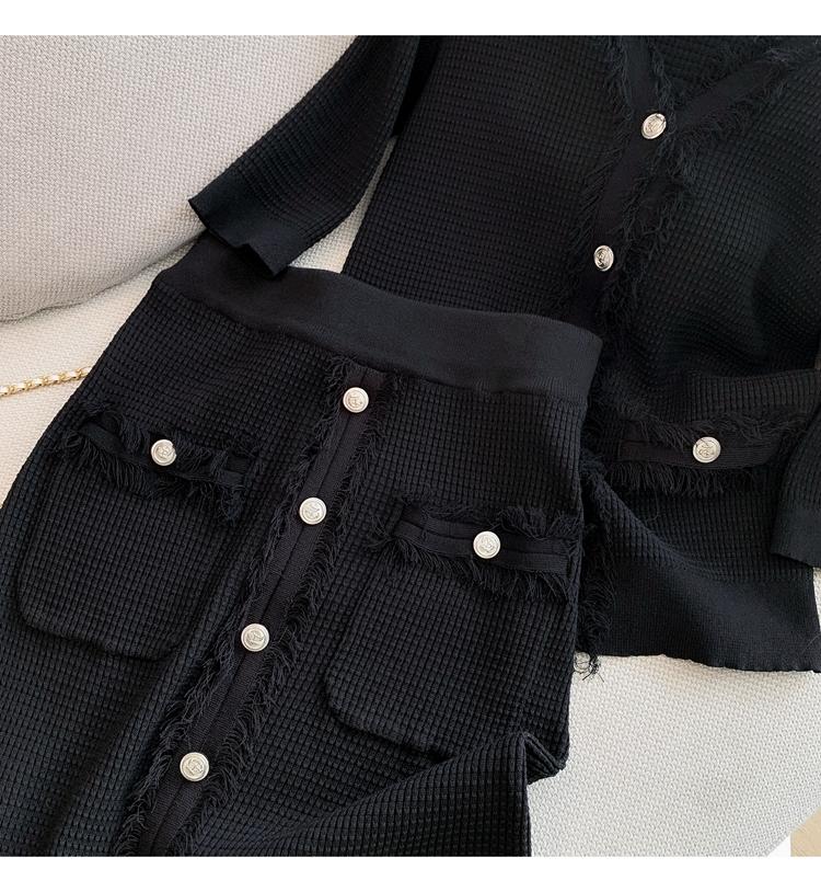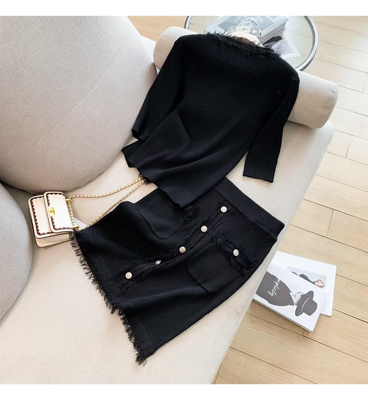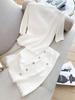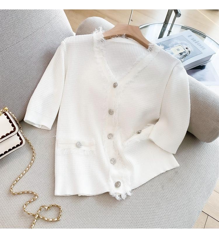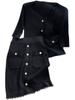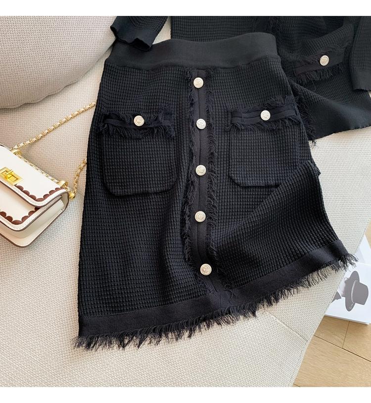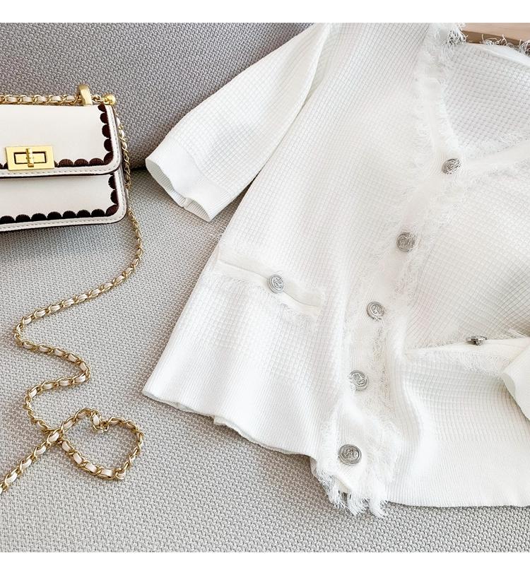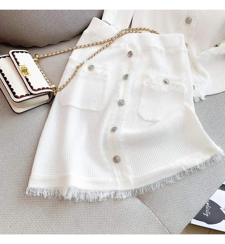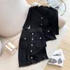 Conjunto de Dos Piezas de Verano para Mujer Estilo Tweed Color Puro Cuello en V Cárdigan de Punto Top de Manga Cinco Cuartos + Traje de Falda Falda Corta