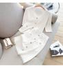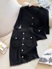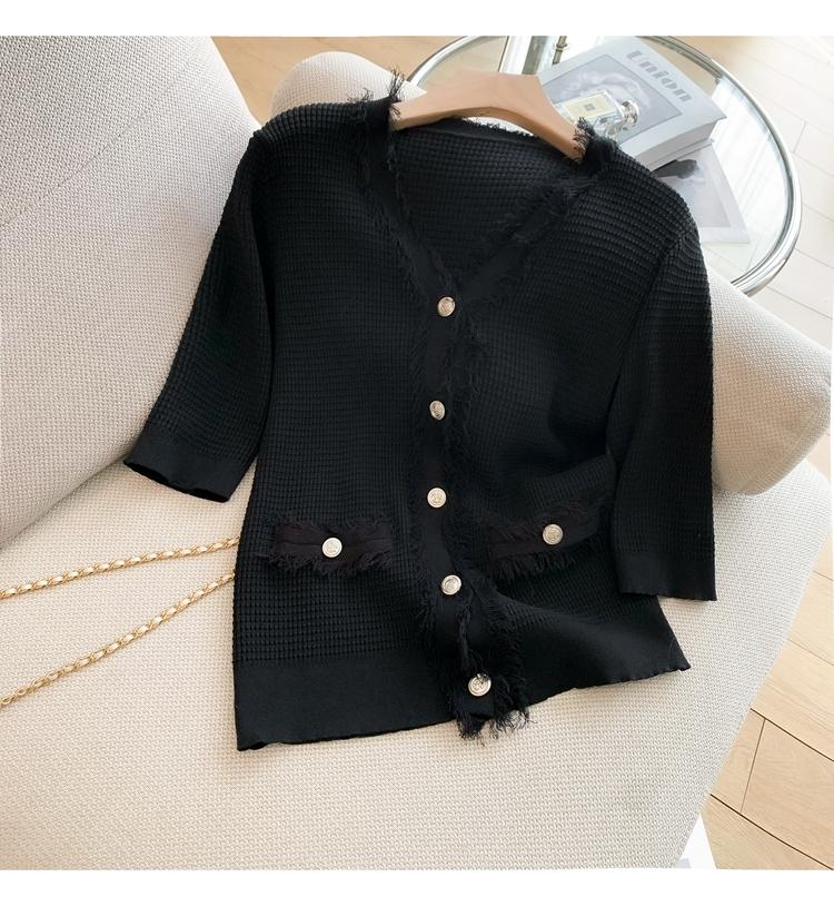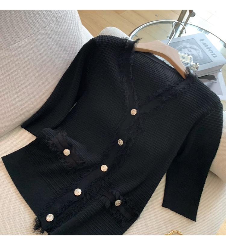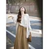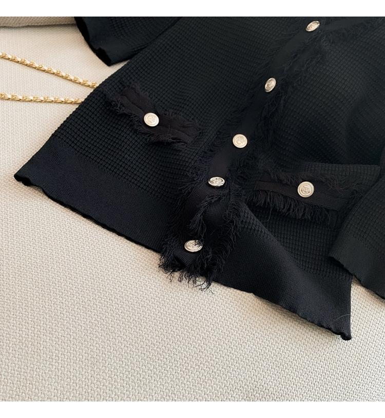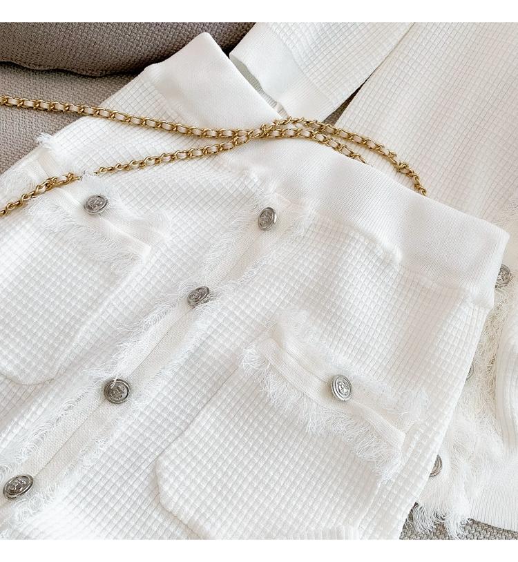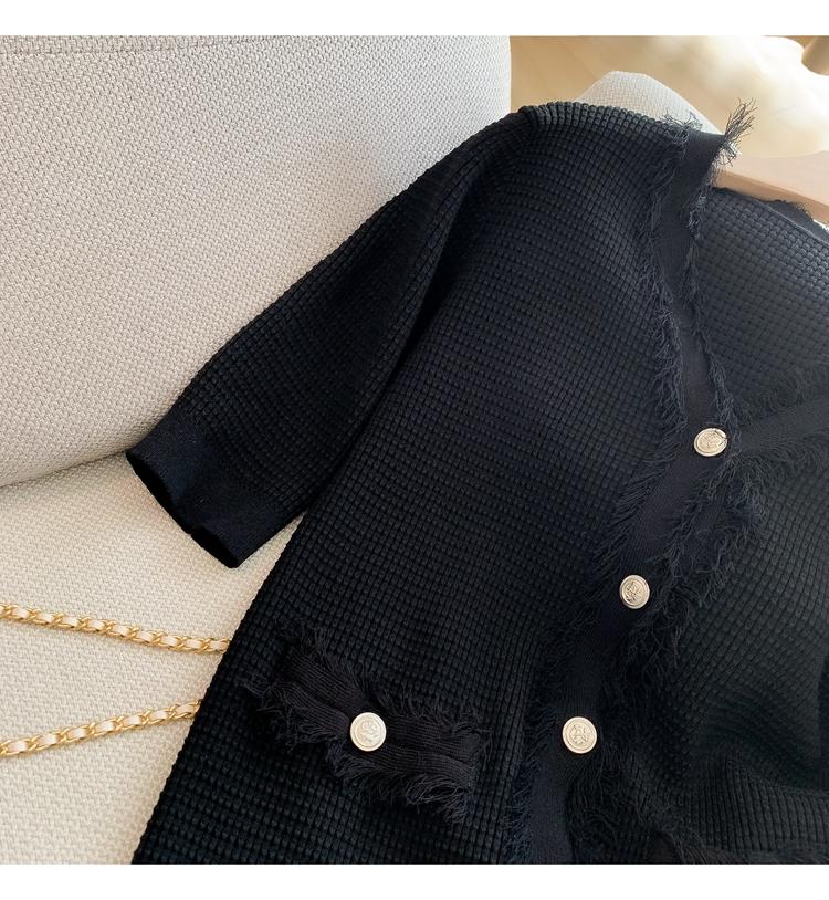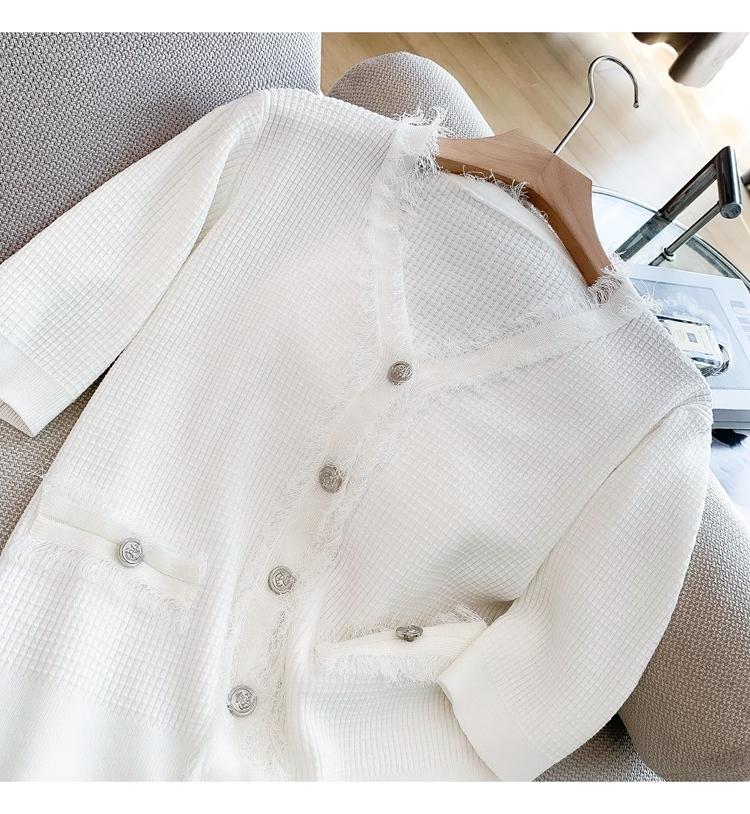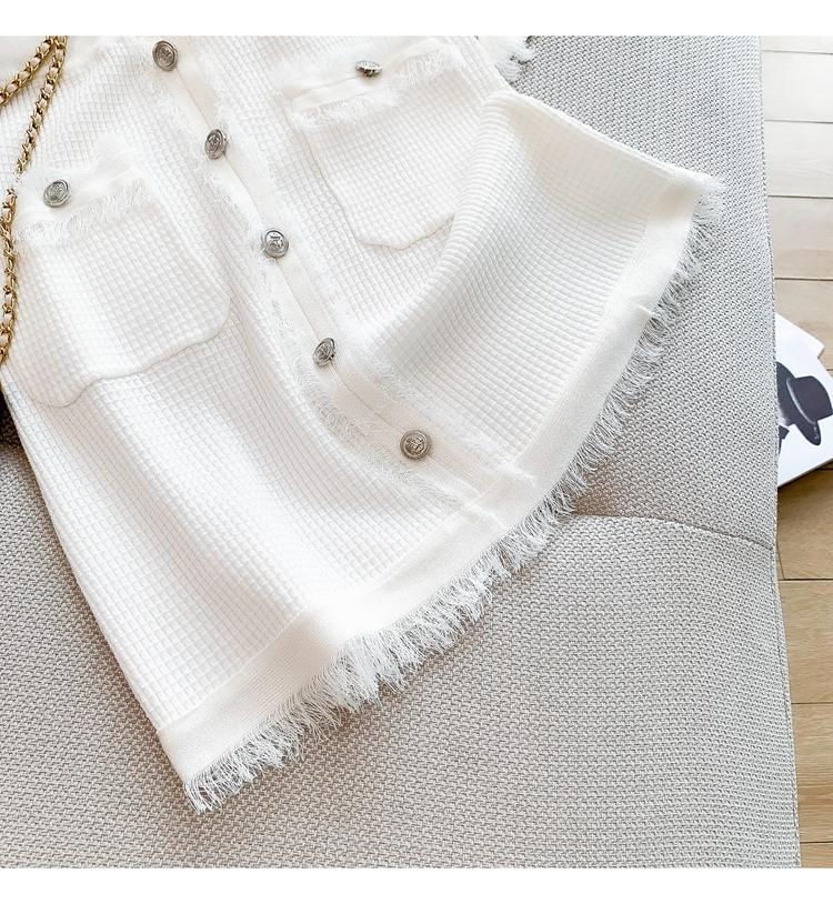 Conjunto de Dos Piezas de Verano para Mujer Estilo Tweed Color Puro Cuello en V Cárdigan de Punto Top de Manga Cinco Cuartos + Traje de Falda Falda Corta
