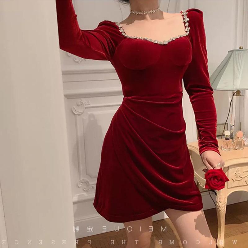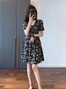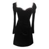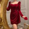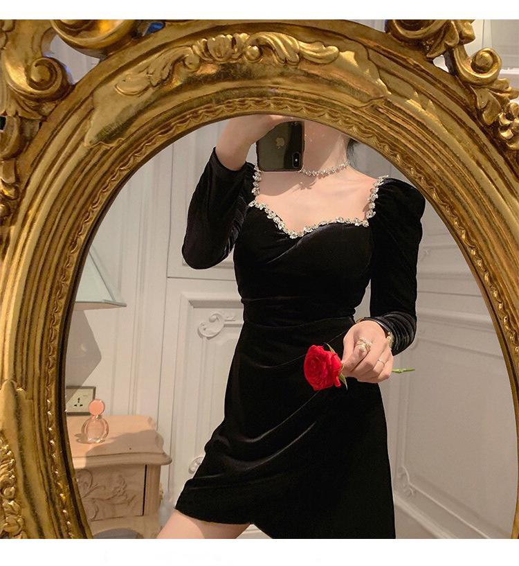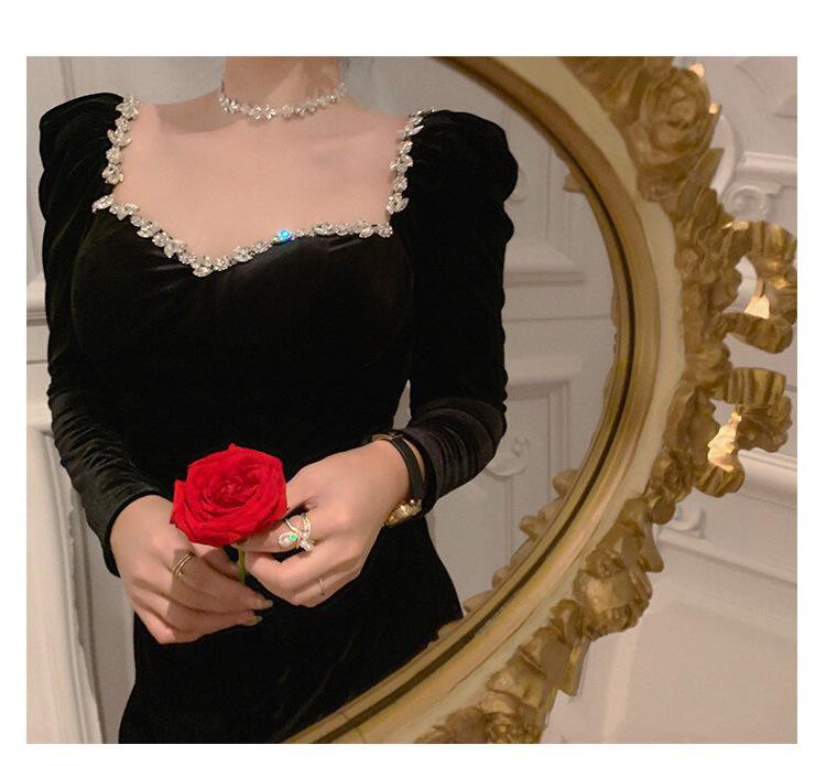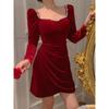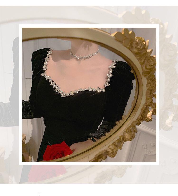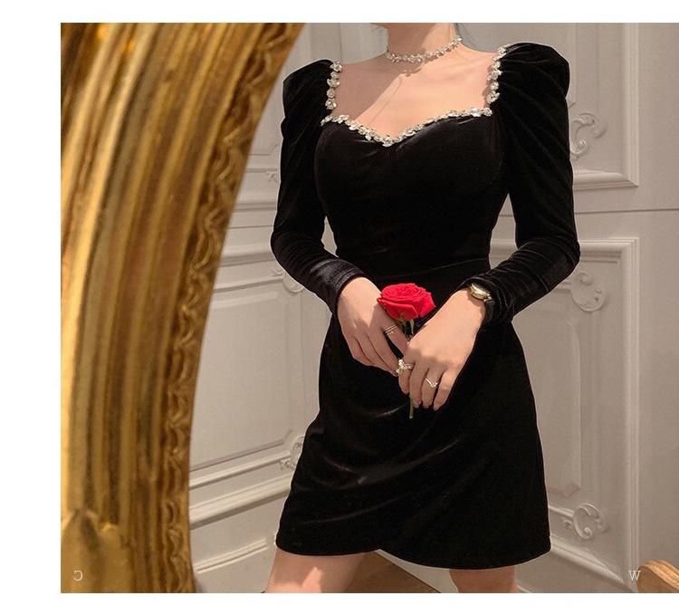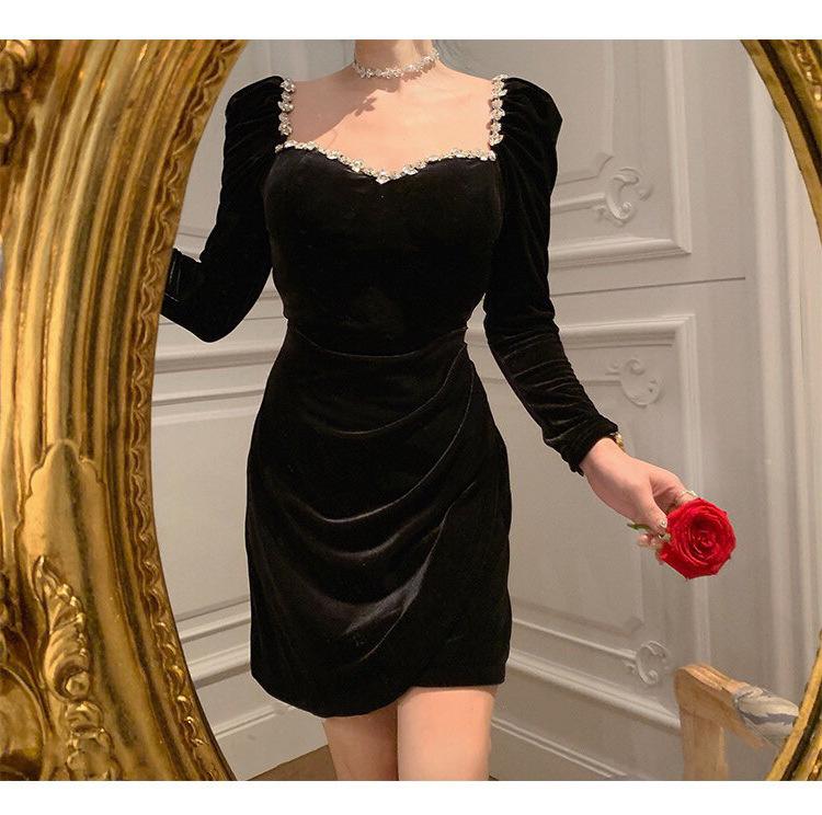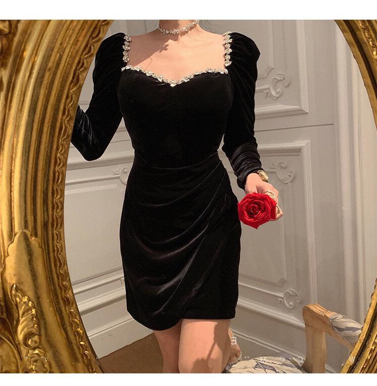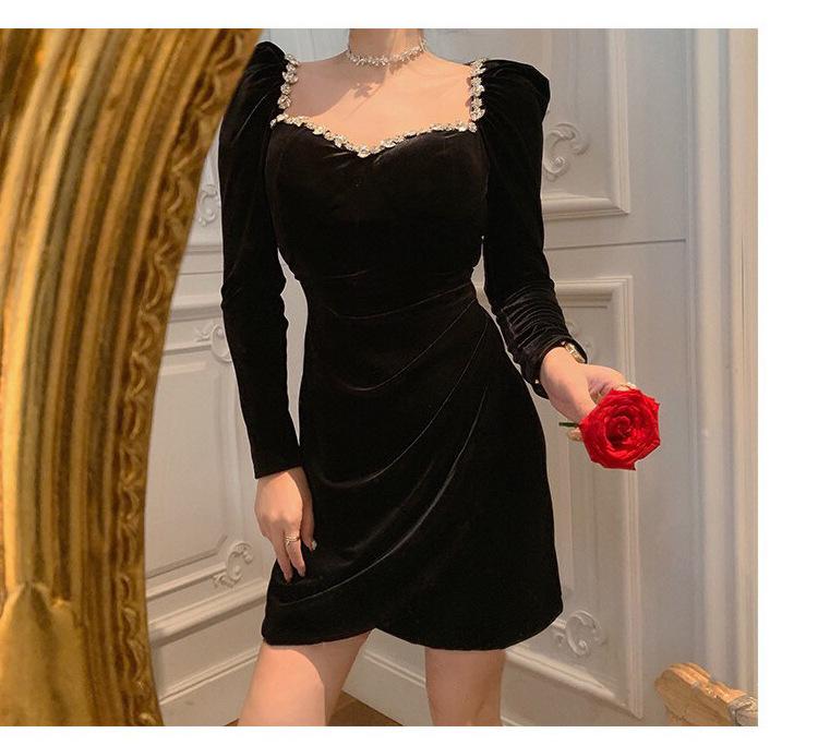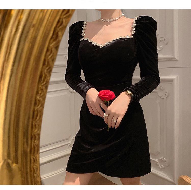 Primavera 2021 Nuevo Vestido Negro Corto Retro Francés Estilo Ligeramente Maduro Elegante Cuello Cuadrado Manga Larga Adelgazante Vestido de Fiesta