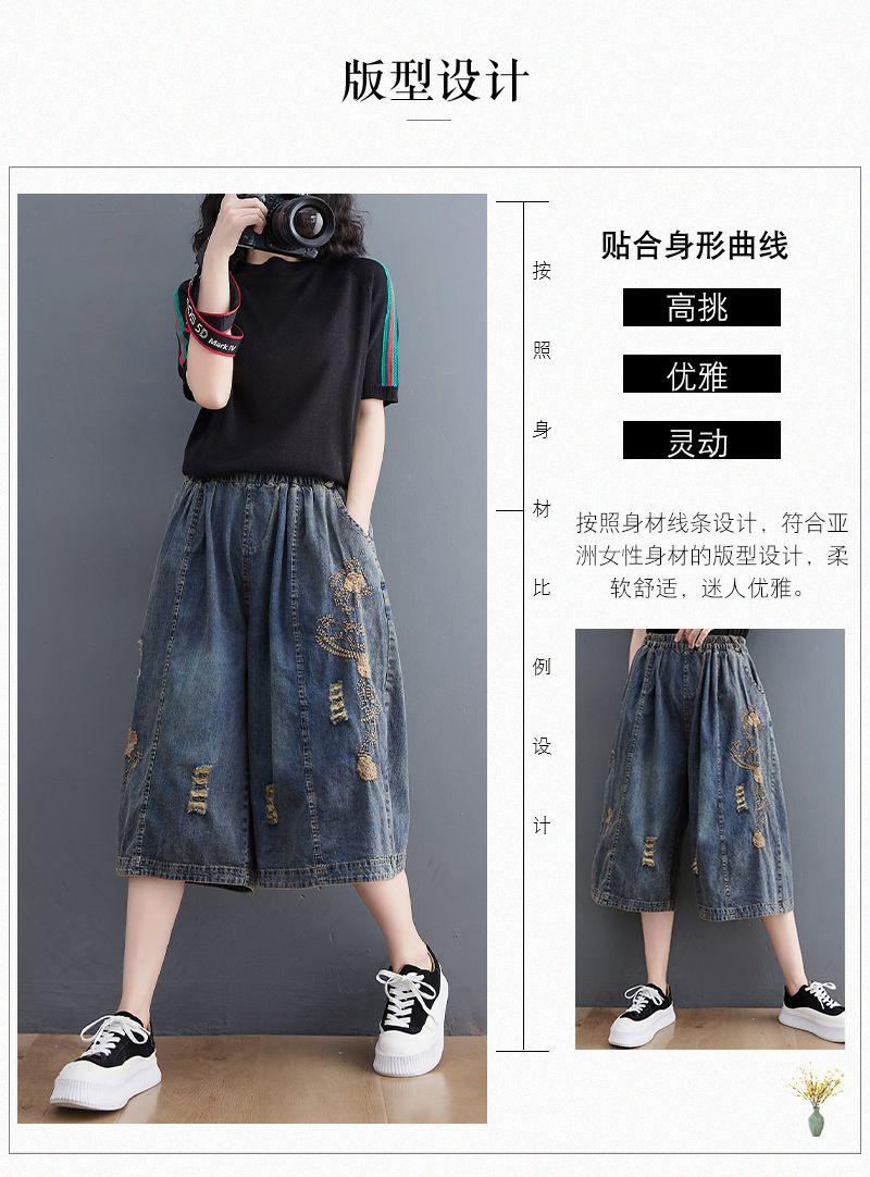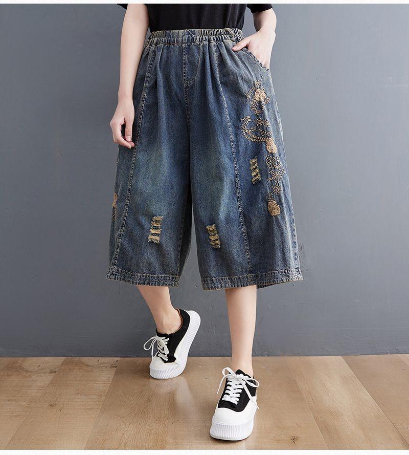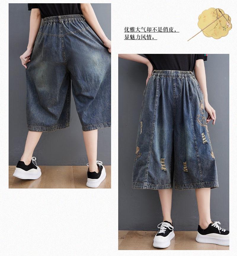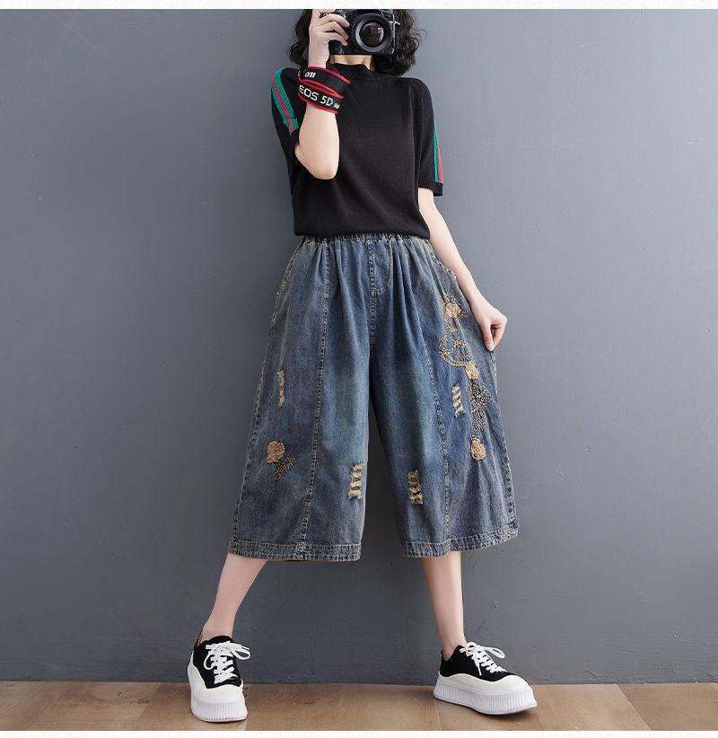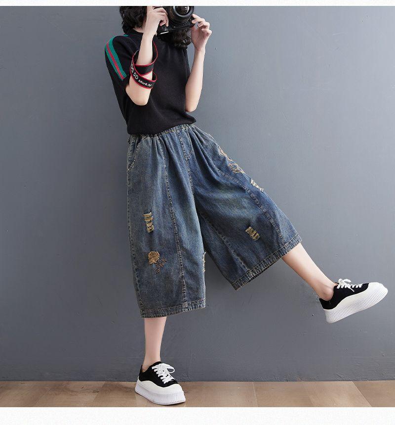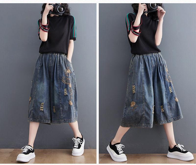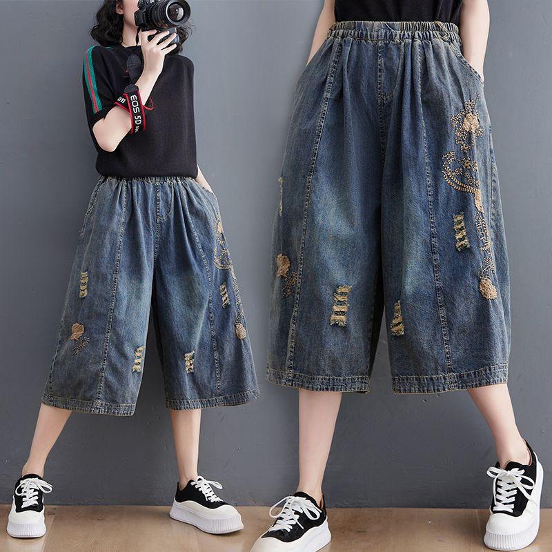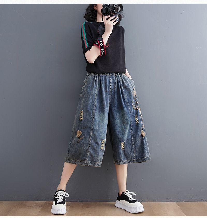 Pantalones vaqueros de pierna ancha de talla grande para mujer 2025 verano nueva llegada holgados de corte slim cintura elastoelástica agujeros bordados pantalones capri para mujer