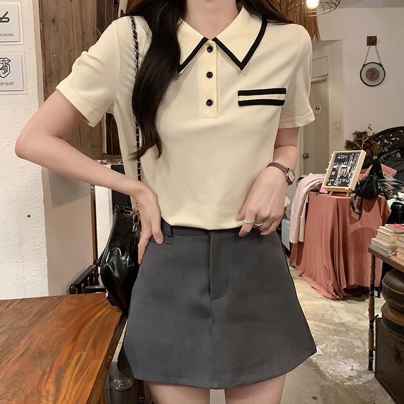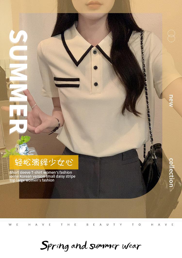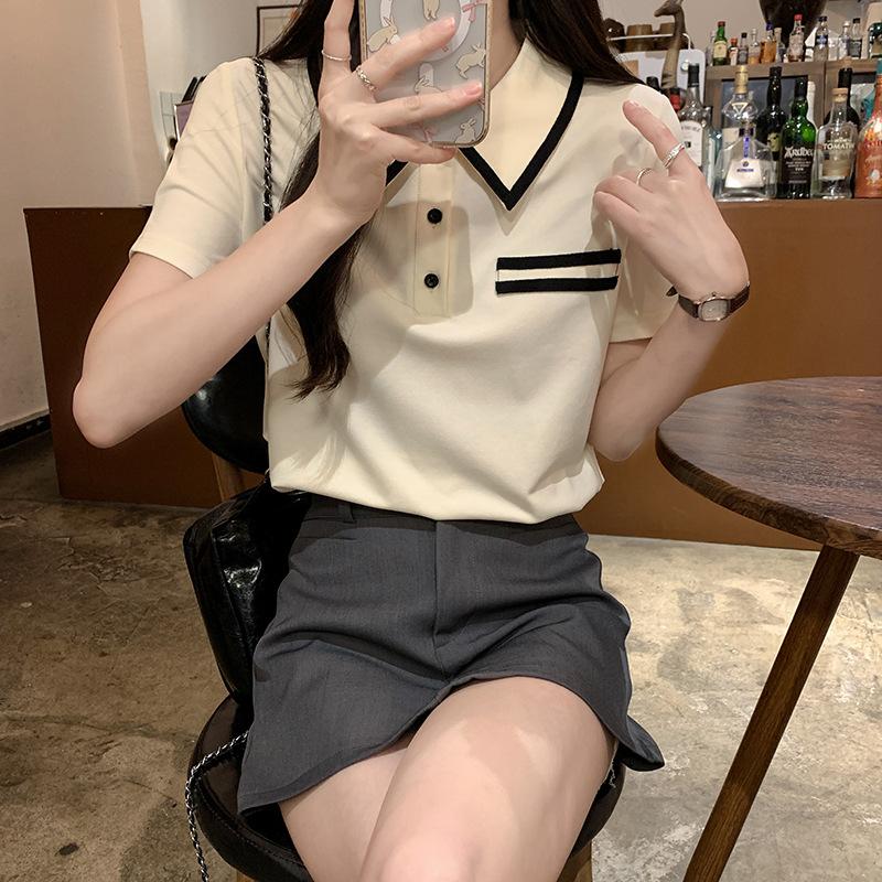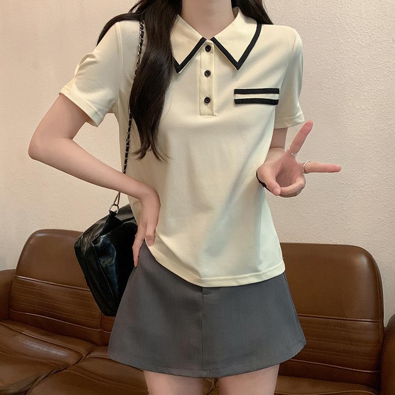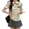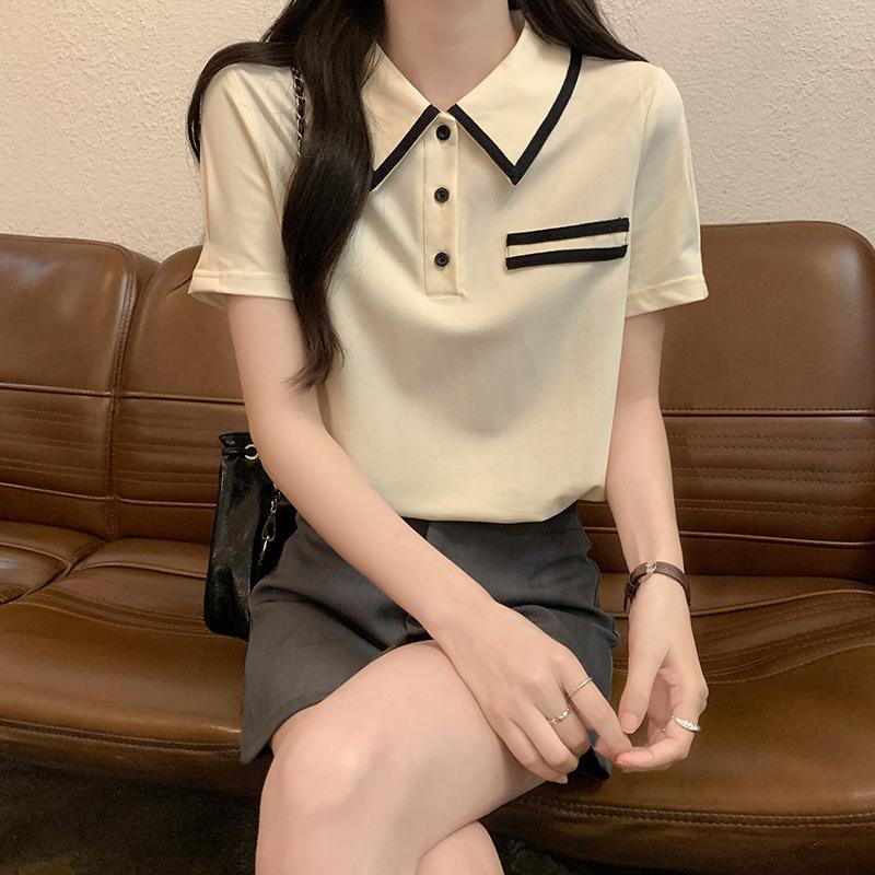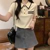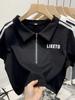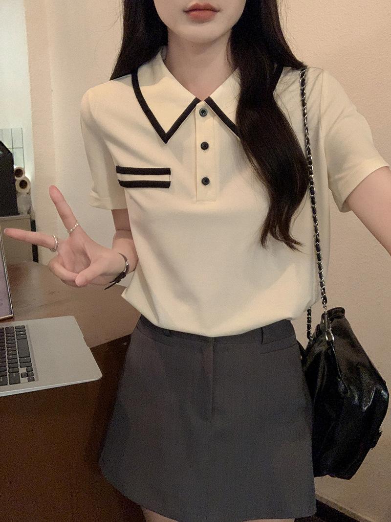Camiseta de Manga Corta con Cuello Polo para Mujer en Verano, Holgada y Ajustada, Camiseta con Diseño de Nicho en el Hombro Derecho, Top de Media Manga Estilo Occidental