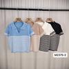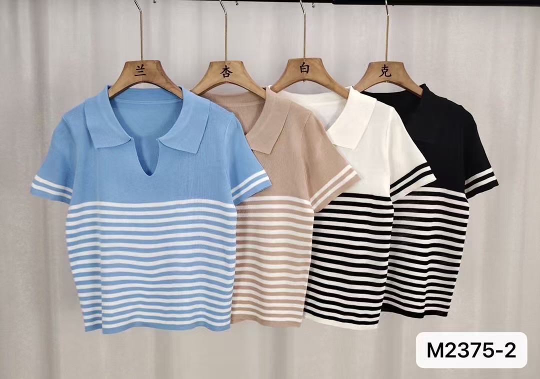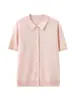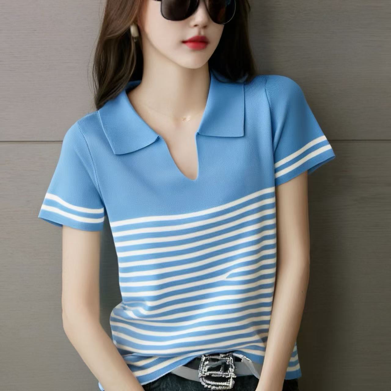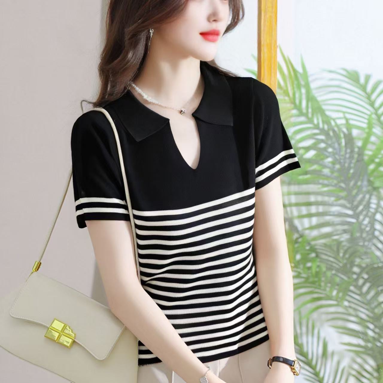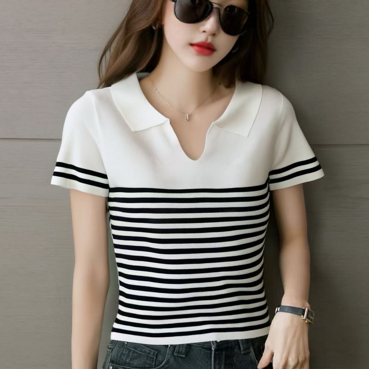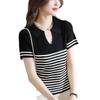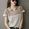 Playera de Punto de Manga Corta para Mujer con Solapa a Rayas, Verano Nuevo, Versátil, a la Moda, Adelgazante, Look Elegante Chic