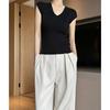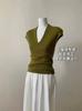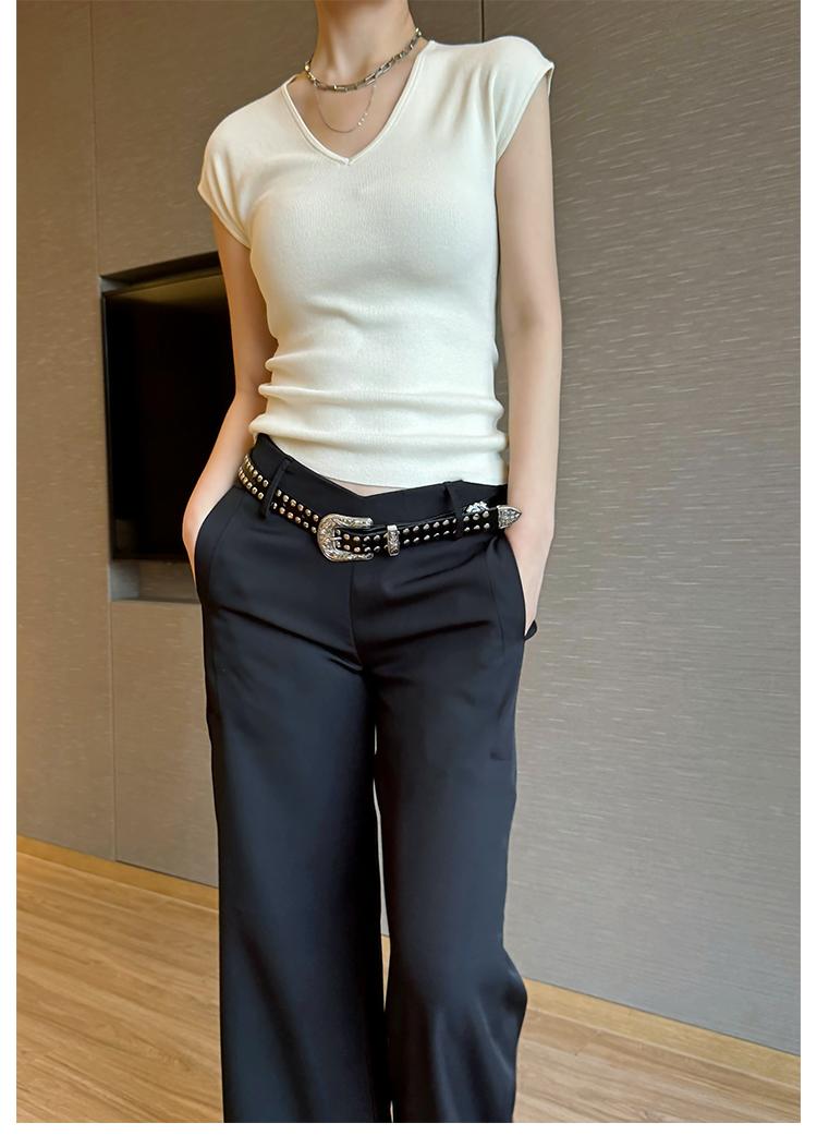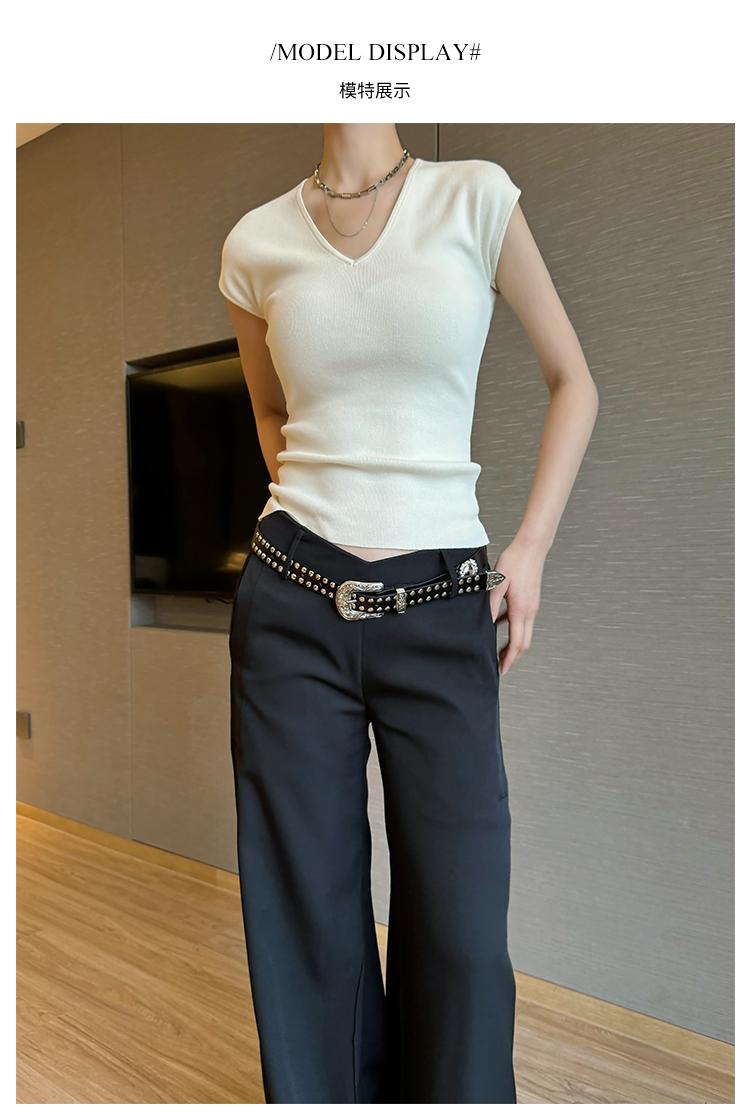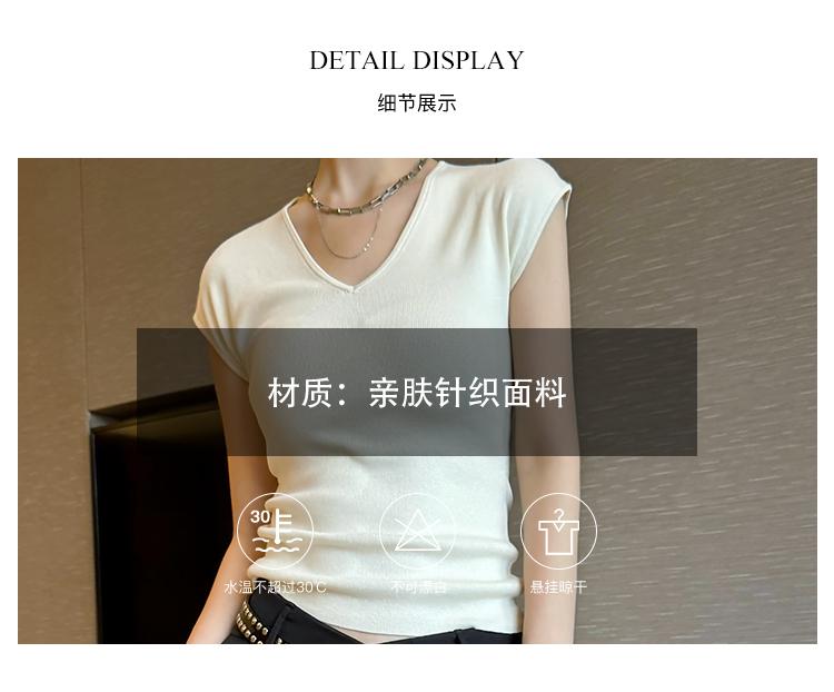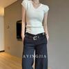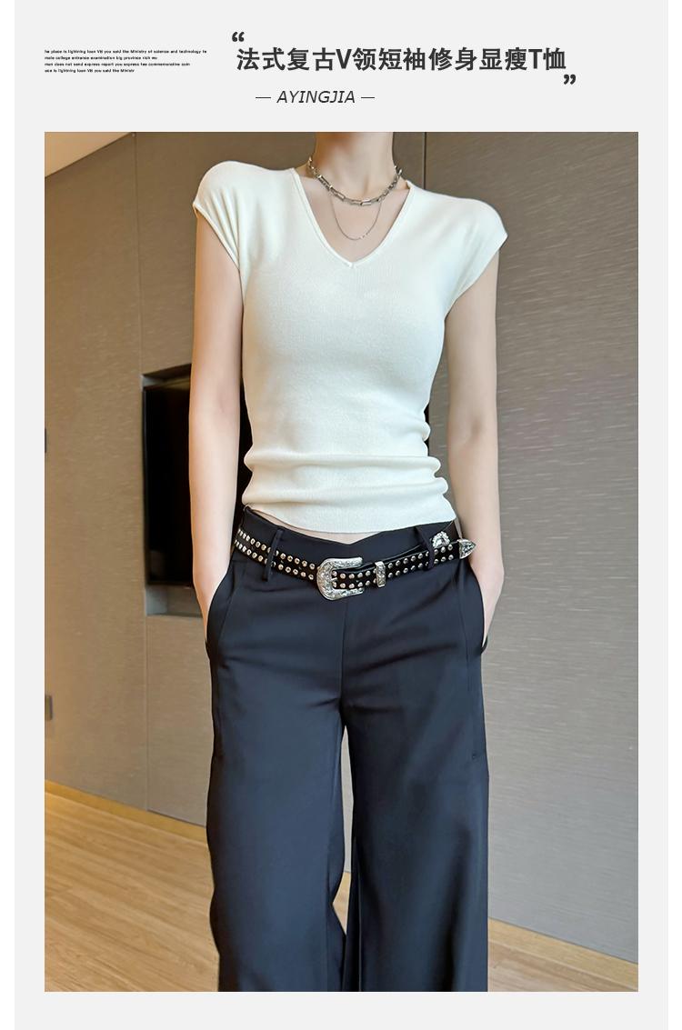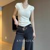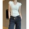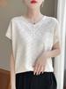 Camiseta de Mujer de Manga Corta con Cuello en V Primavera Hombro Derecho Corto Mangas Cortas Volantes Tejido de Punto de Seda de Hielo Top Fino para Fondo