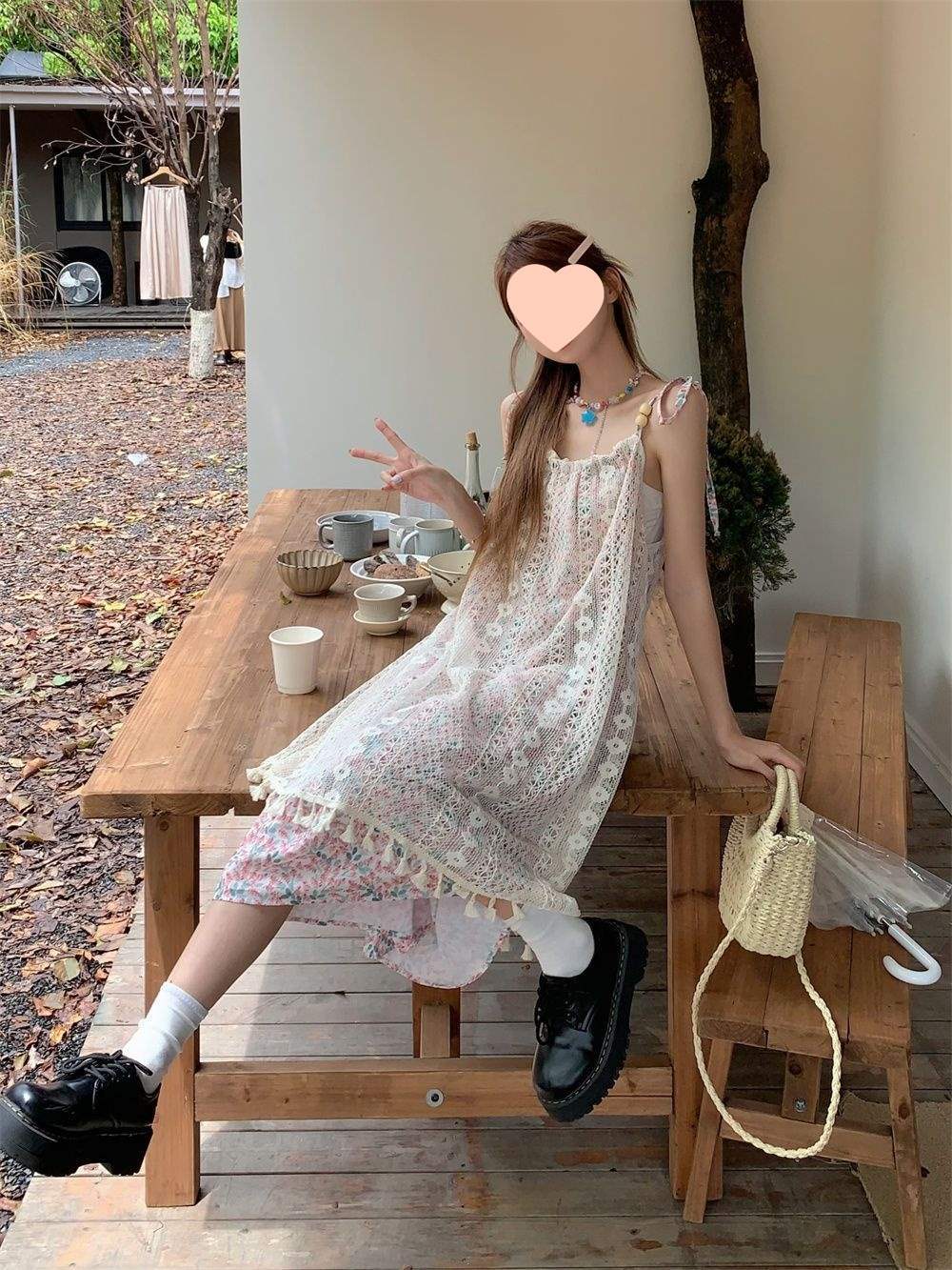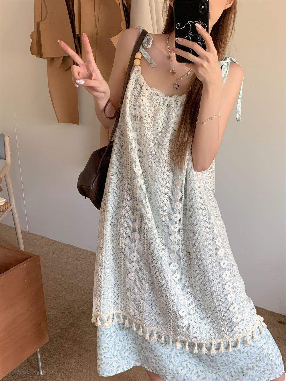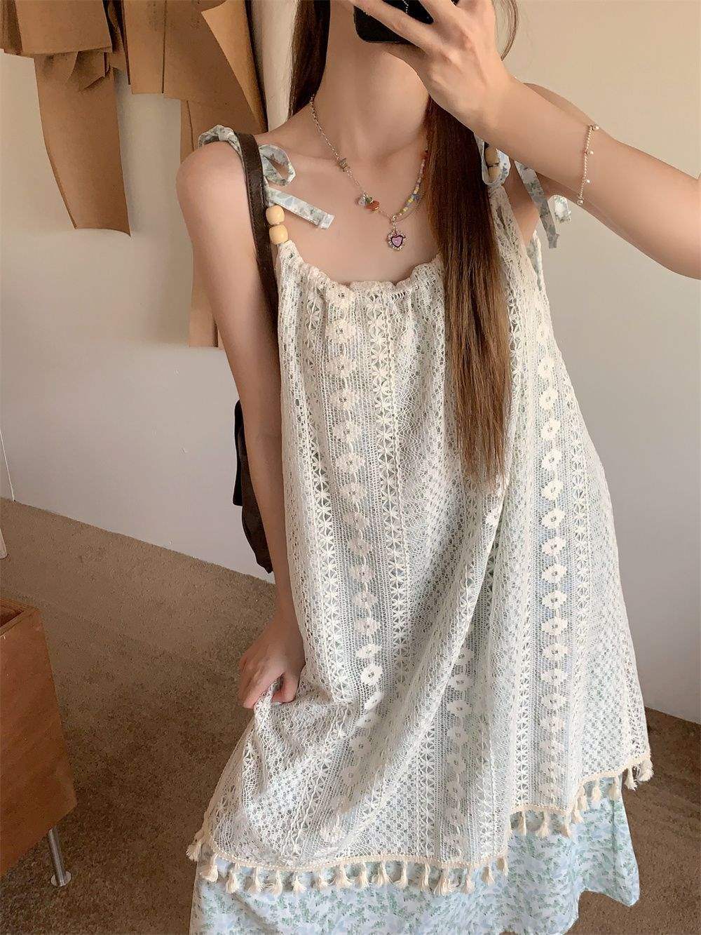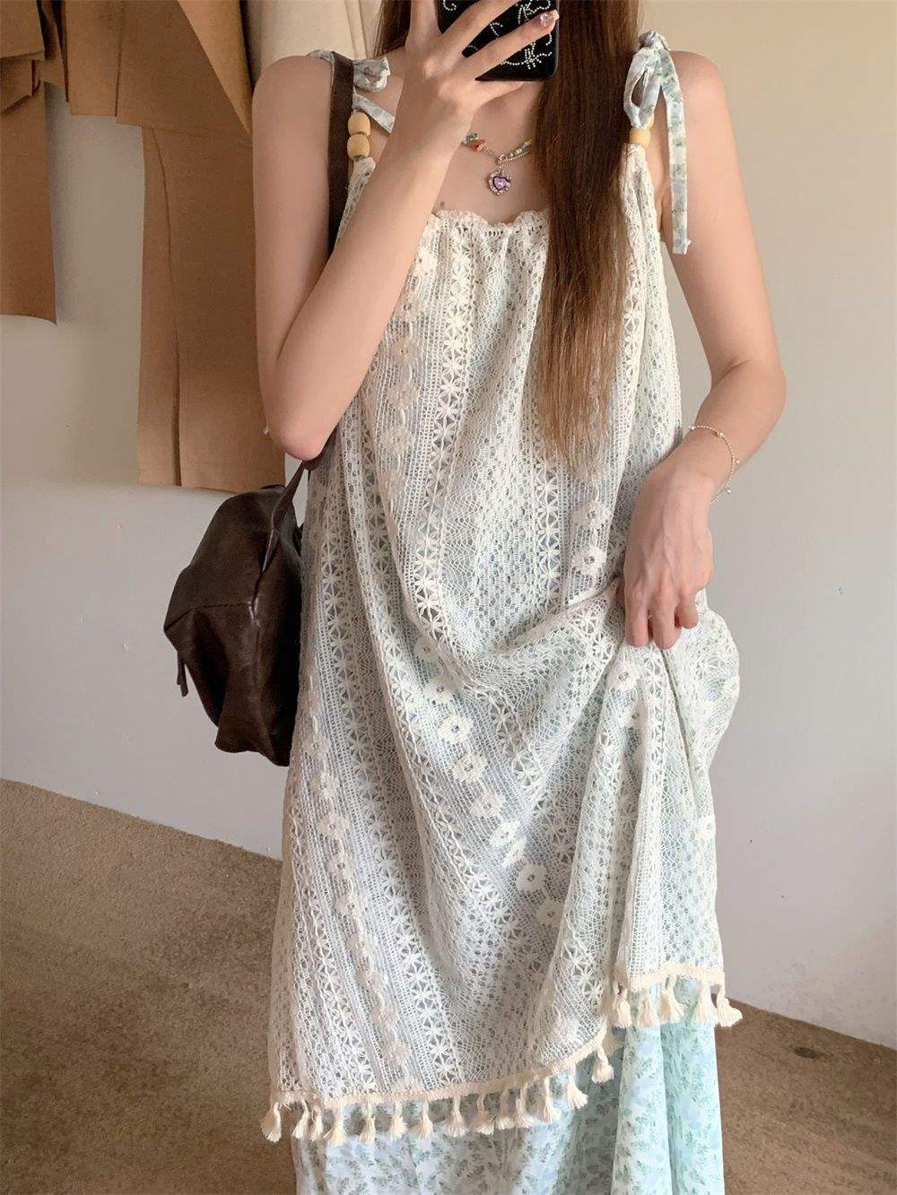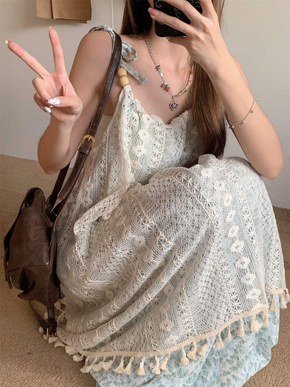 Encaje Dulce Retro Floral Falda de Tirantes Encaje Calado Borla Falda Larga Vacaciones en la Playa Temperamento Vestido de Tirantes