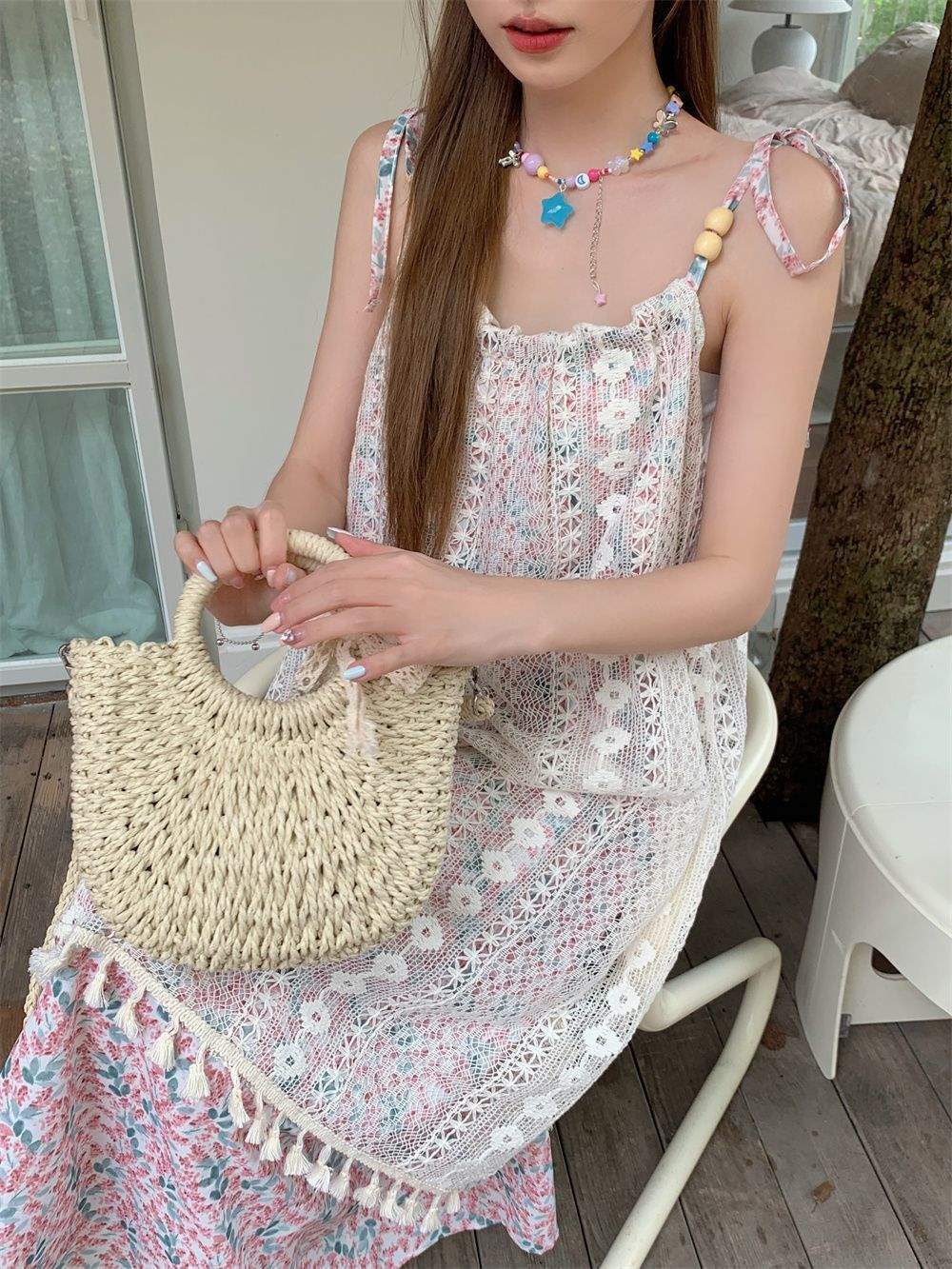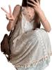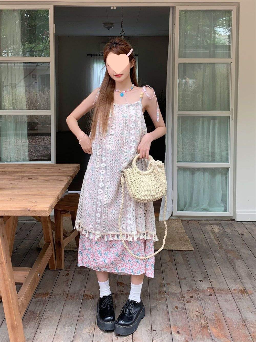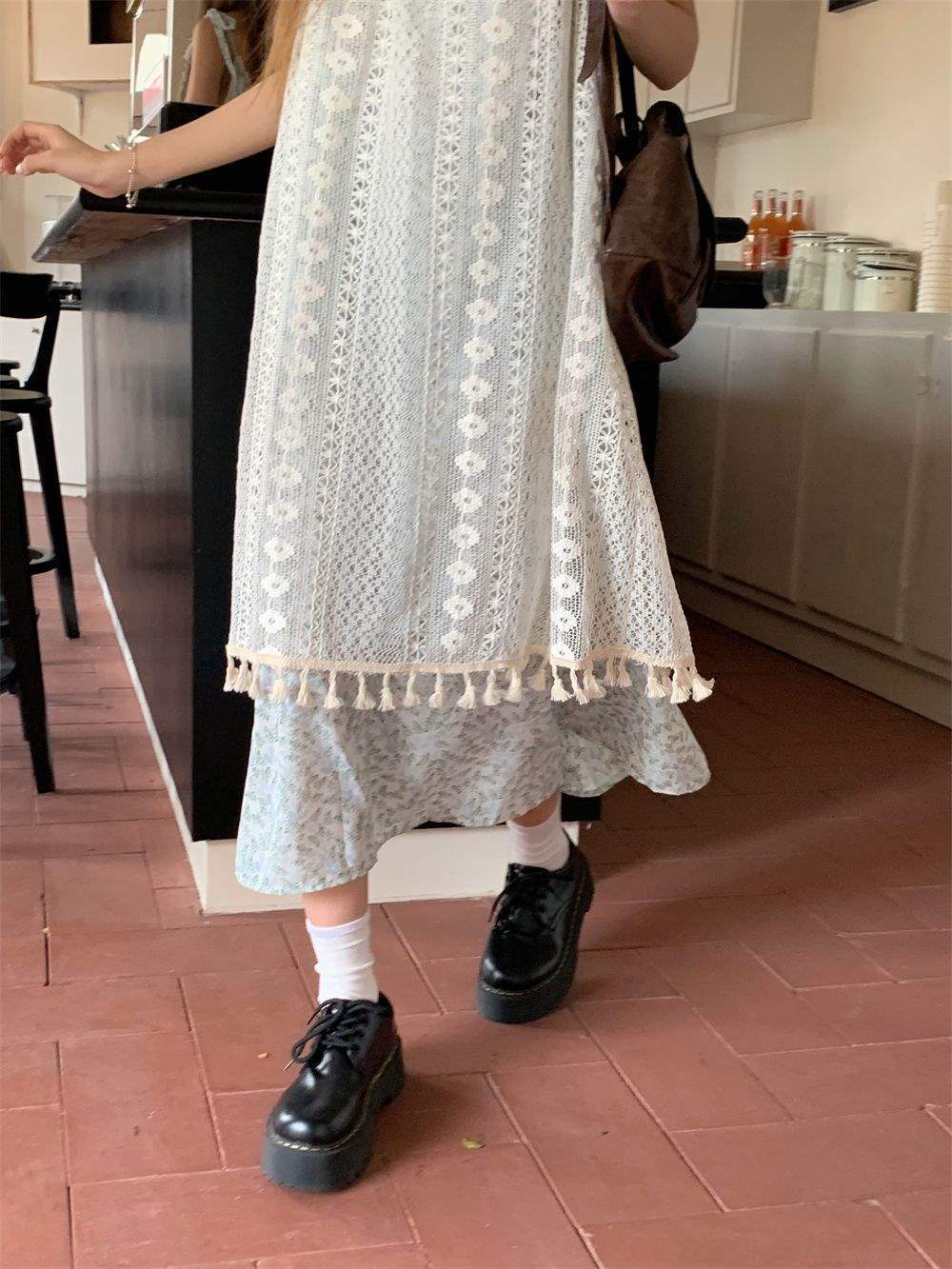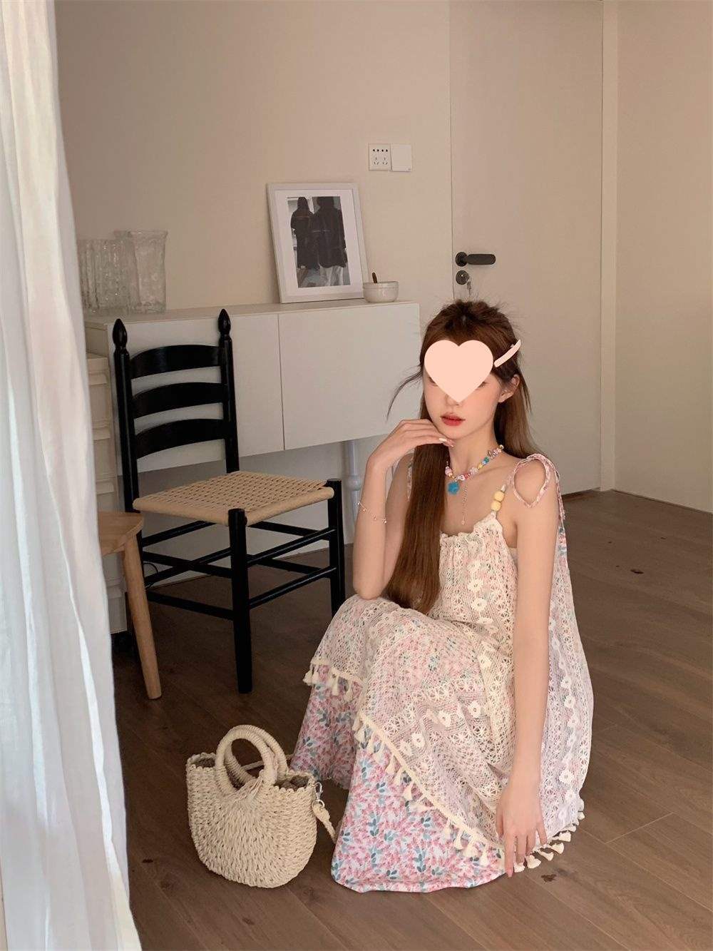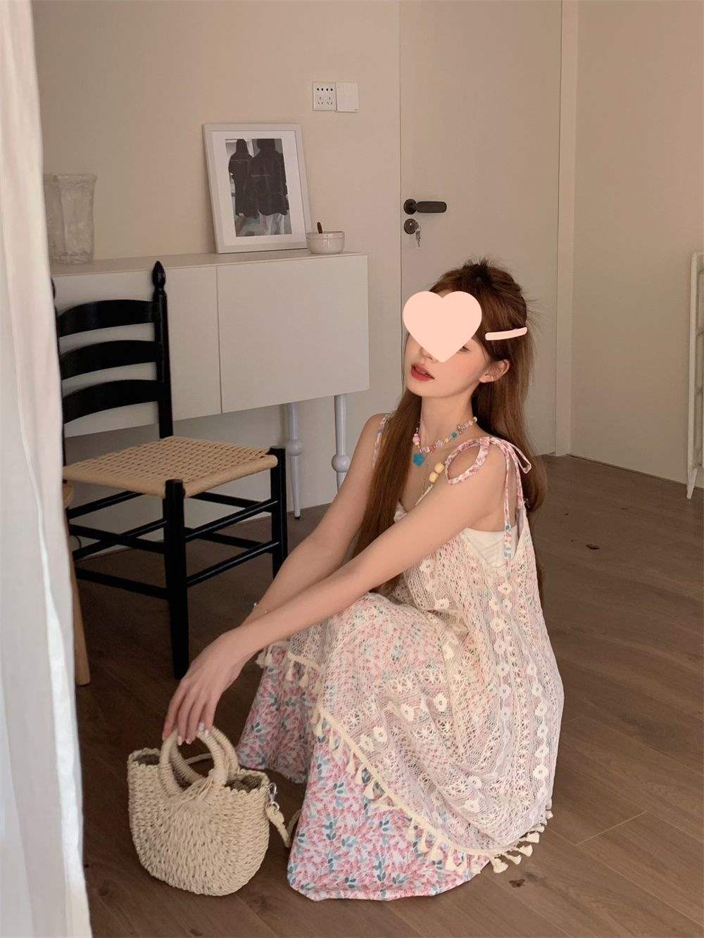 Encaje Dulce Retro Floral Falda de Tirantes Encaje Calado Borla Falda Larga Vacaciones en la Playa Temperamento Vestido de Tirantes