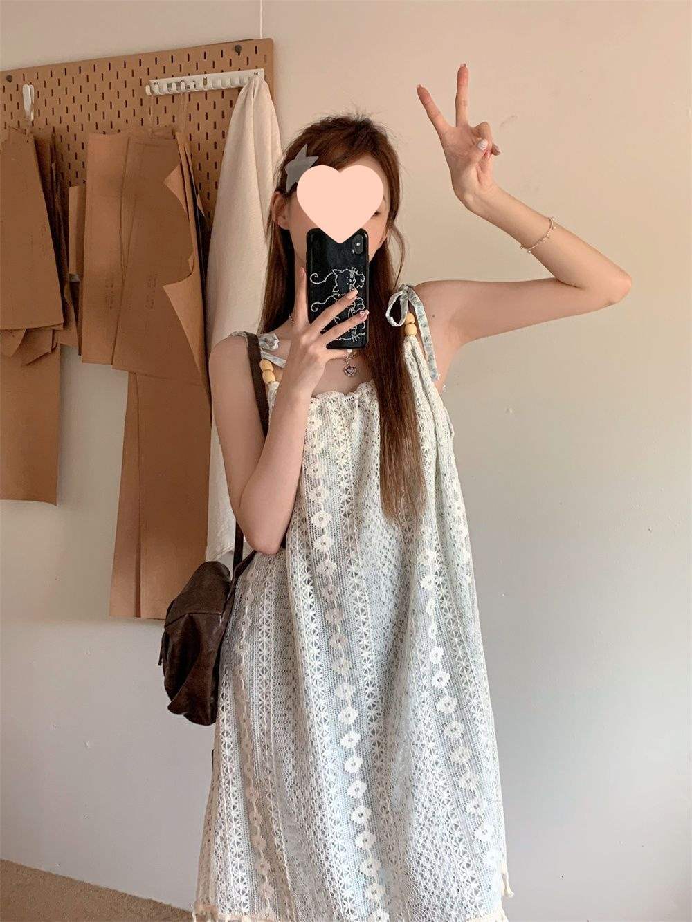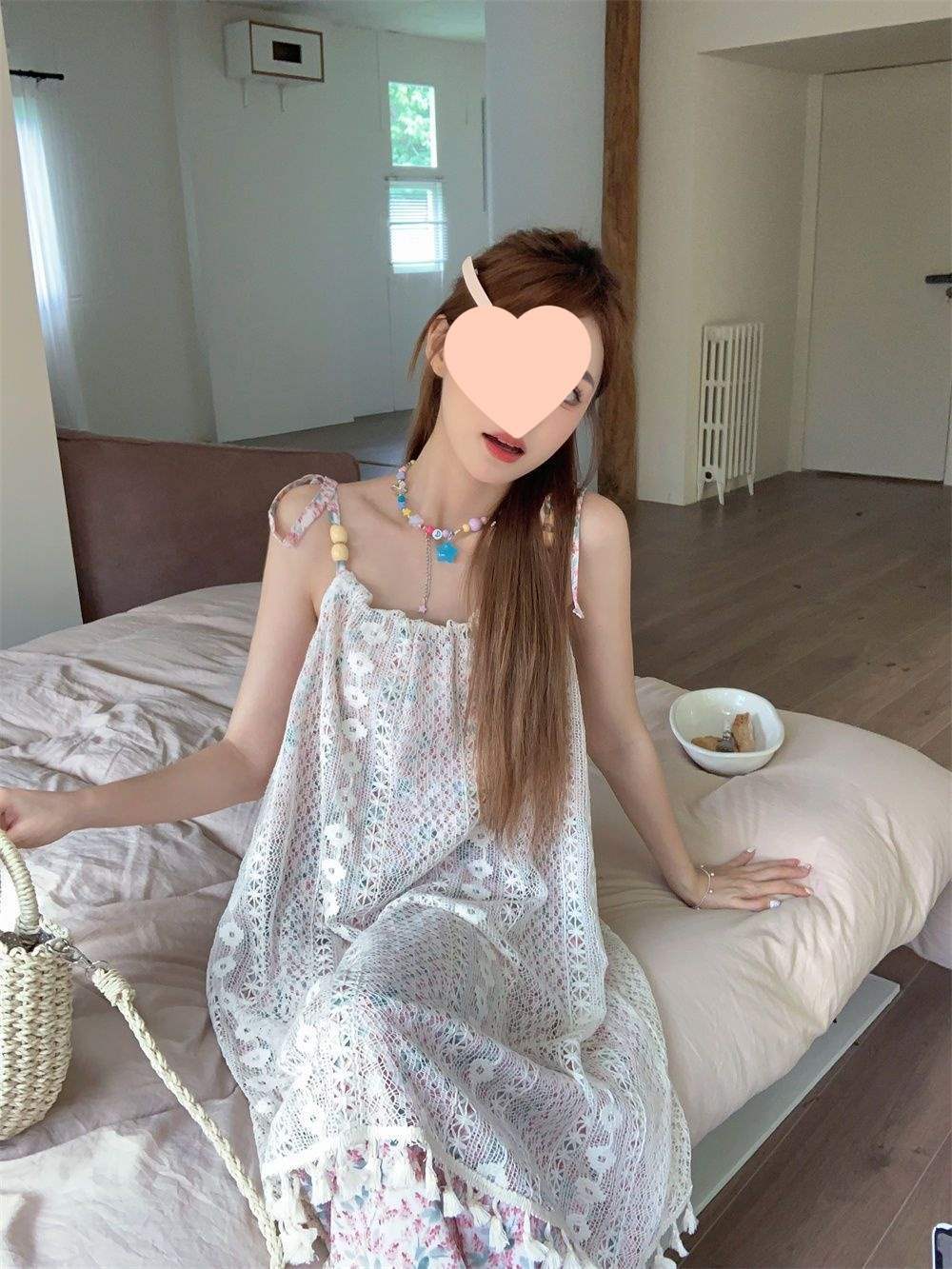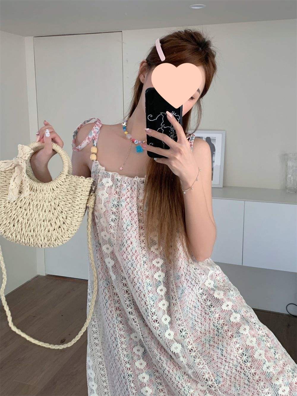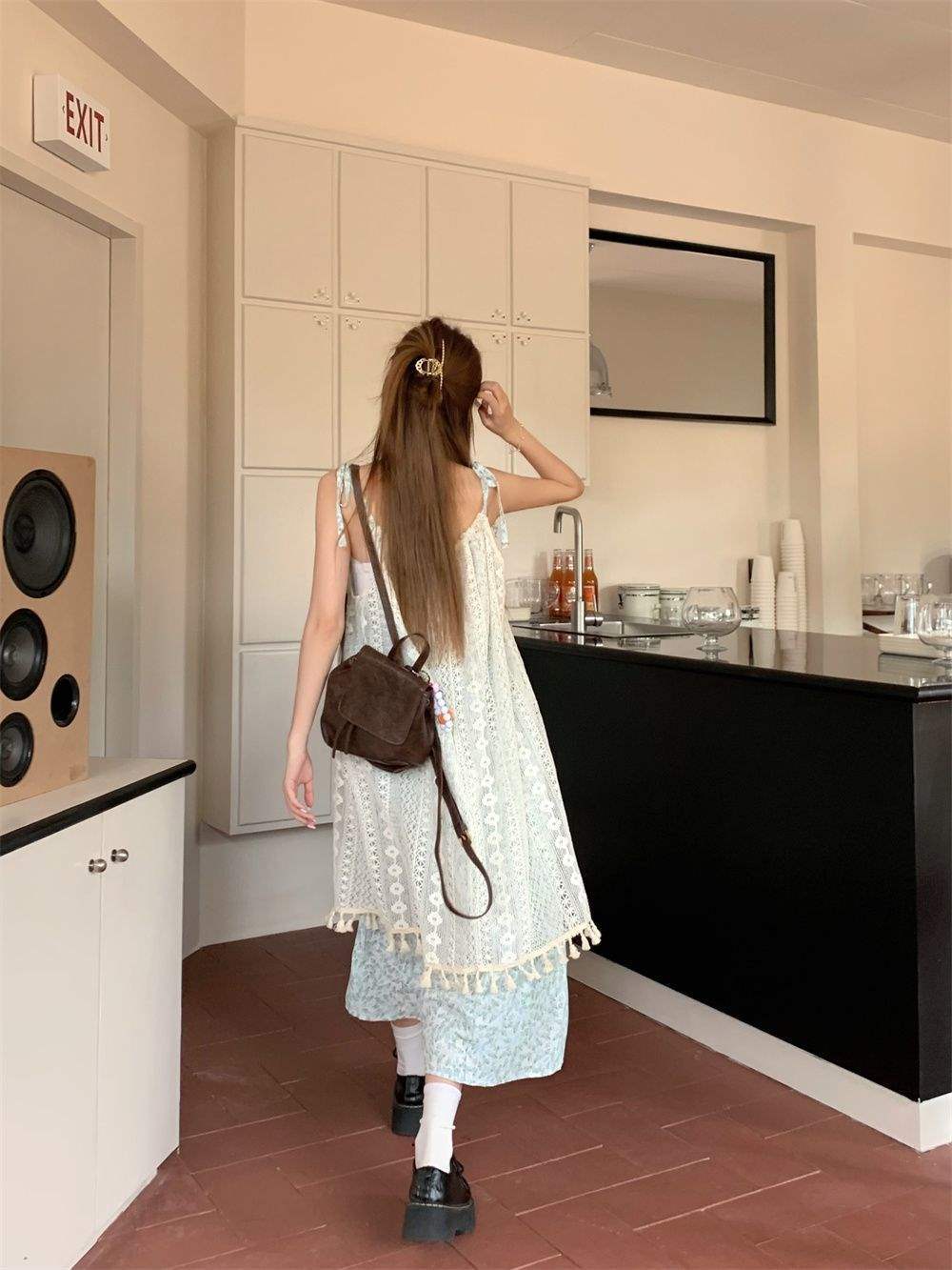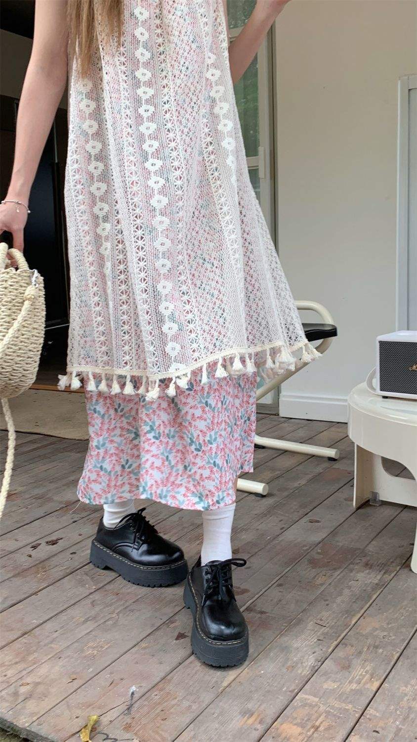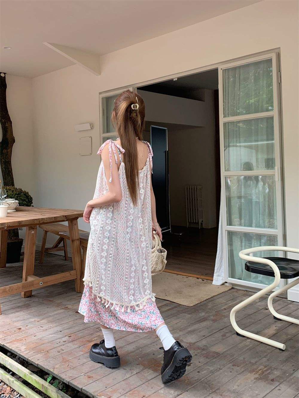 Encaje Dulce Retro Floral Falda de Tirantes Encaje Calado Borla Falda Larga Vacaciones en la Playa Temperamento Vestido de Tirantes