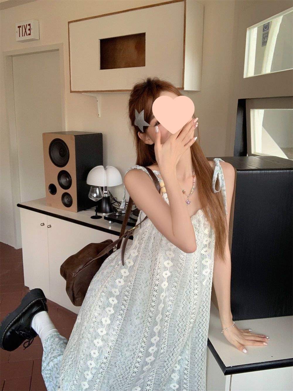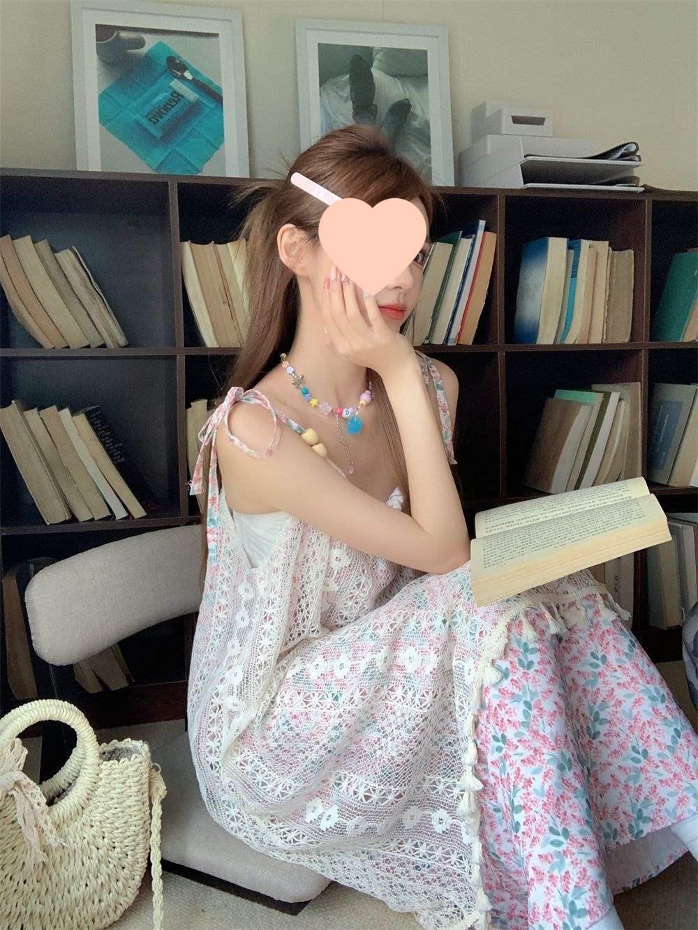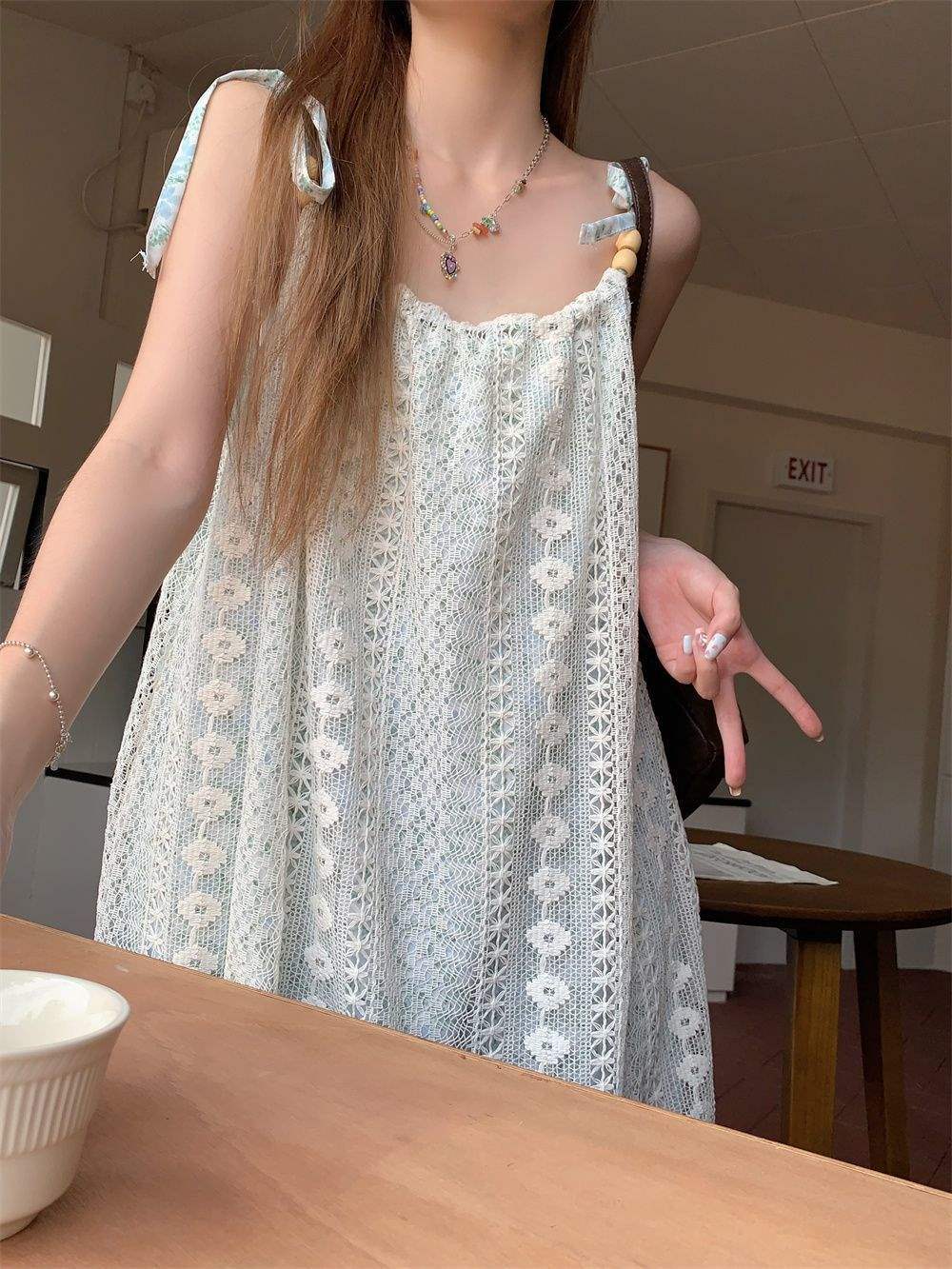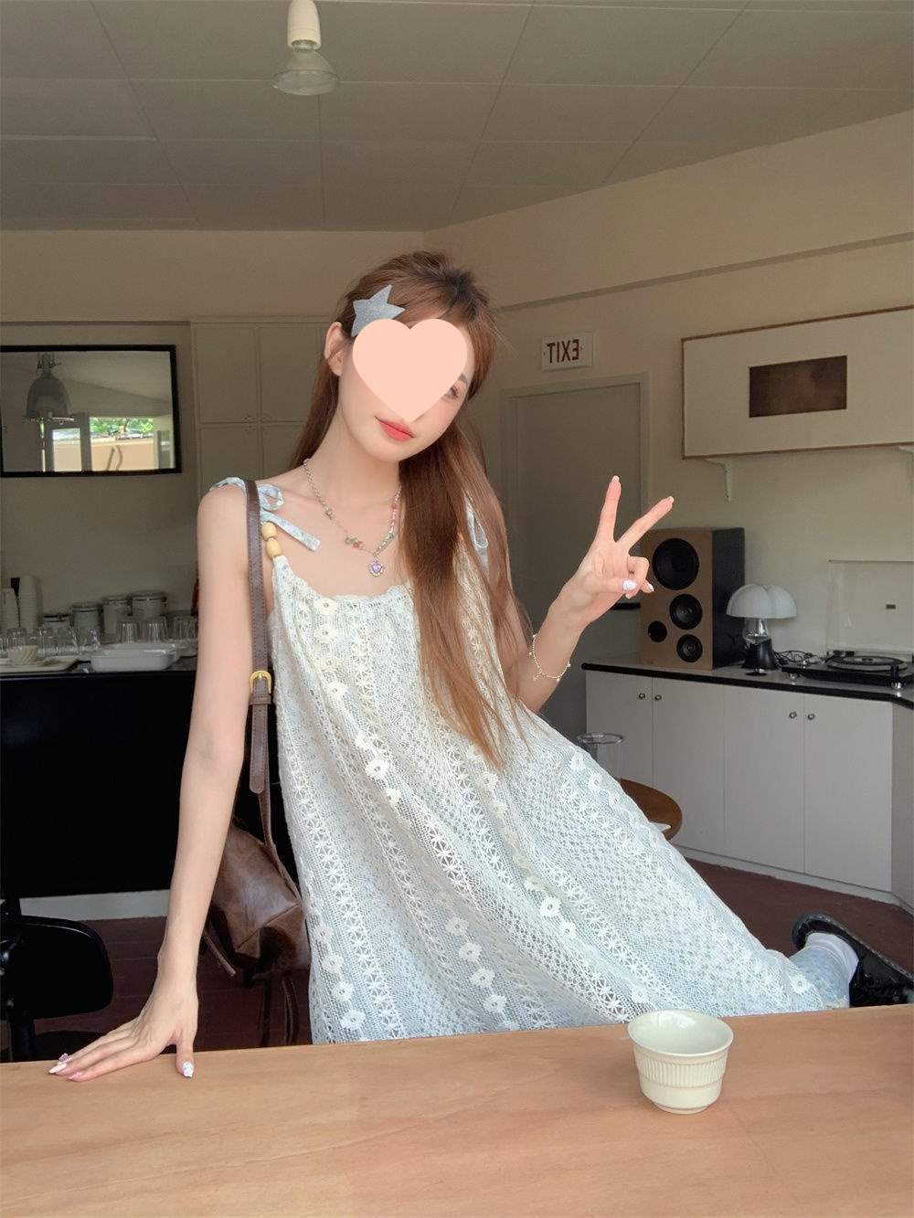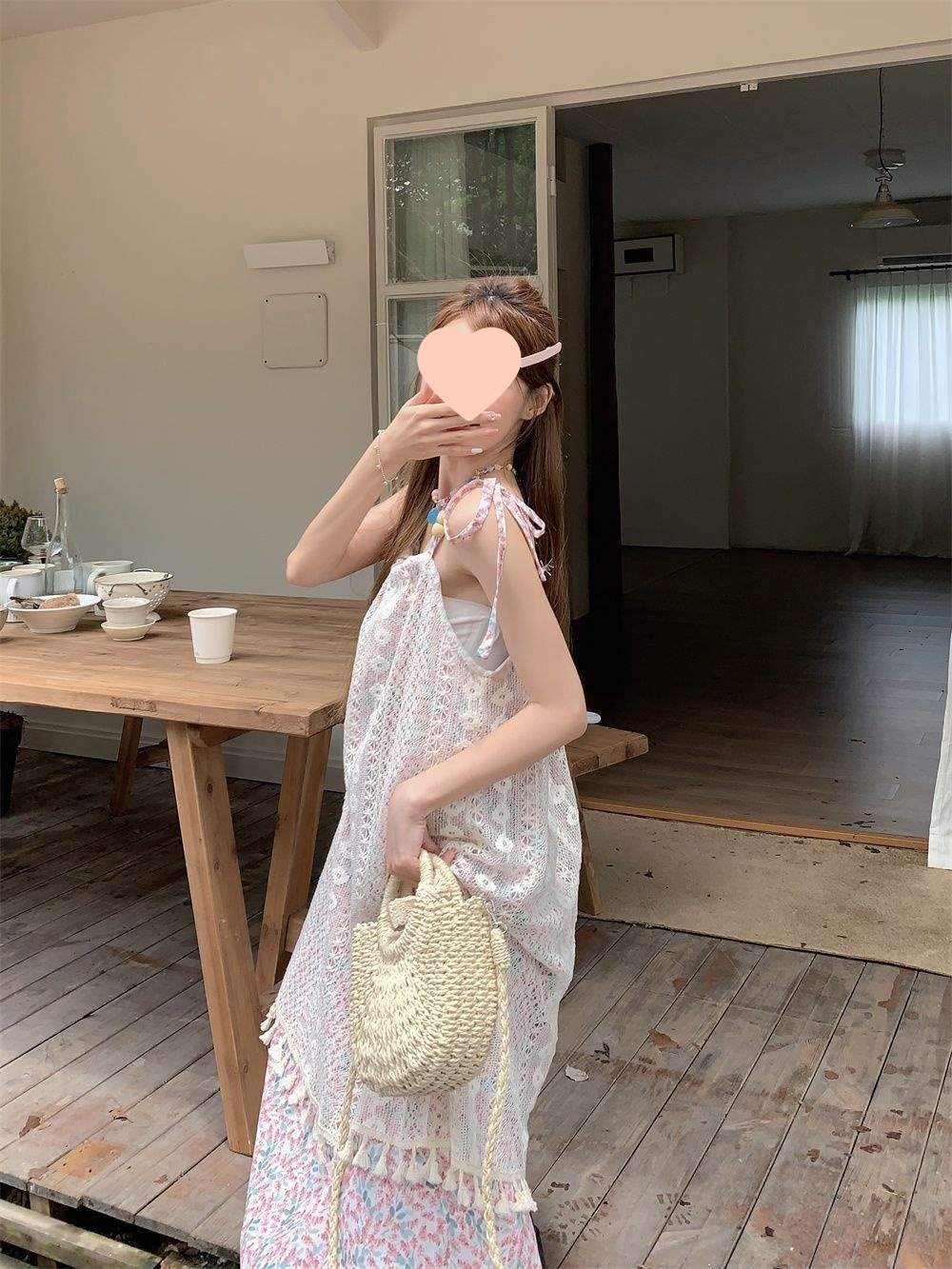 Encaje Dulce Retro Floral Falda de Tirantes Encaje Calado Borla Falda Larga Vacaciones en la Playa Temperamento Vestido de Tirantes