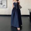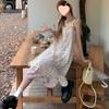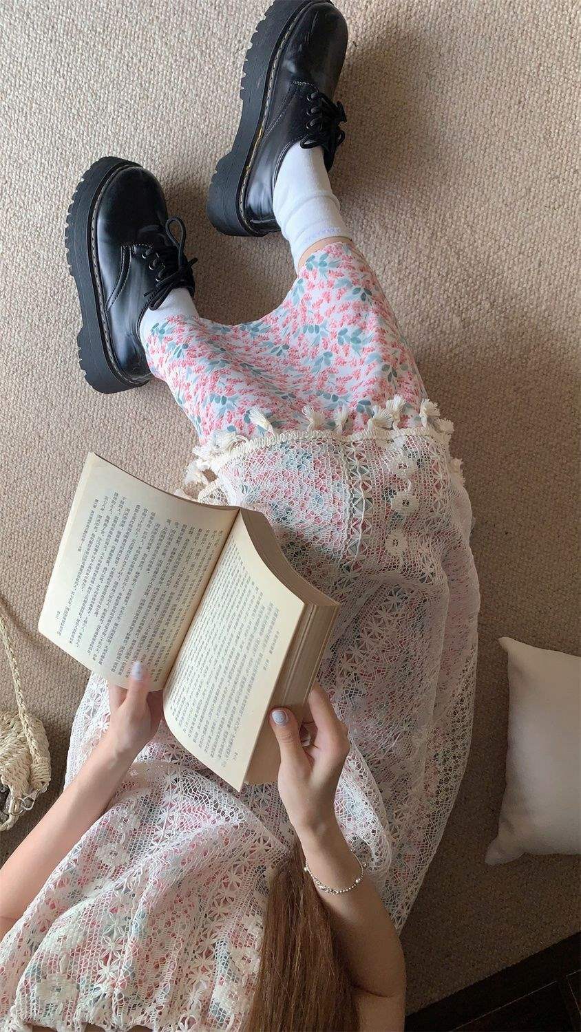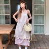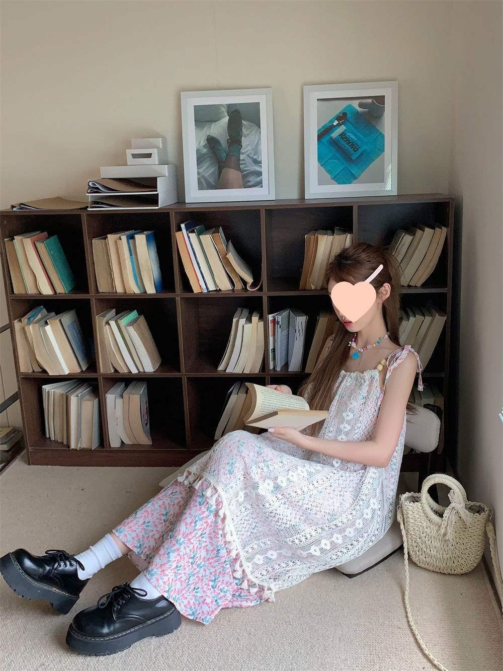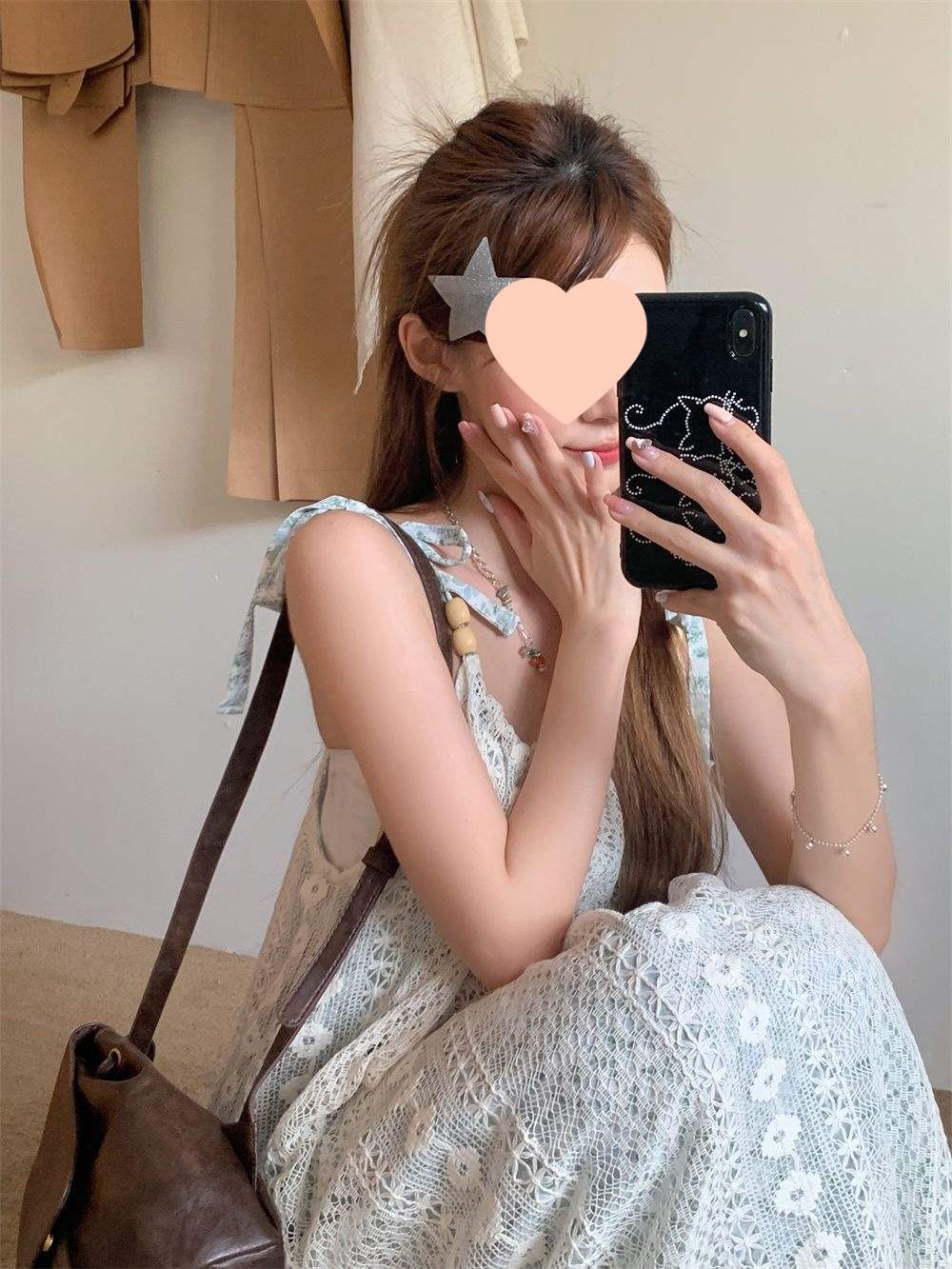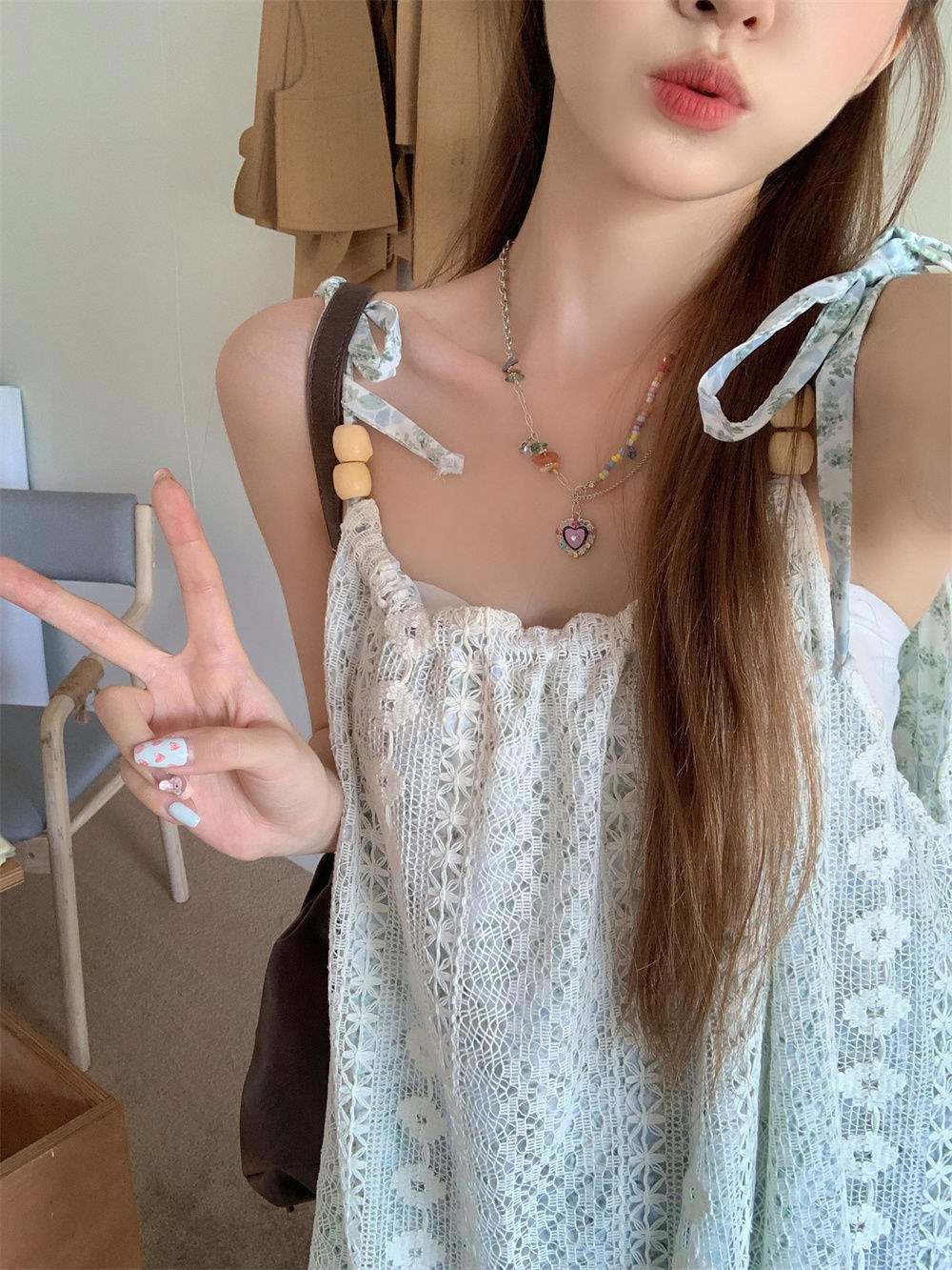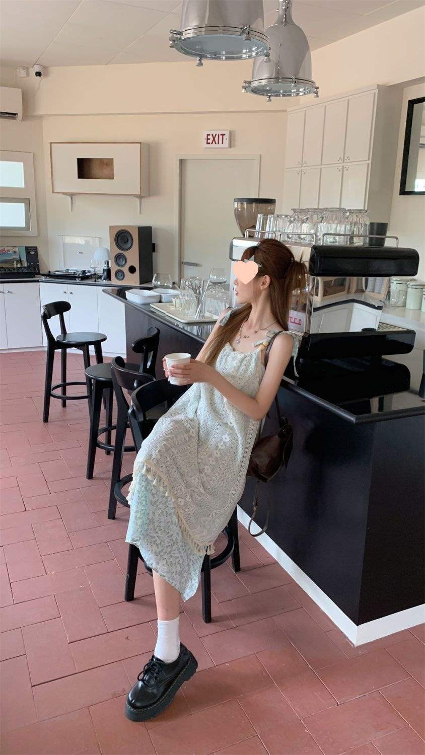 Encaje Dulce Retro Floral Falda de Tirantes Encaje Calado Borla Falda Larga Vacaciones en la Playa Temperamento Vestido de Tirantes