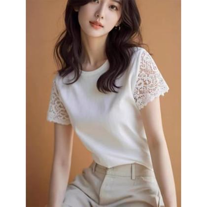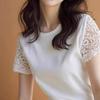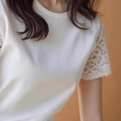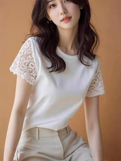 Camiseta Blanca de Manga Corta para Mujer 2025 Nuevo Verano Sentido del Diseño Hermosa Elegante Encaje Costuras Top
