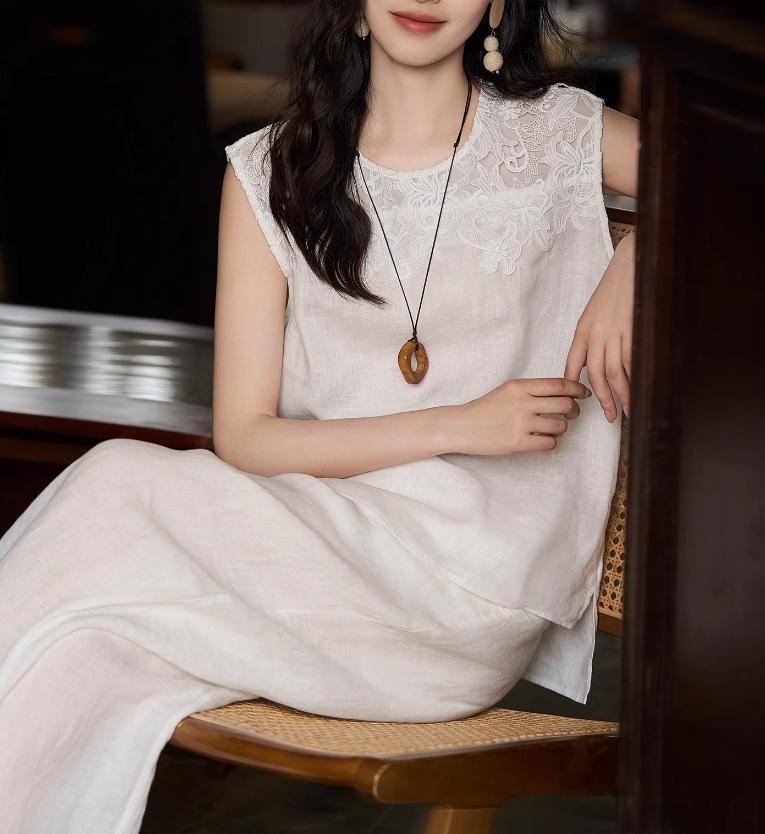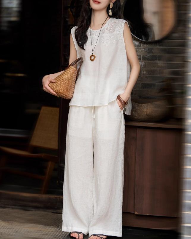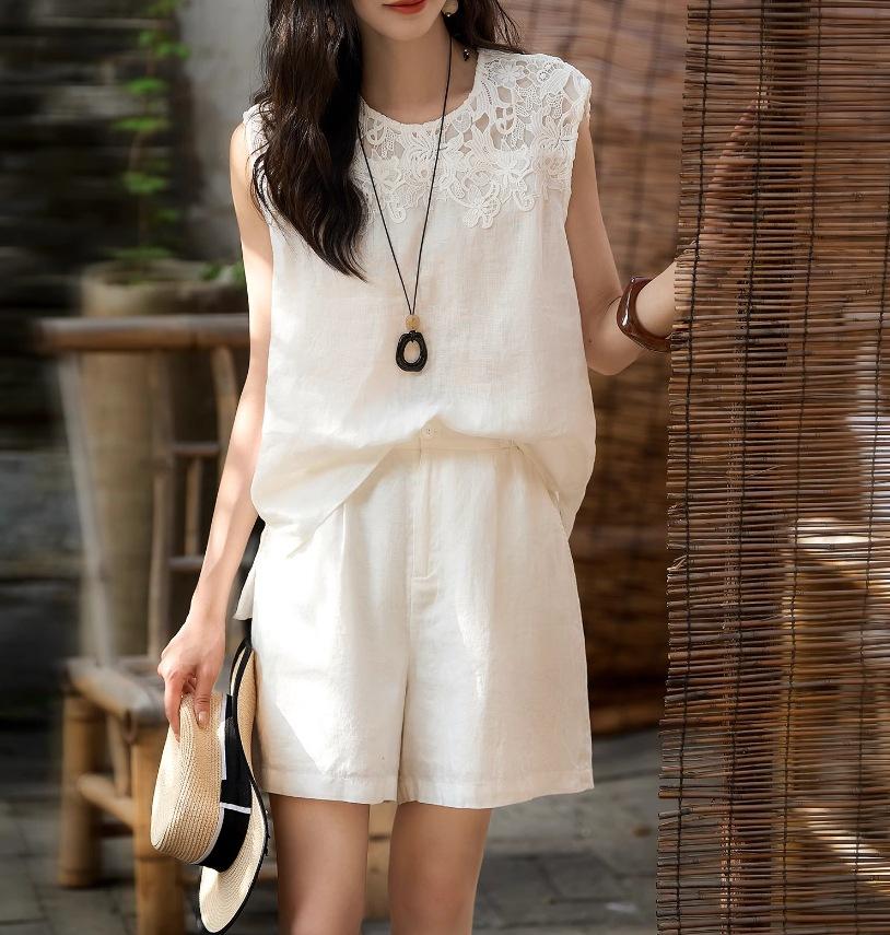 Verano 2025 Nuevo Estilo Traje Artístico Liso y Elegante Top Simple Transpirable sin Mangas/Shorts/Pantalones para Mujer