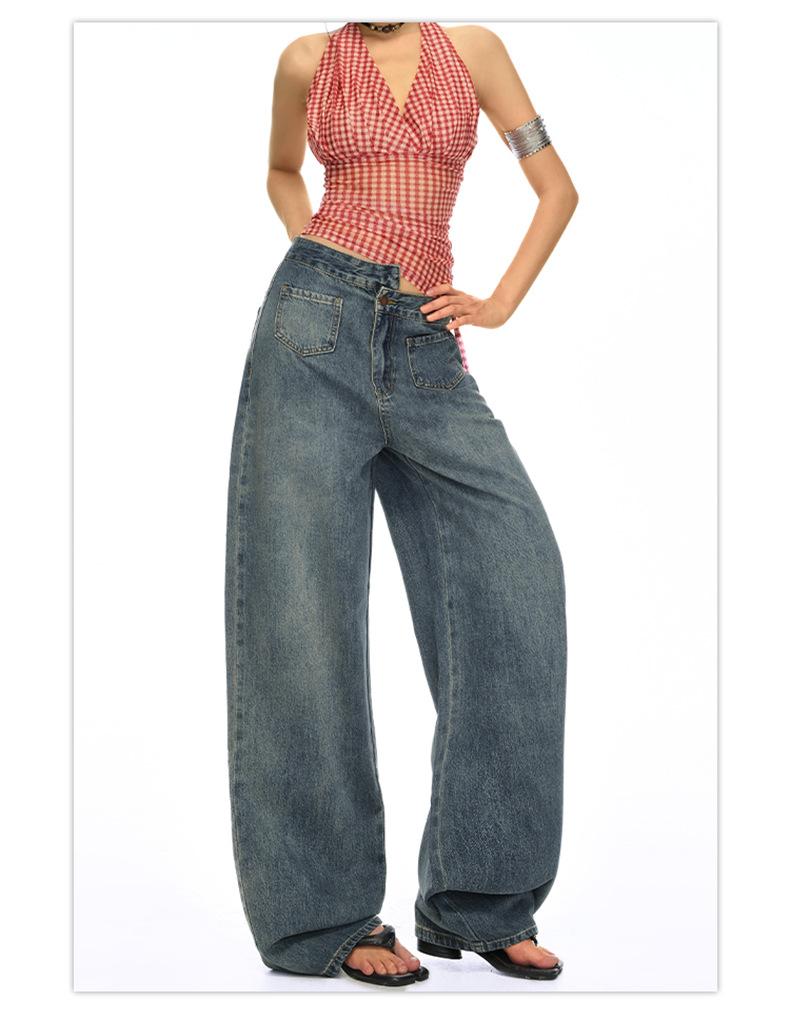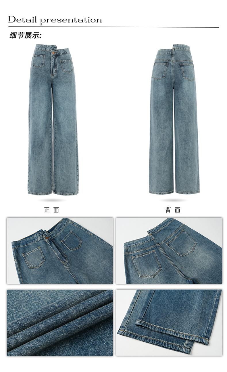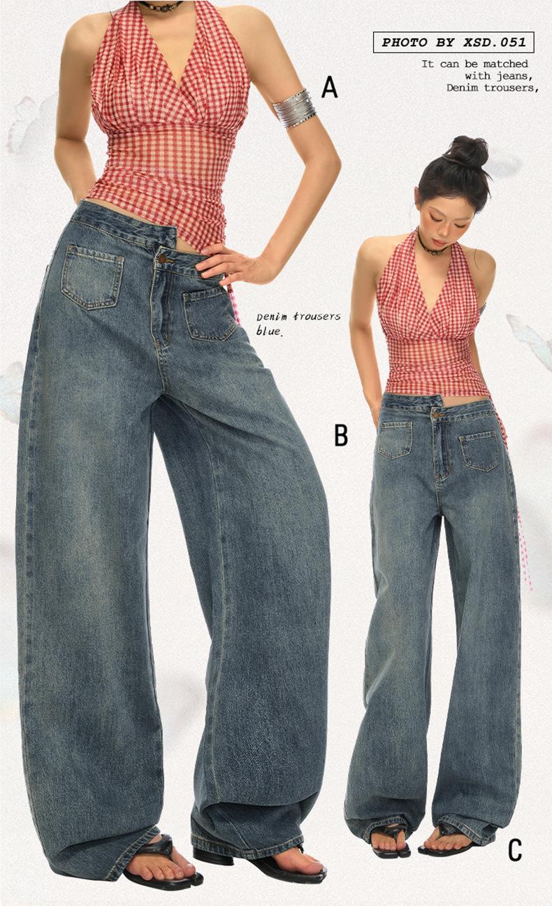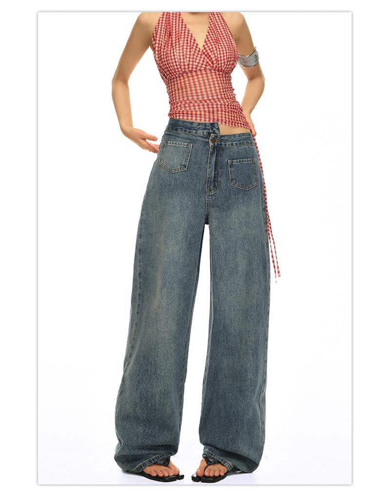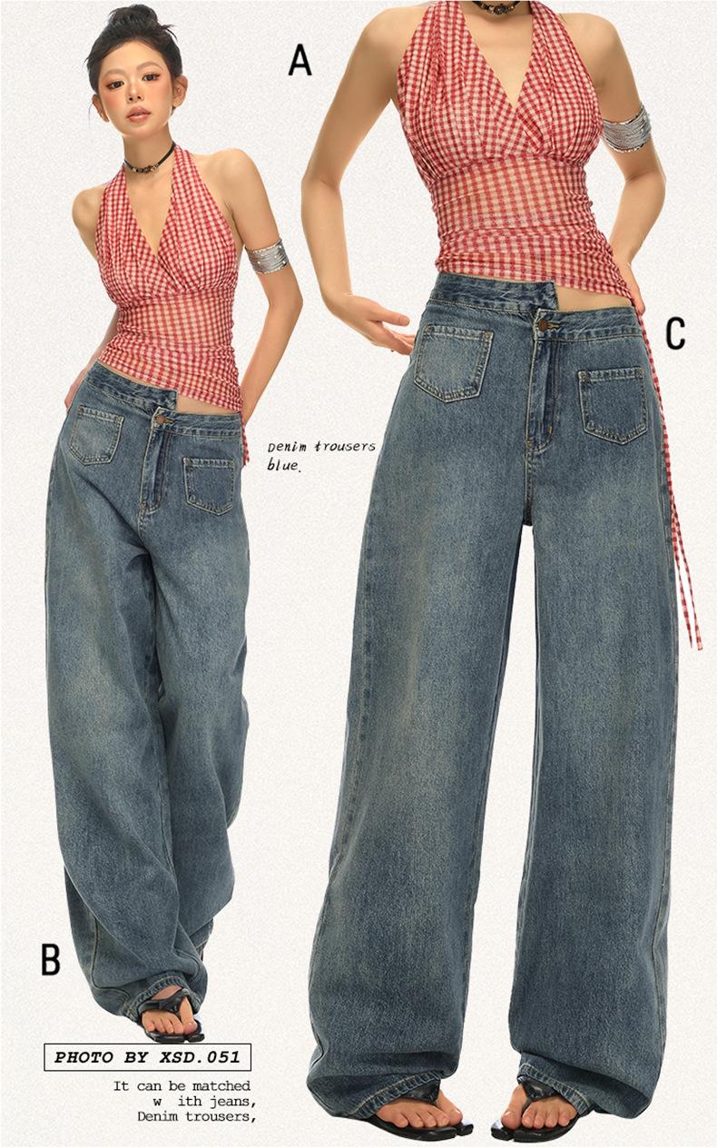 Ropa de Mujer de Seda Naranja # Jeans Vintage Azules de Cintura Alta y Pierna Recta para Mujer Verano Nuevo Diseño Asimétrico Pantalones Anchos de Pierna Suelta
