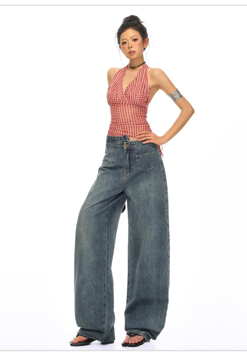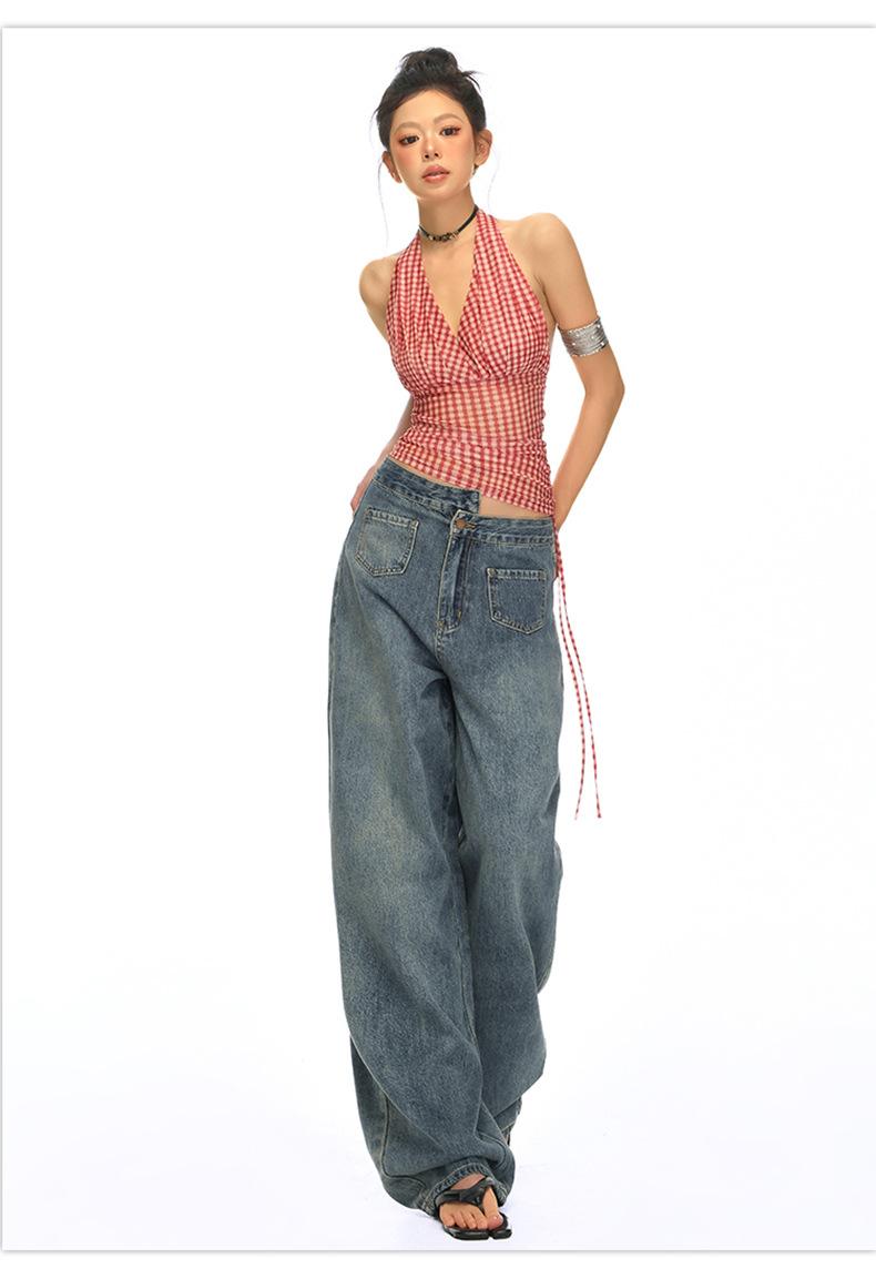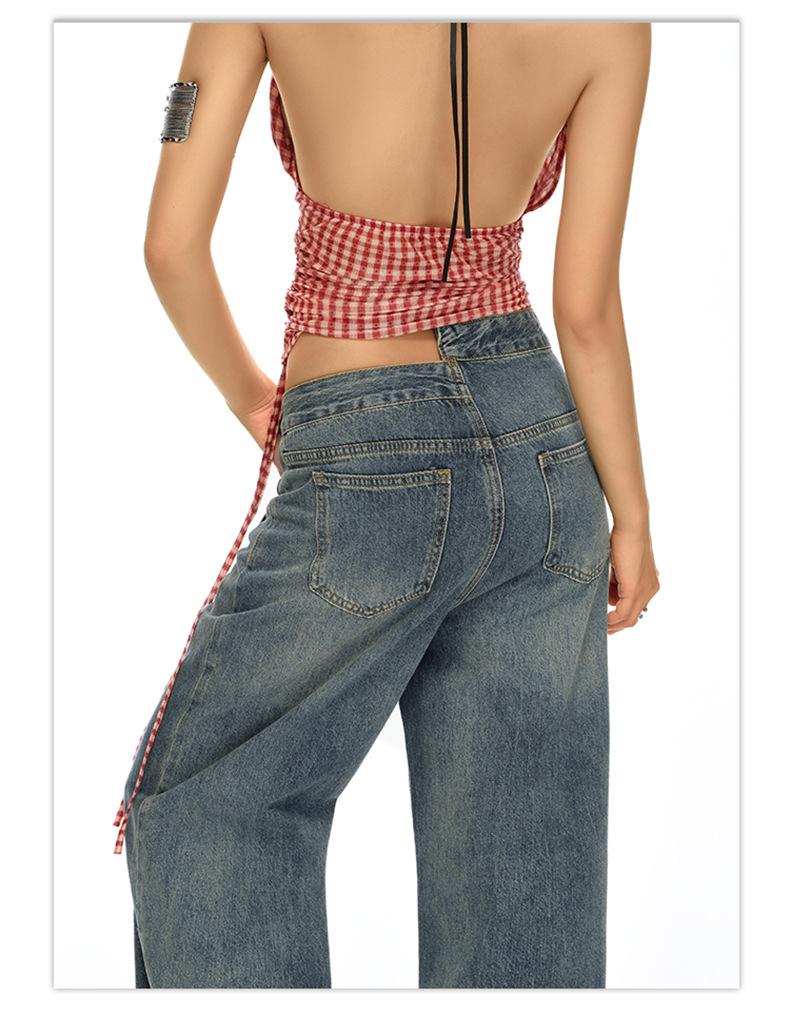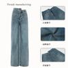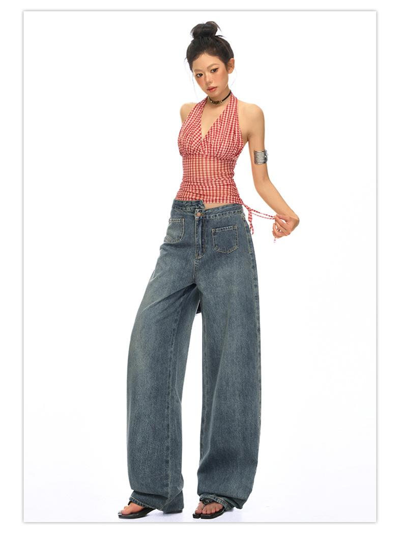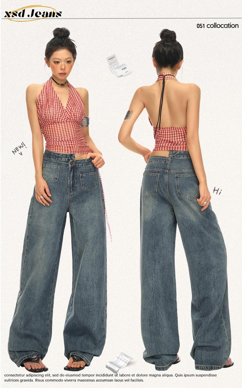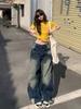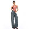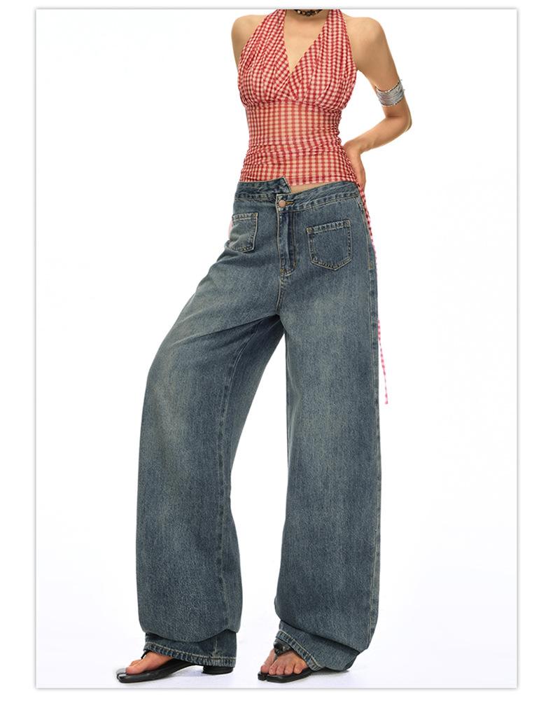 Ropa de Mujer de Seda Naranja # Jeans Vintage Azules de Cintura Alta y Pierna Recta para Mujer Verano Nuevo Diseño Asimétrico Pantalones Anchos de Pierna Suelta